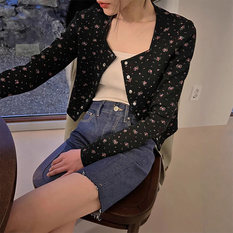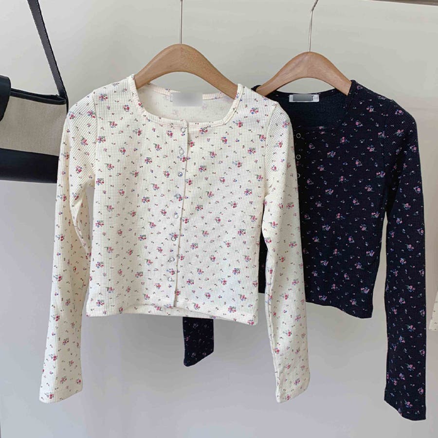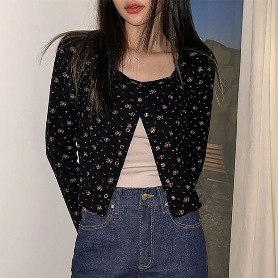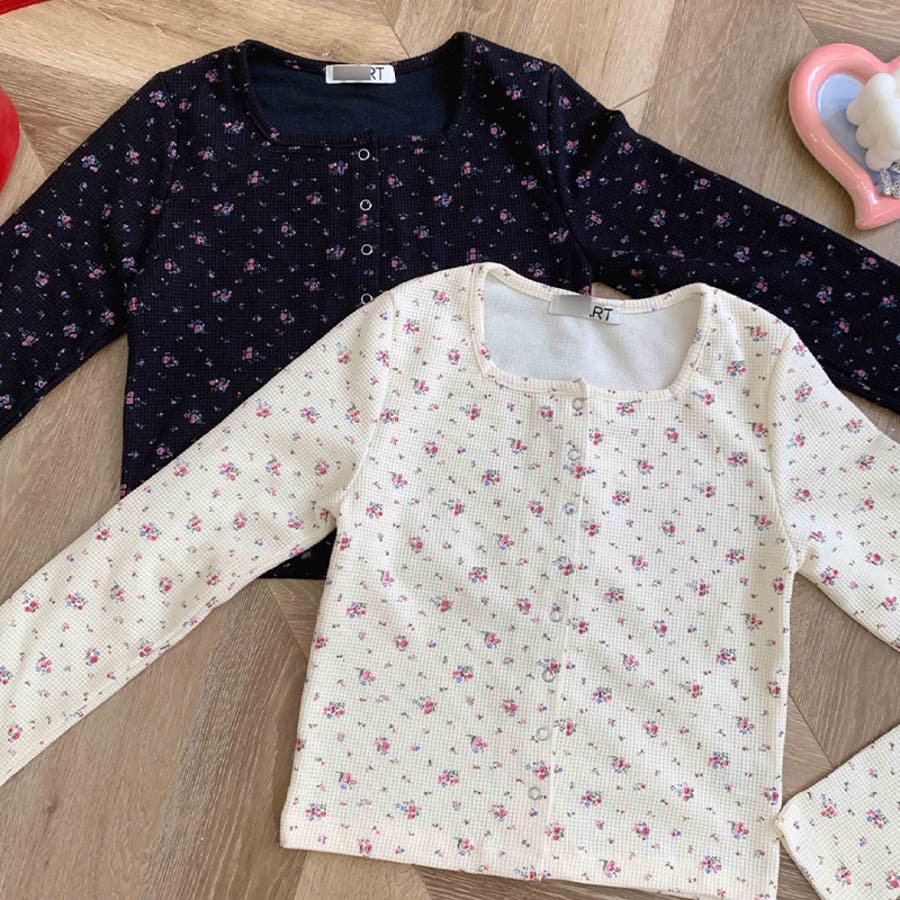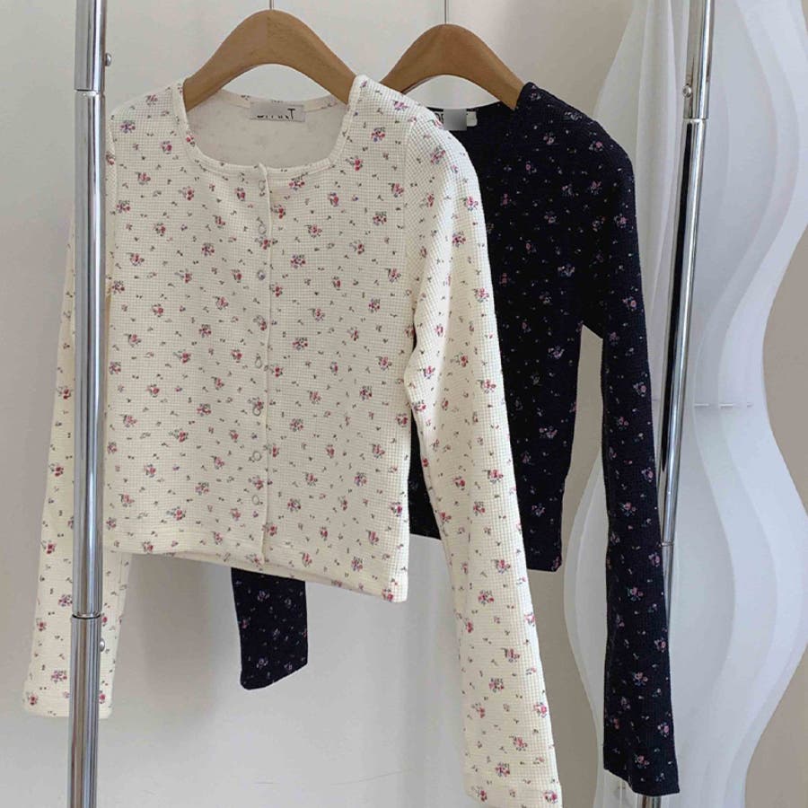 ゆるカワコーデ☆フラワープリント スクエアネック ショート丈 ニットトップス