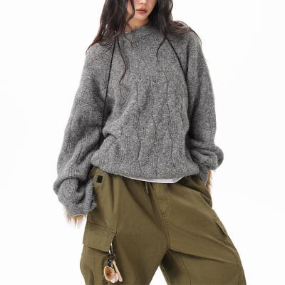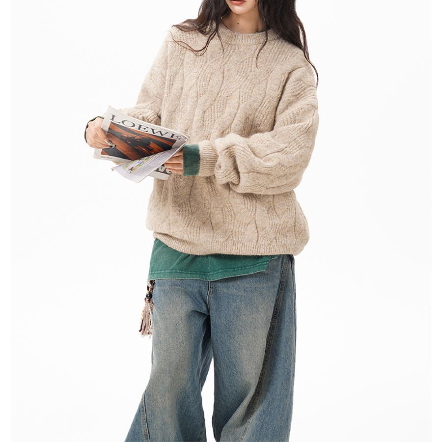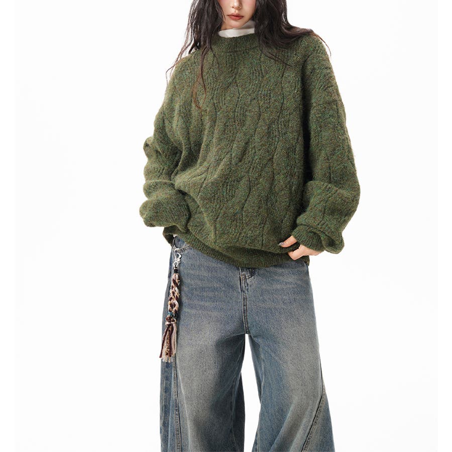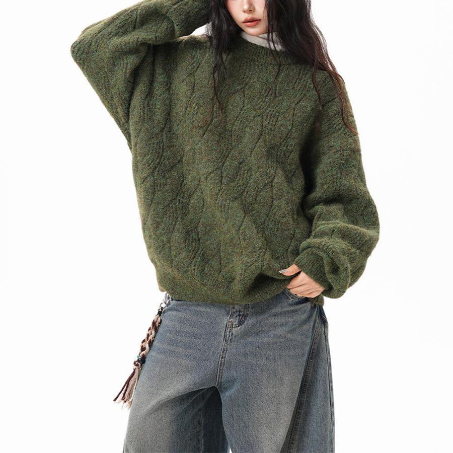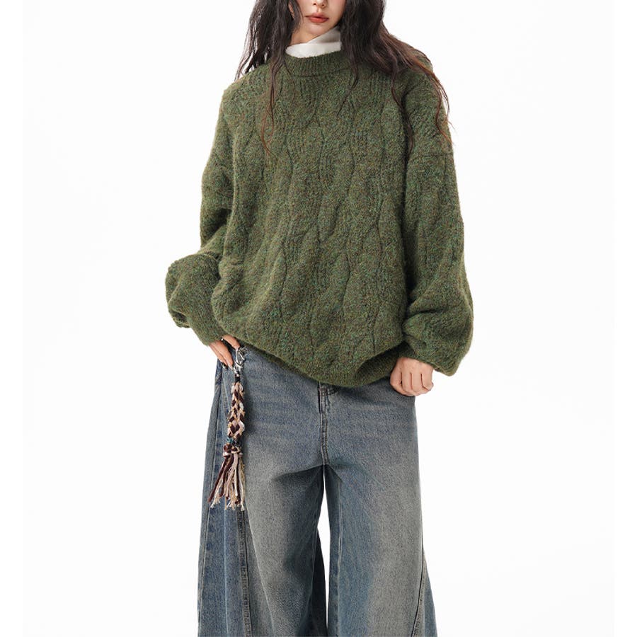 ユニセックス☆フェアリーグリーン ケーブル編みニットカジュアル 万能トップス