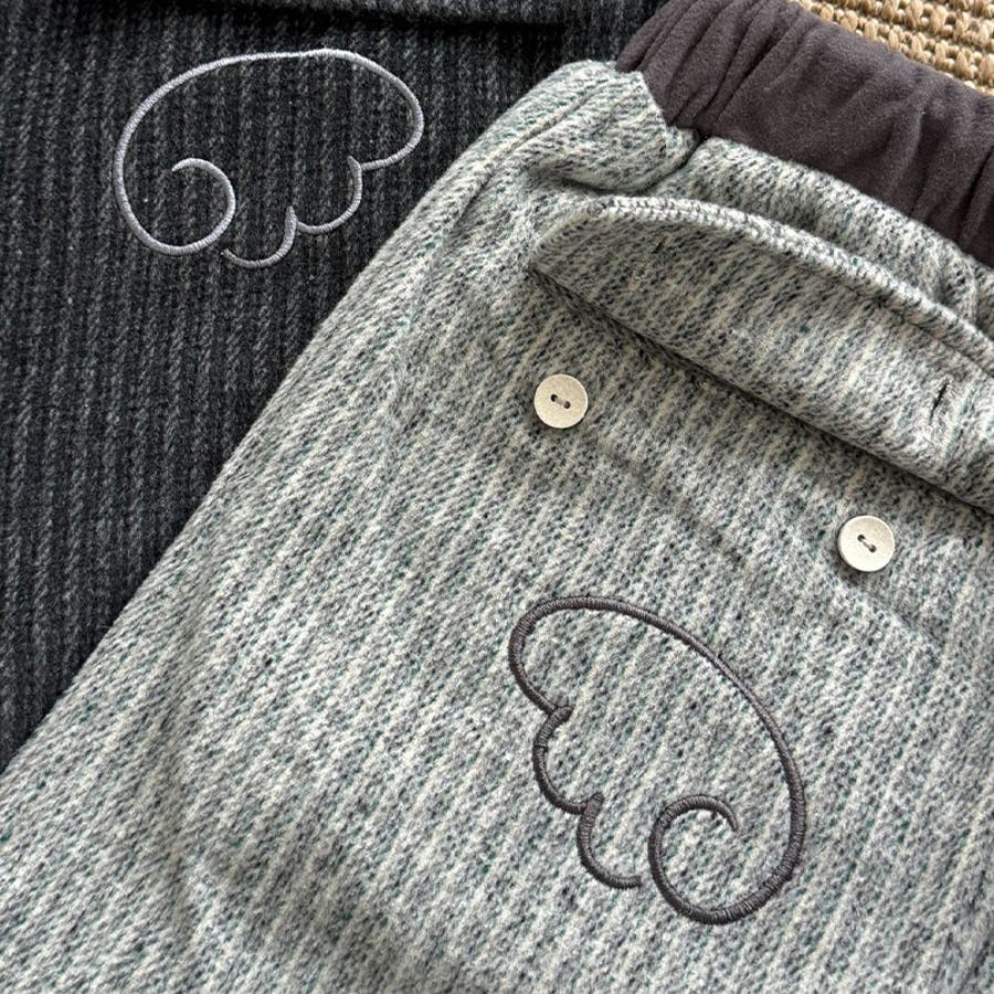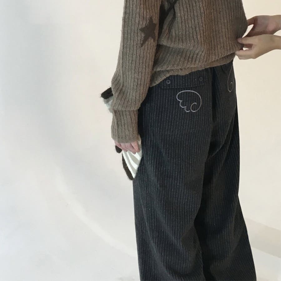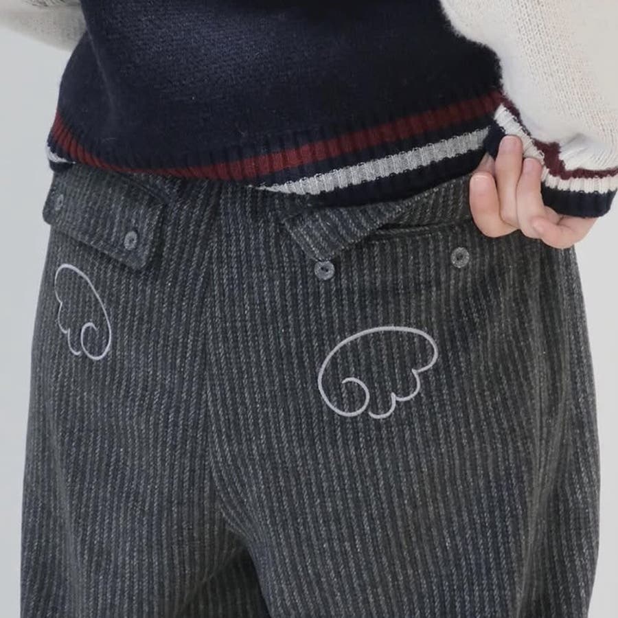 甘辛系ガールズ☆縦ストライプ×ウィング刺繍 ルーズストレートパンツ