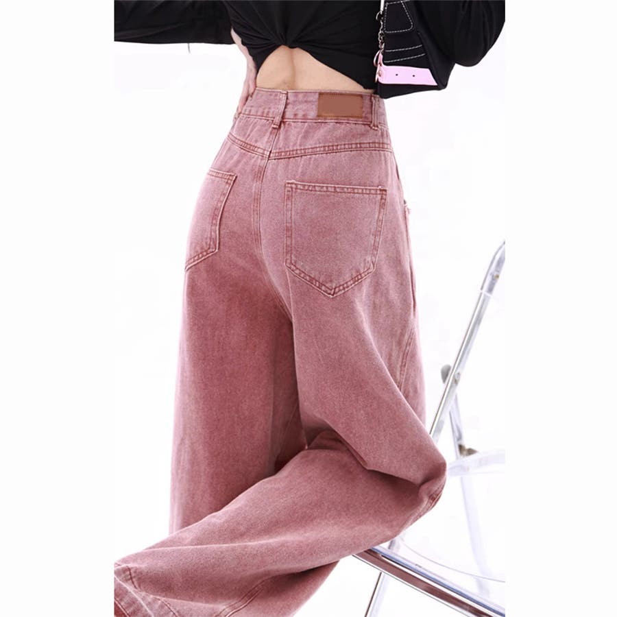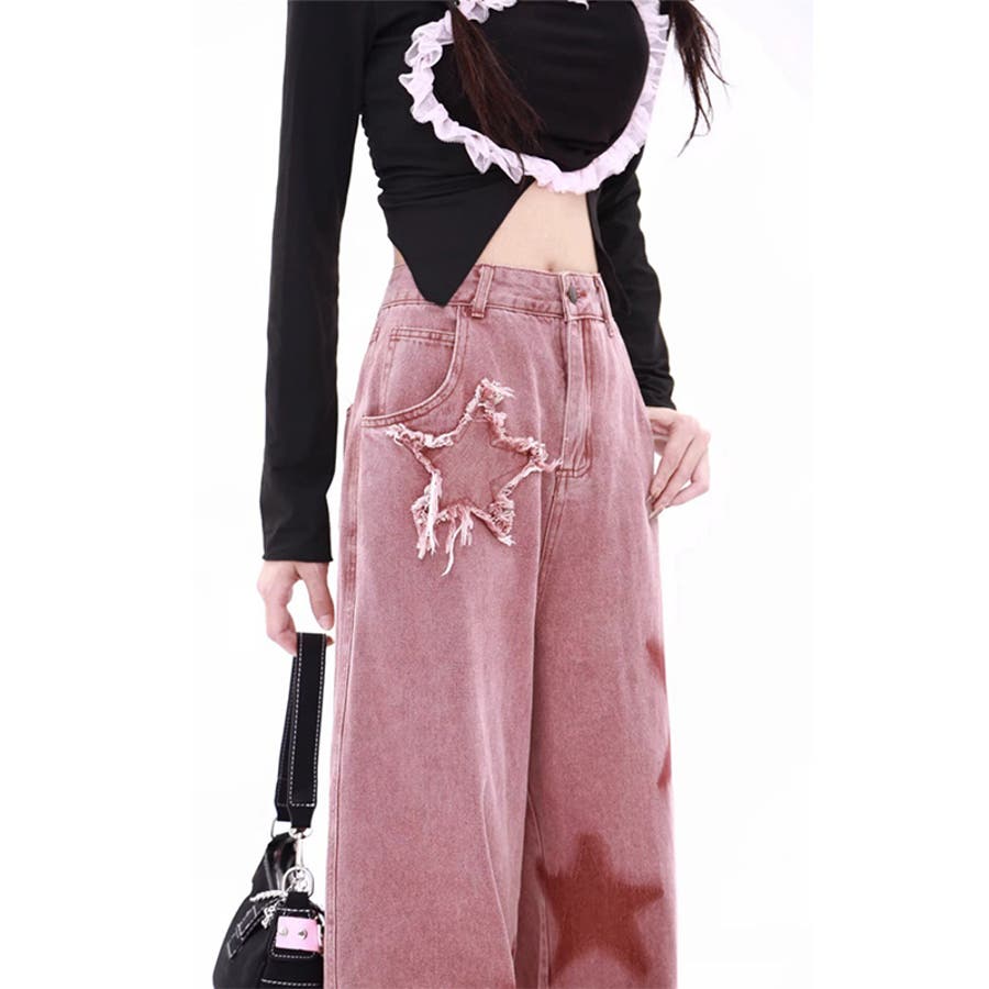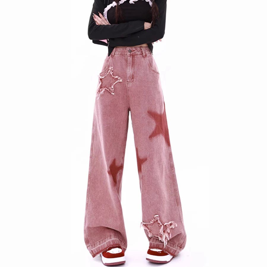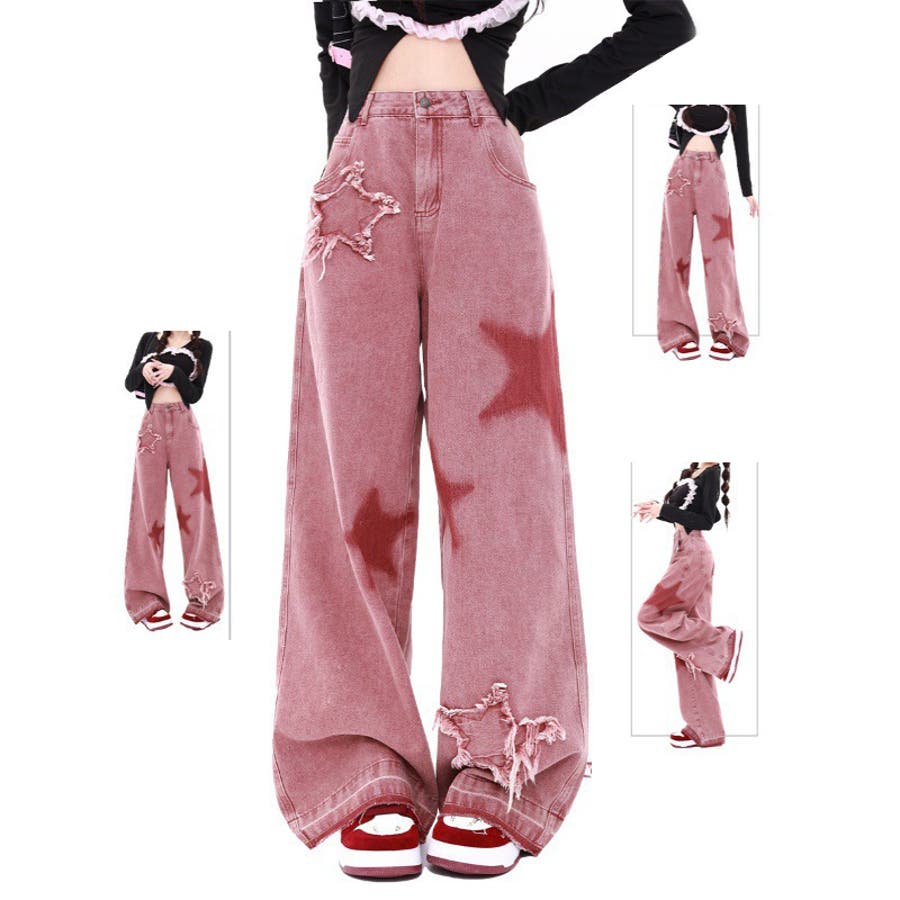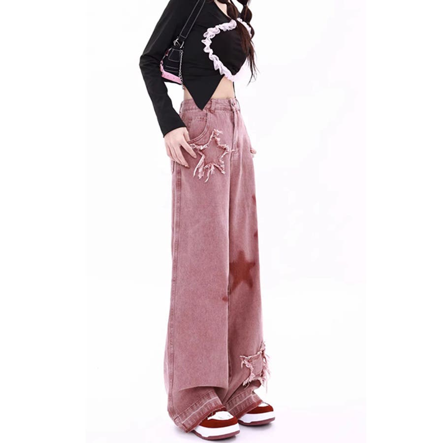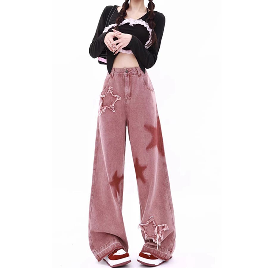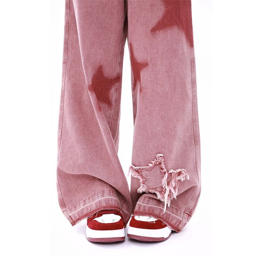甘辛系ガールズ☆五つ星刺繍 フリンジ加工 ローウエスト デニムワイドパンツ