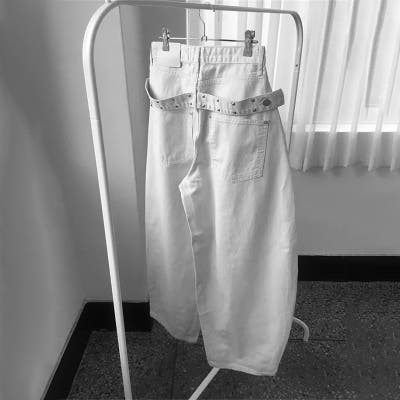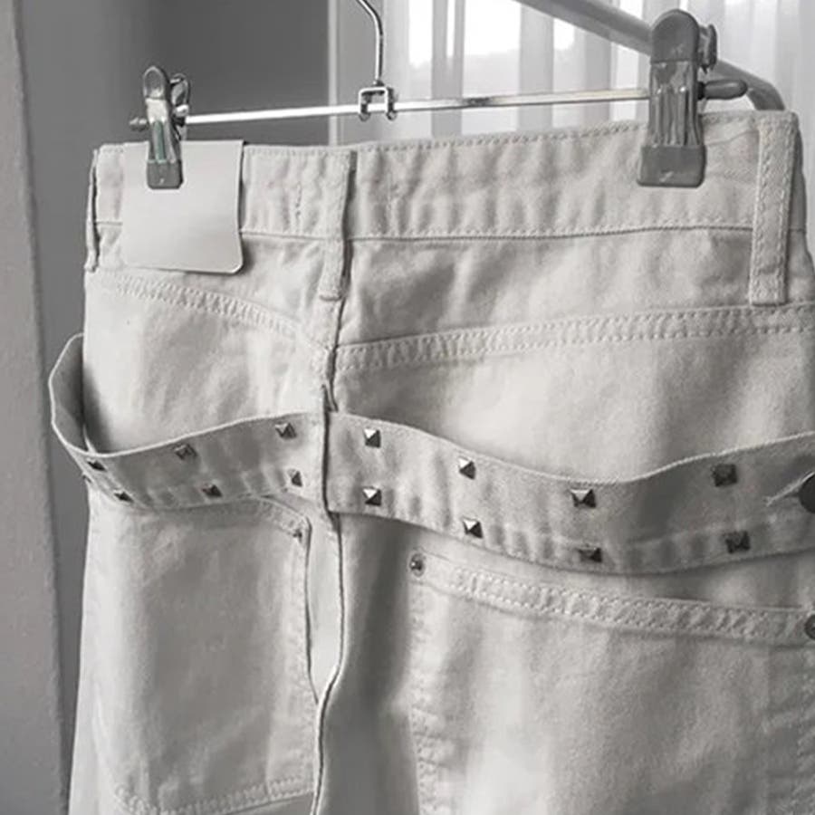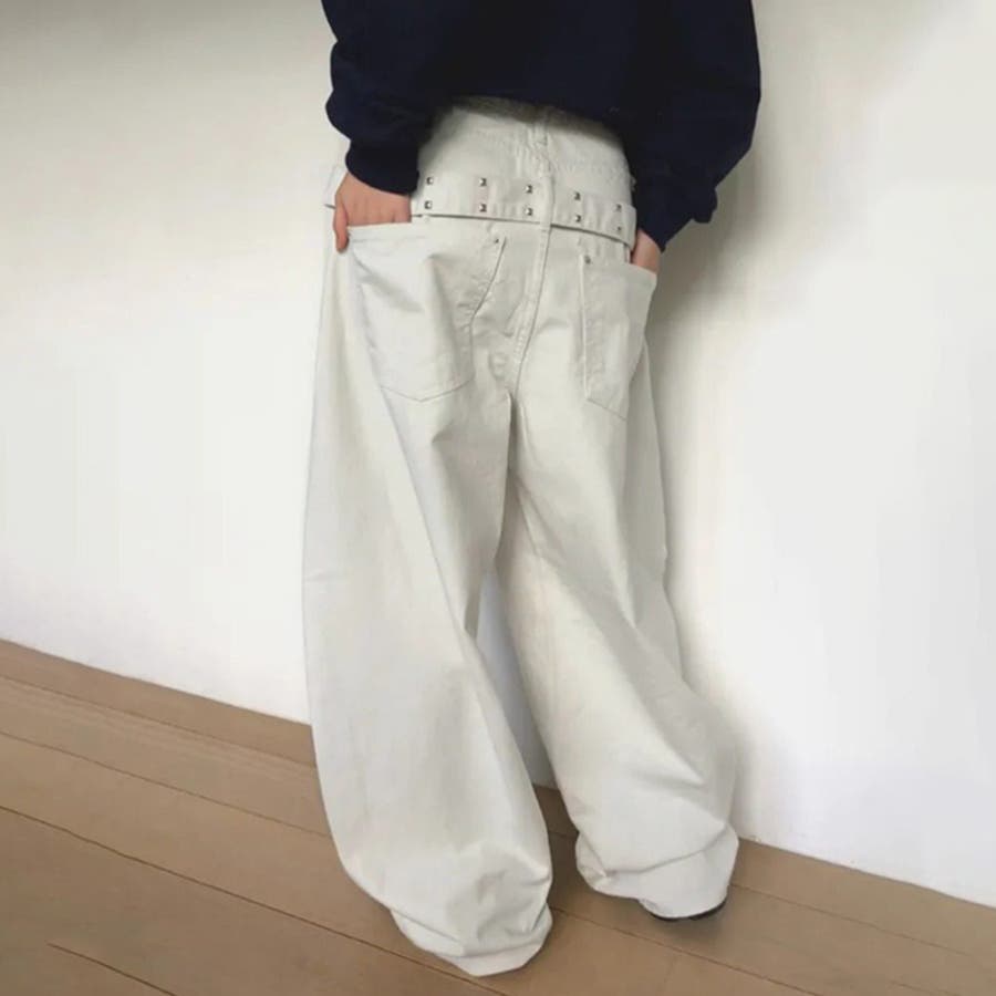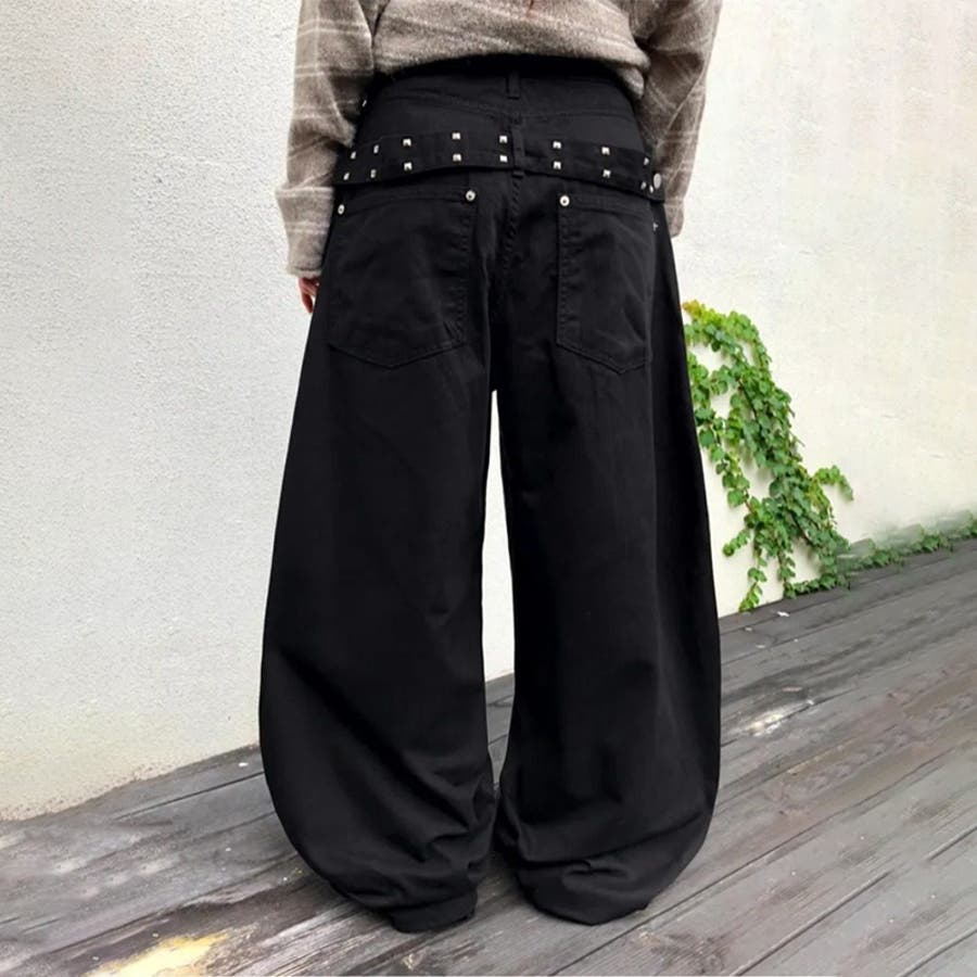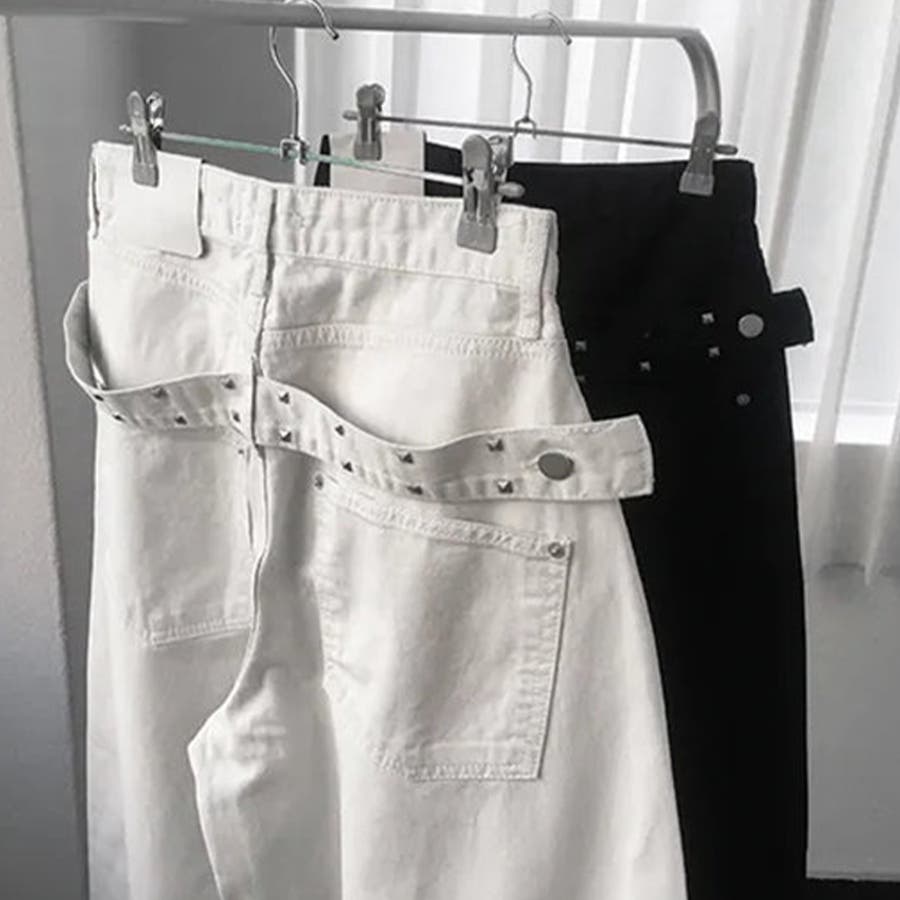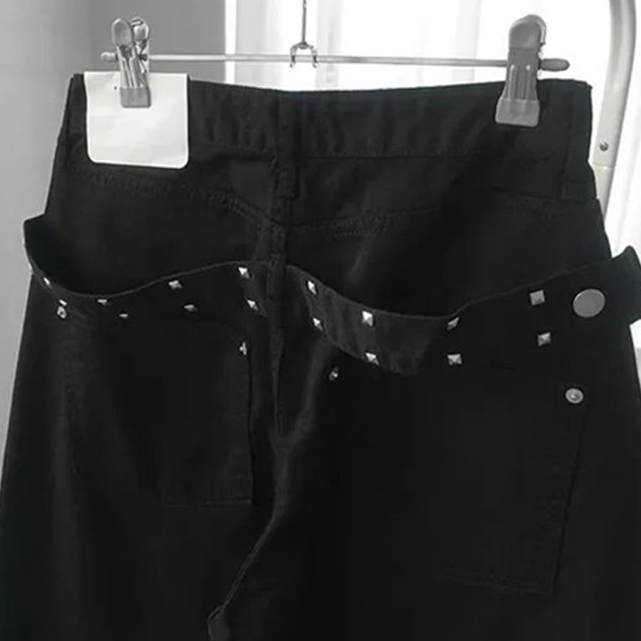 ユニセックス☆背面スタッズ装飾 ベルトハイウエスト デニムロングパンツ