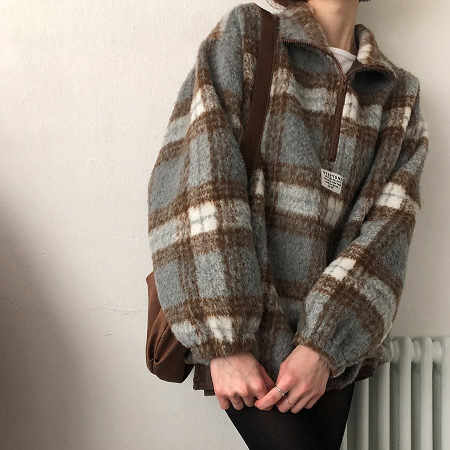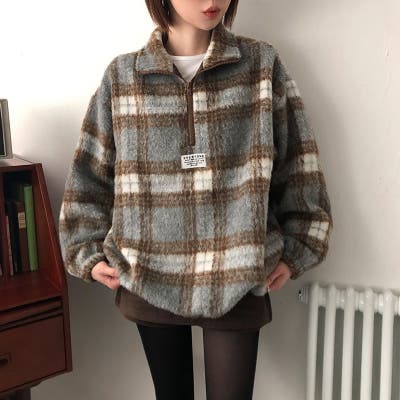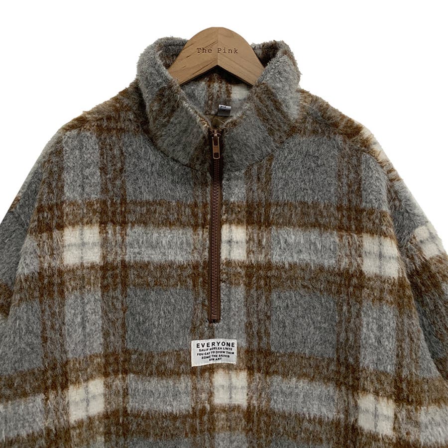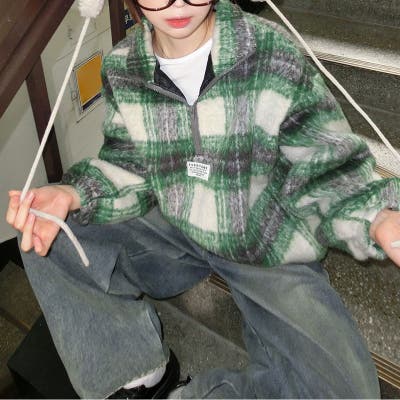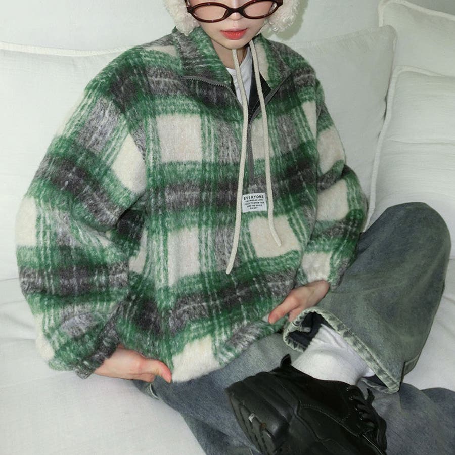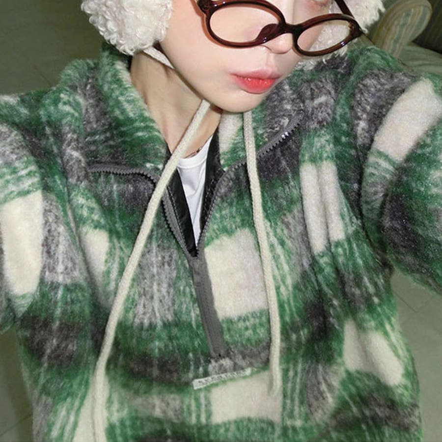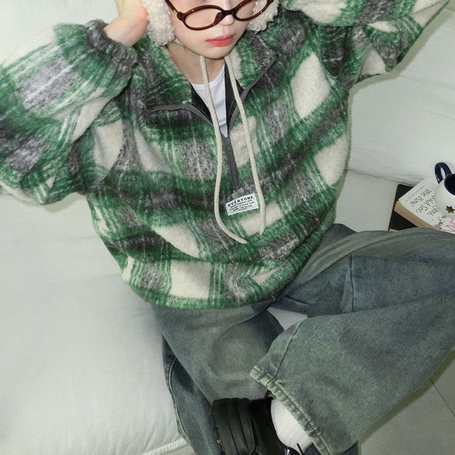 気負わず快適☆レトログリーン チェック柄 ジップアップ ファースウェット