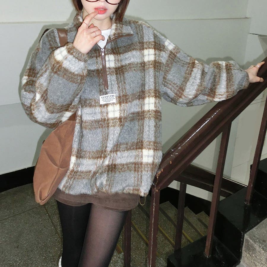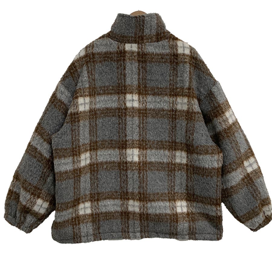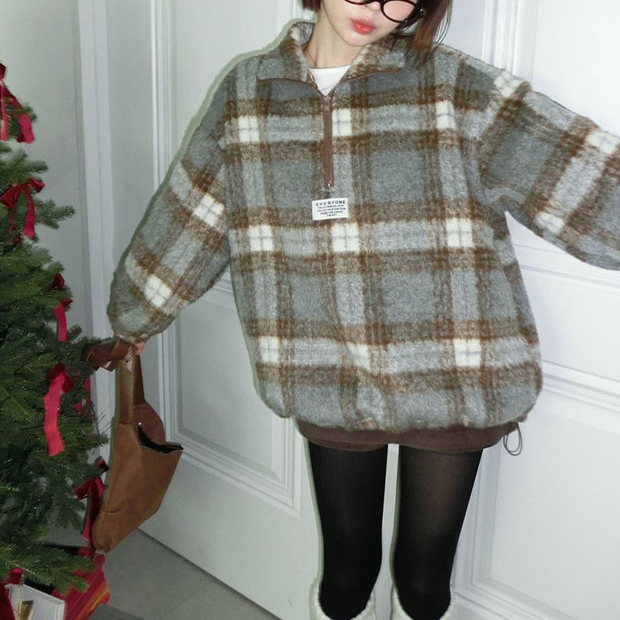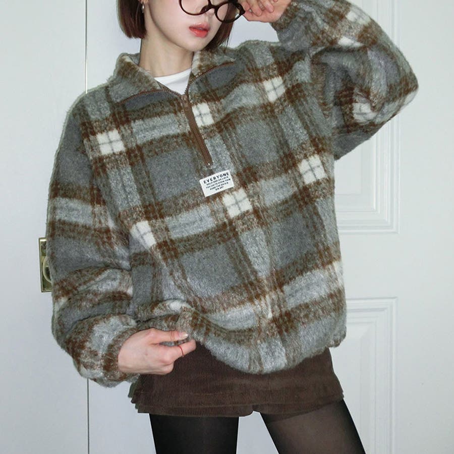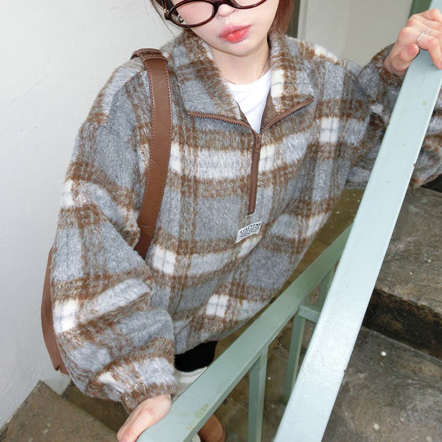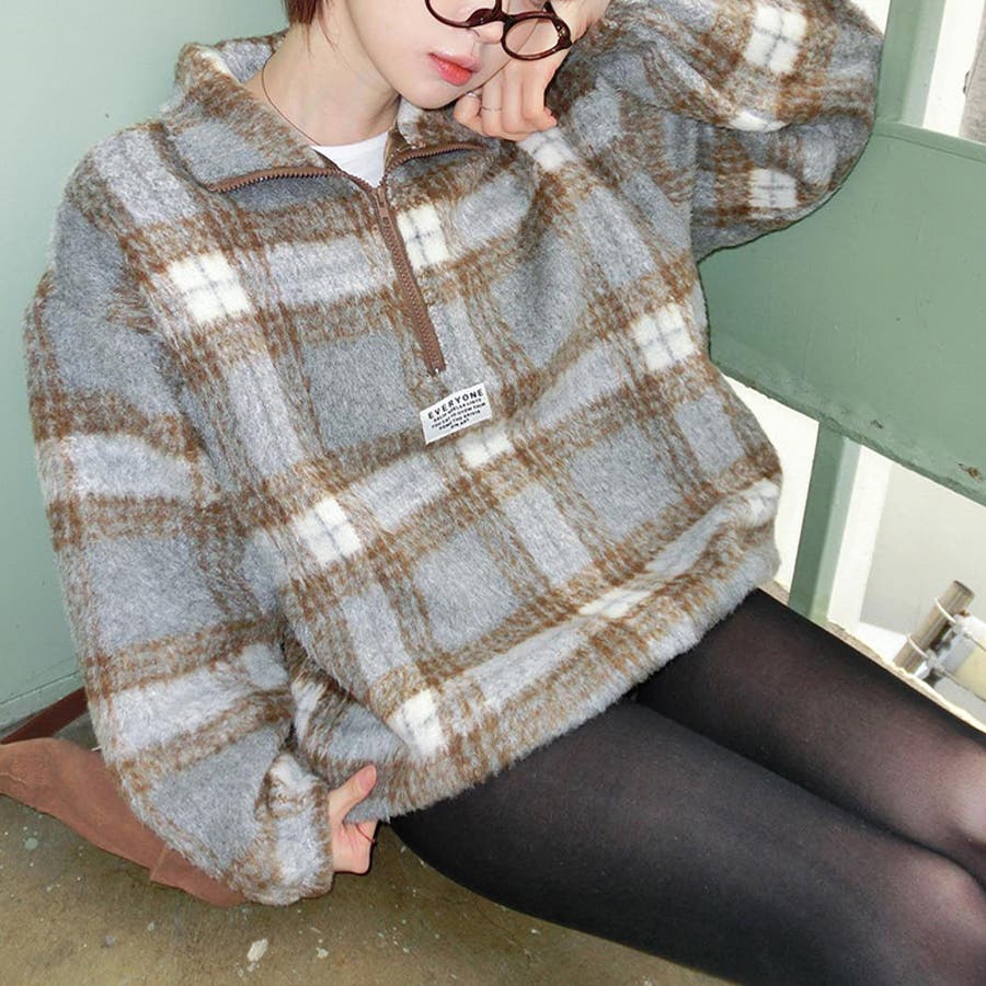 気負わず快適☆レトログリーン チェック柄 ジップアップ ファースウェット
