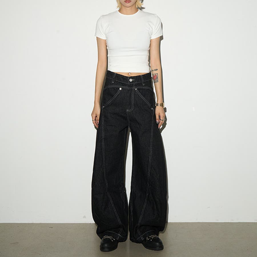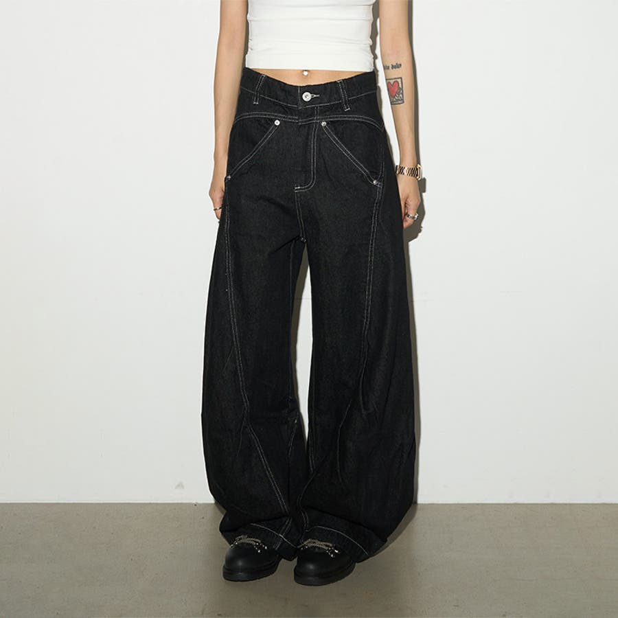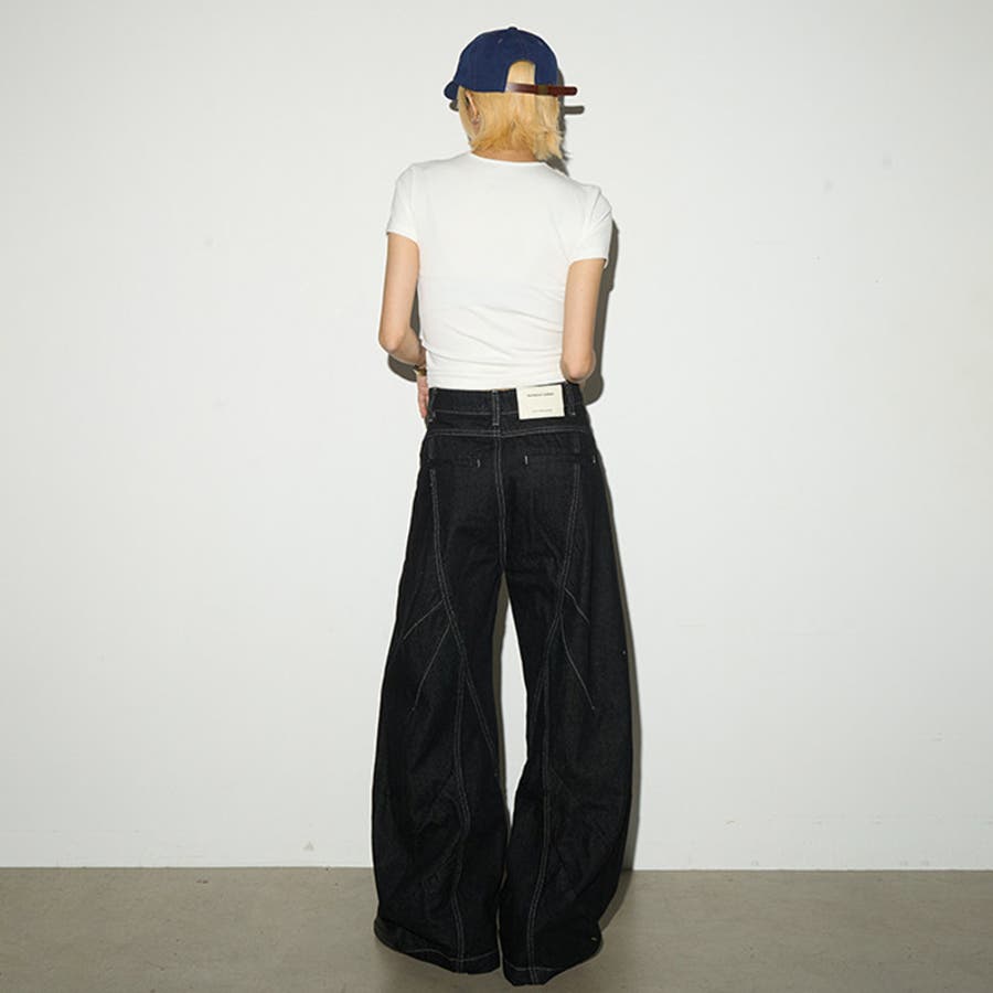 ユニセックス☆構築的 カーブデニムパンツ立体シルエットステッチ
