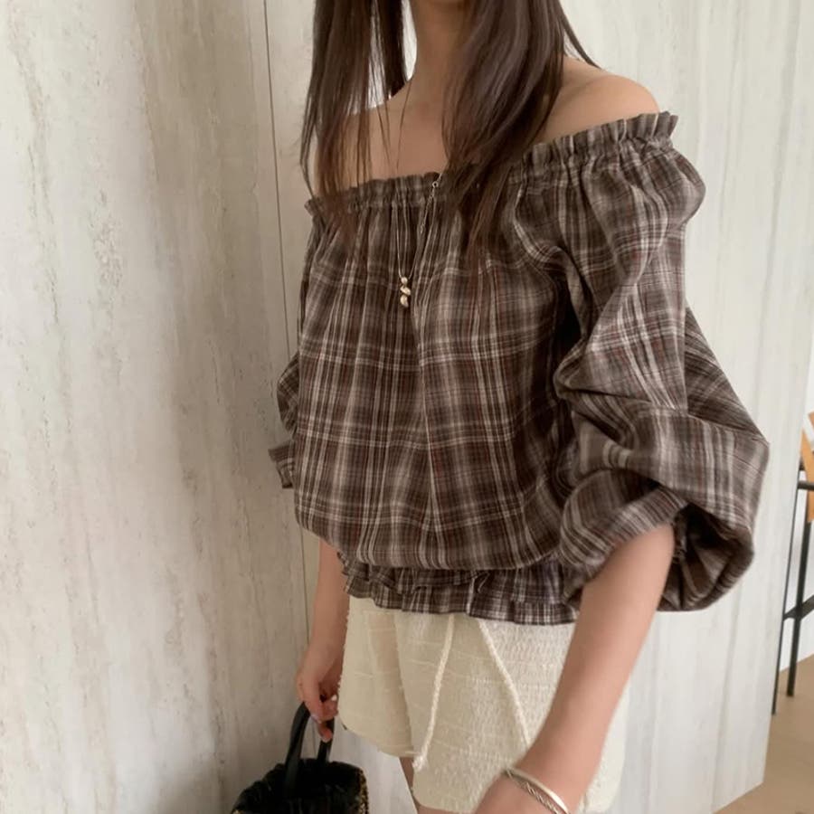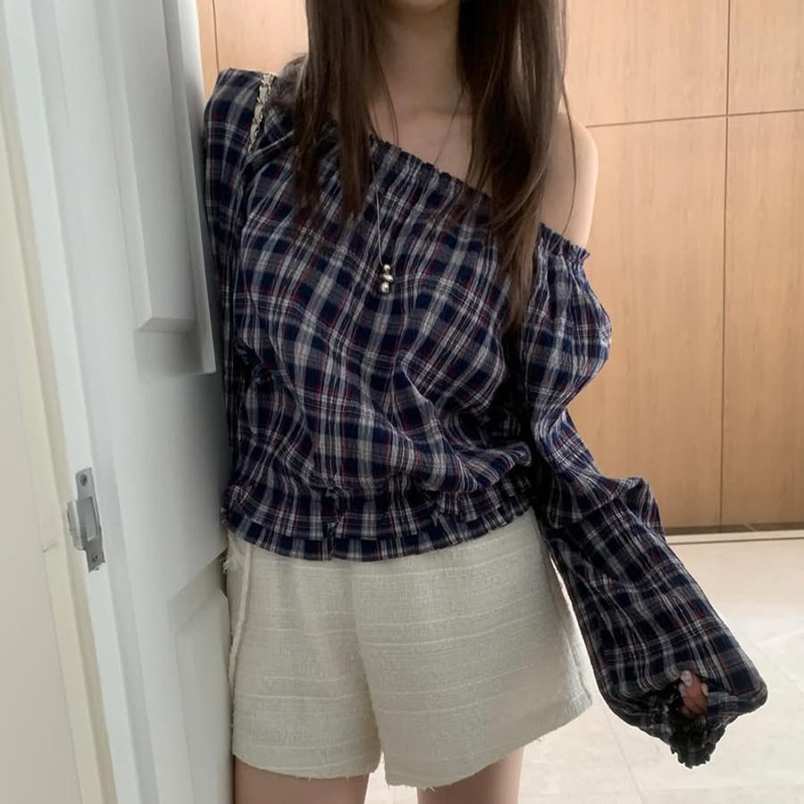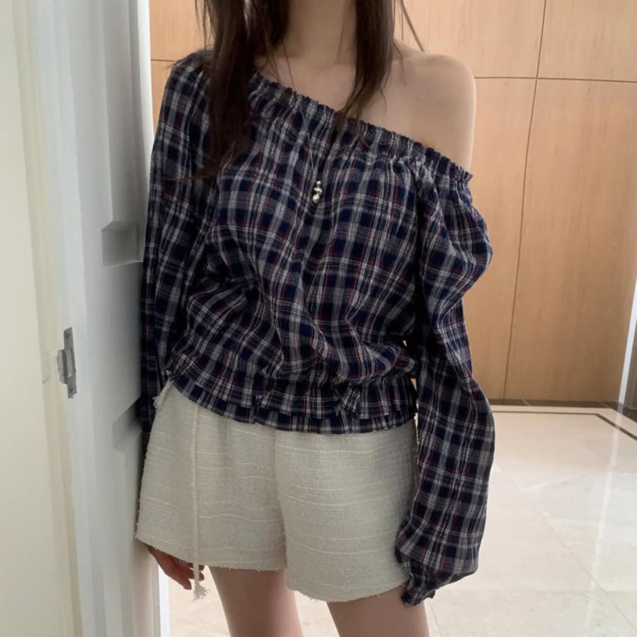 甘辛系ガールズ☆【春】フェミニン オフショルダー チェック柄シャツ