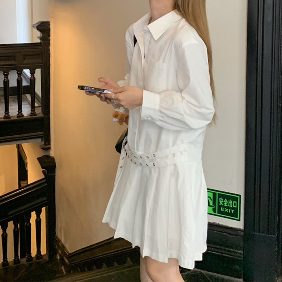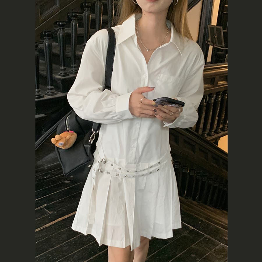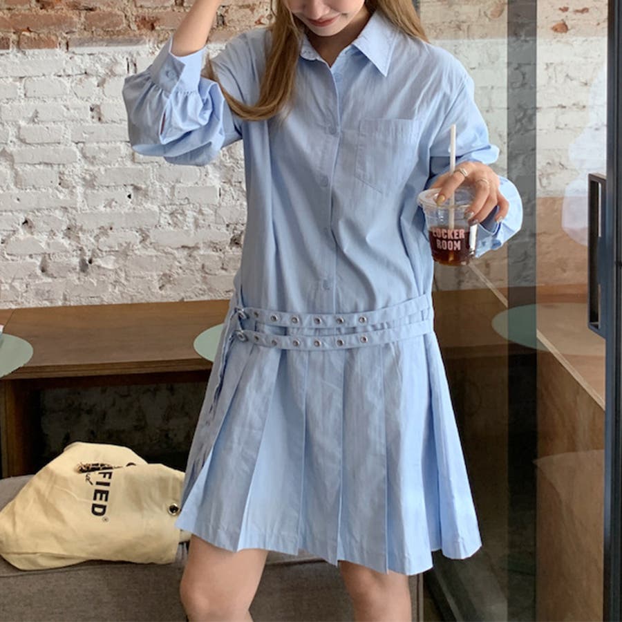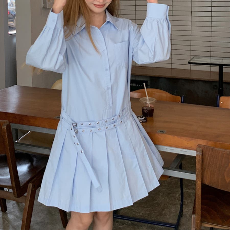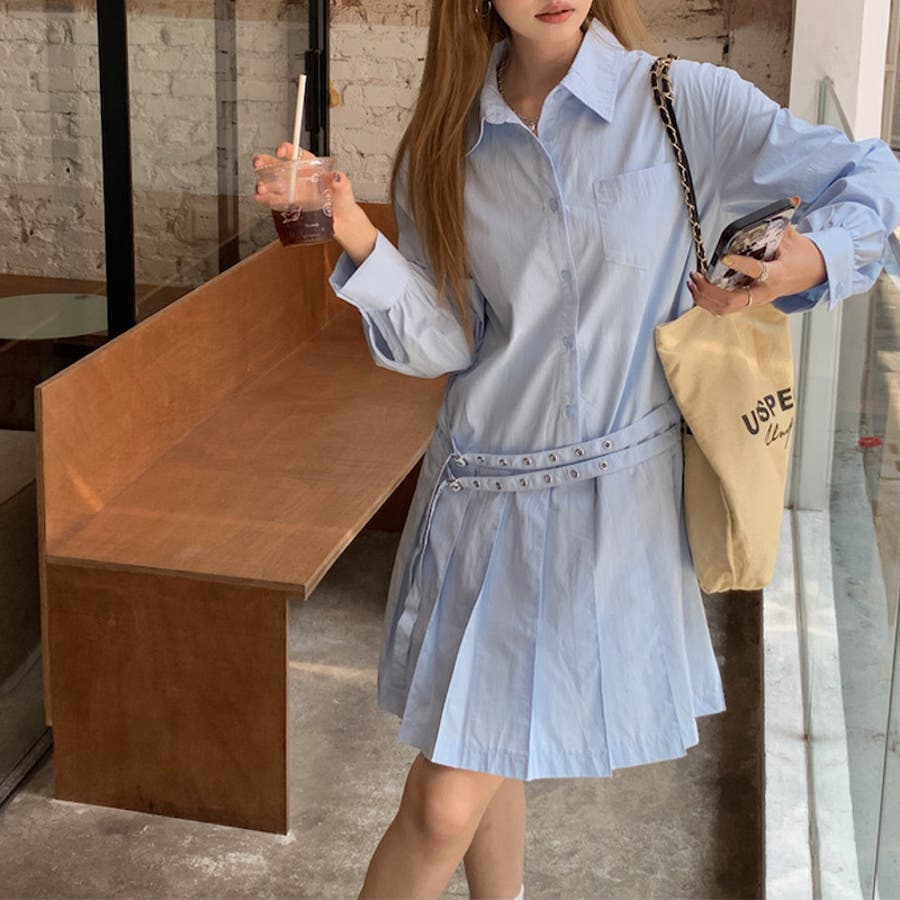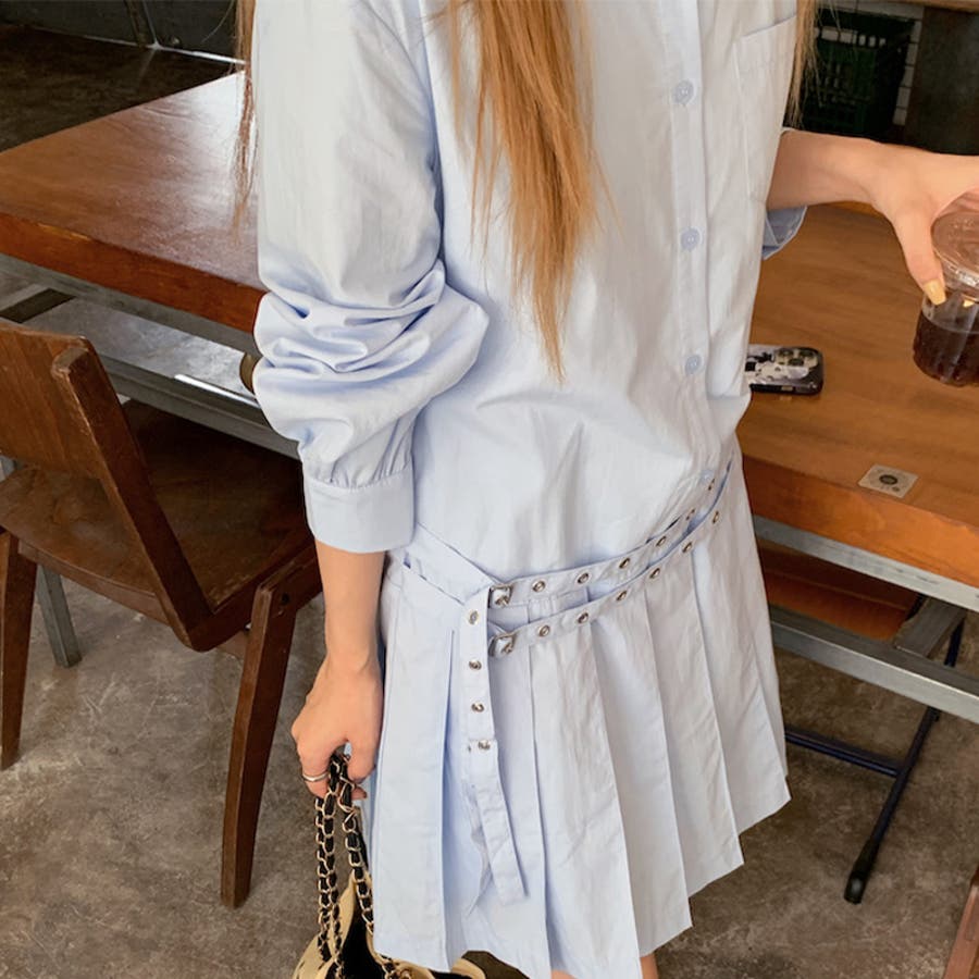 甘辛系ガールズ 【春】ダブルウエストベルト装飾 シャツワンピースプリーツスカート