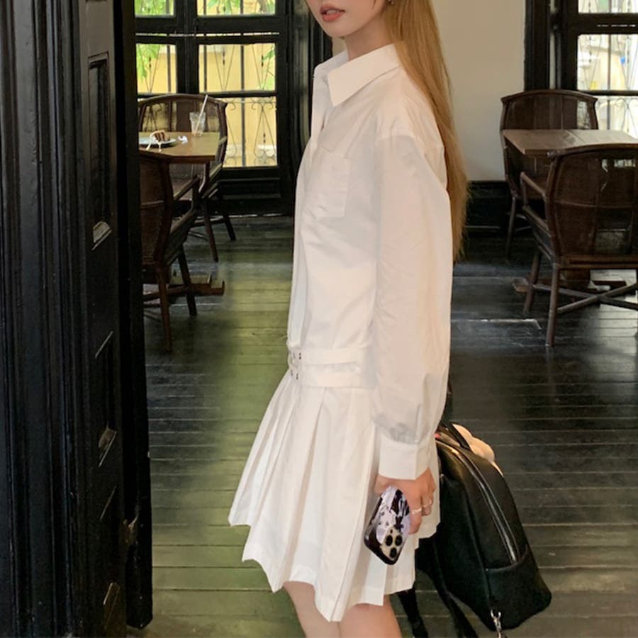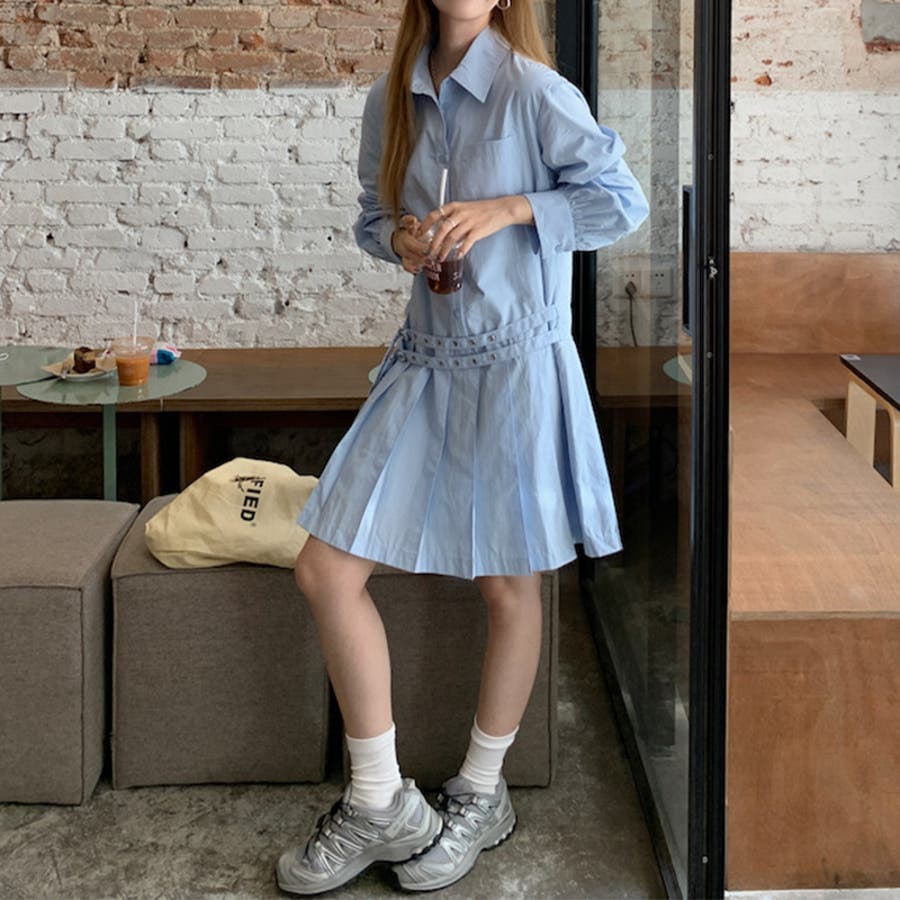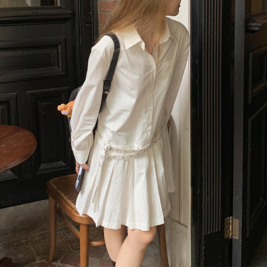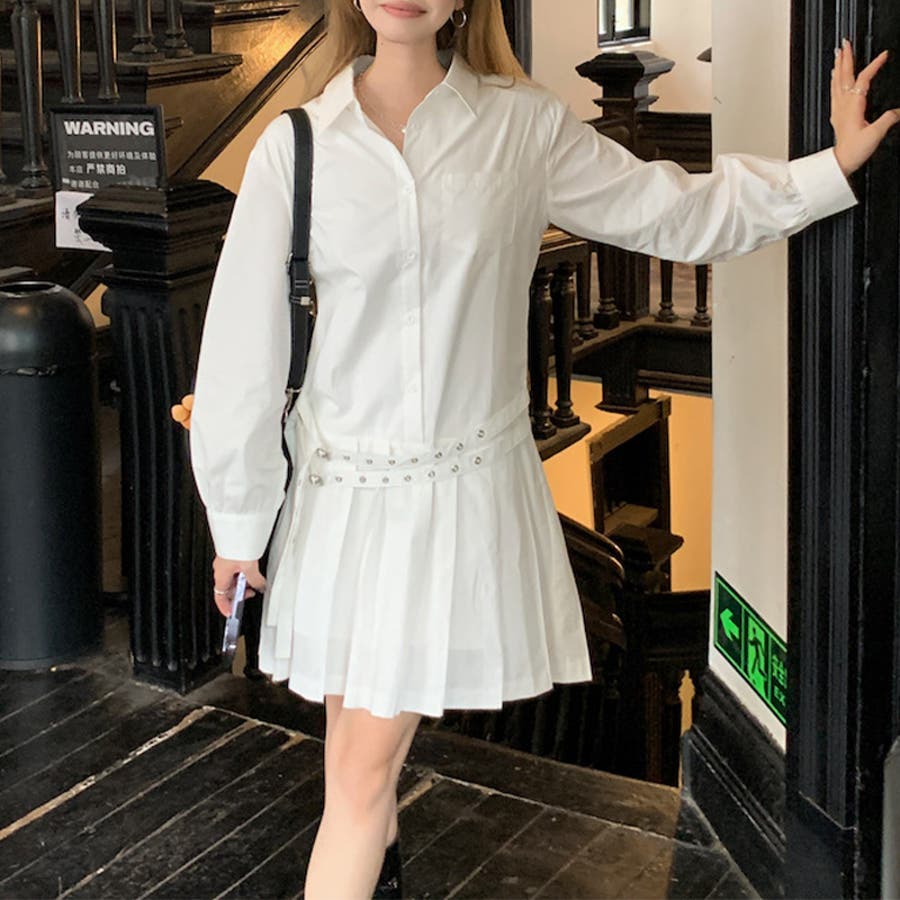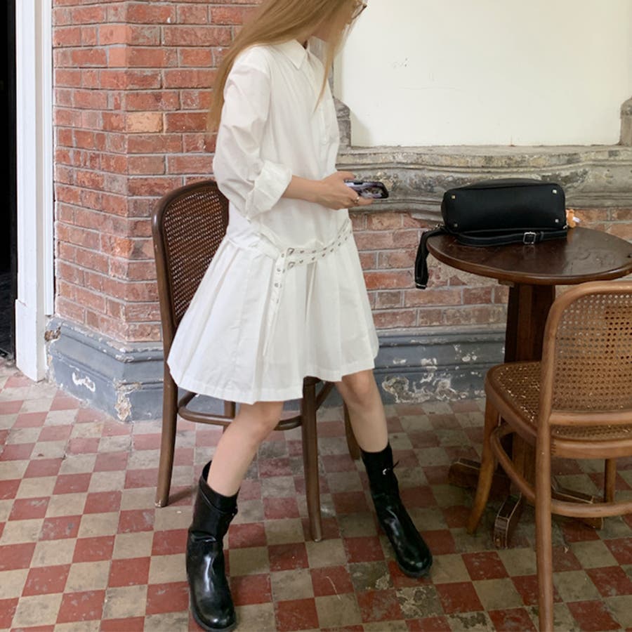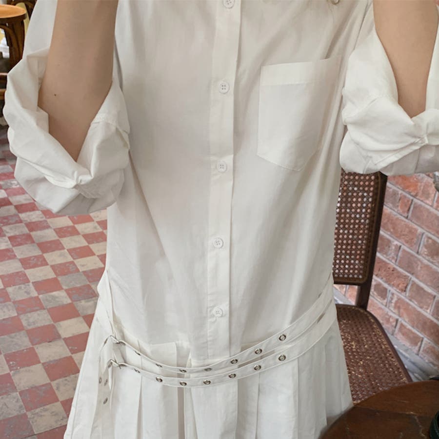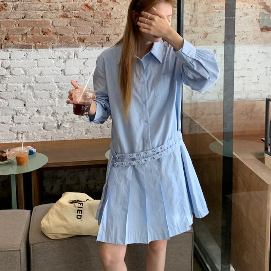 甘辛系ガールズ 【春】ダブルウエストベルト装飾 シャツワンピースプリーツスカート