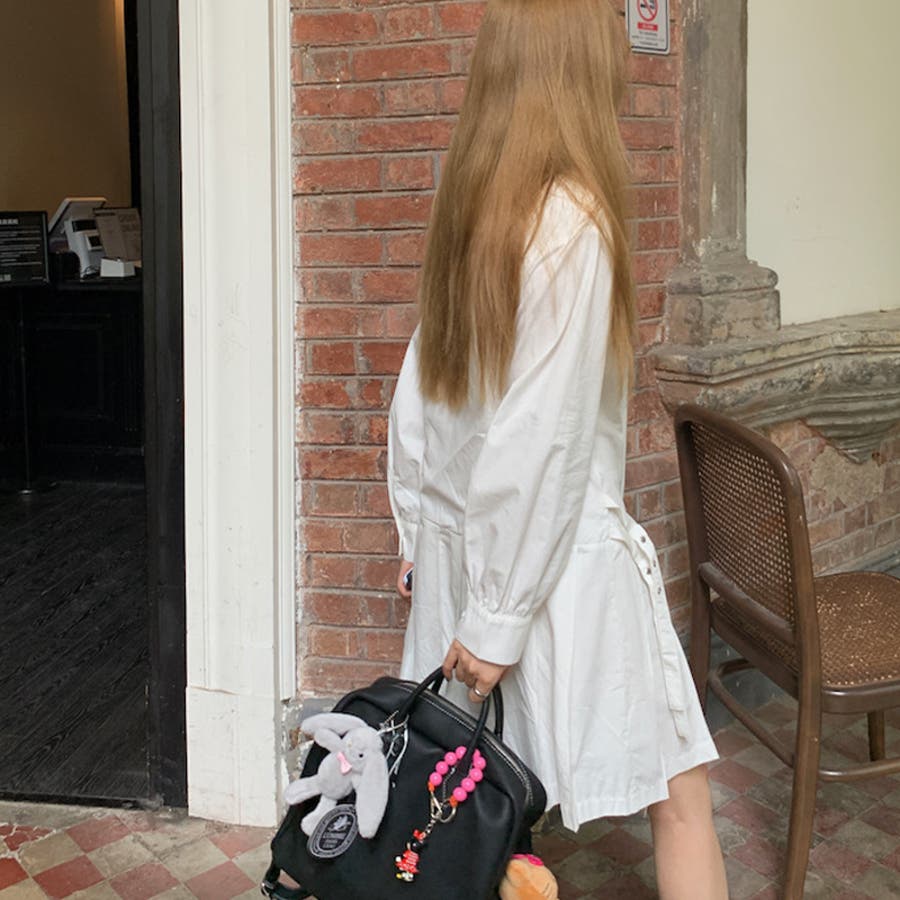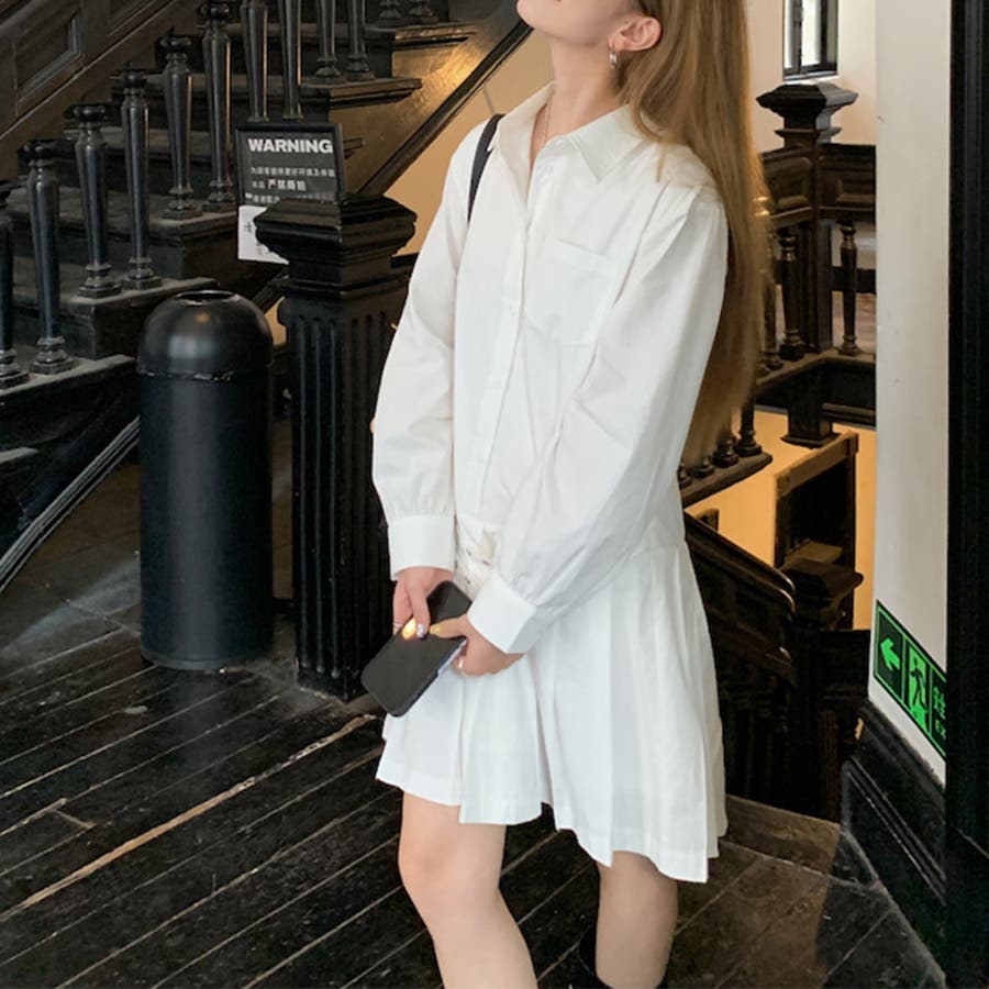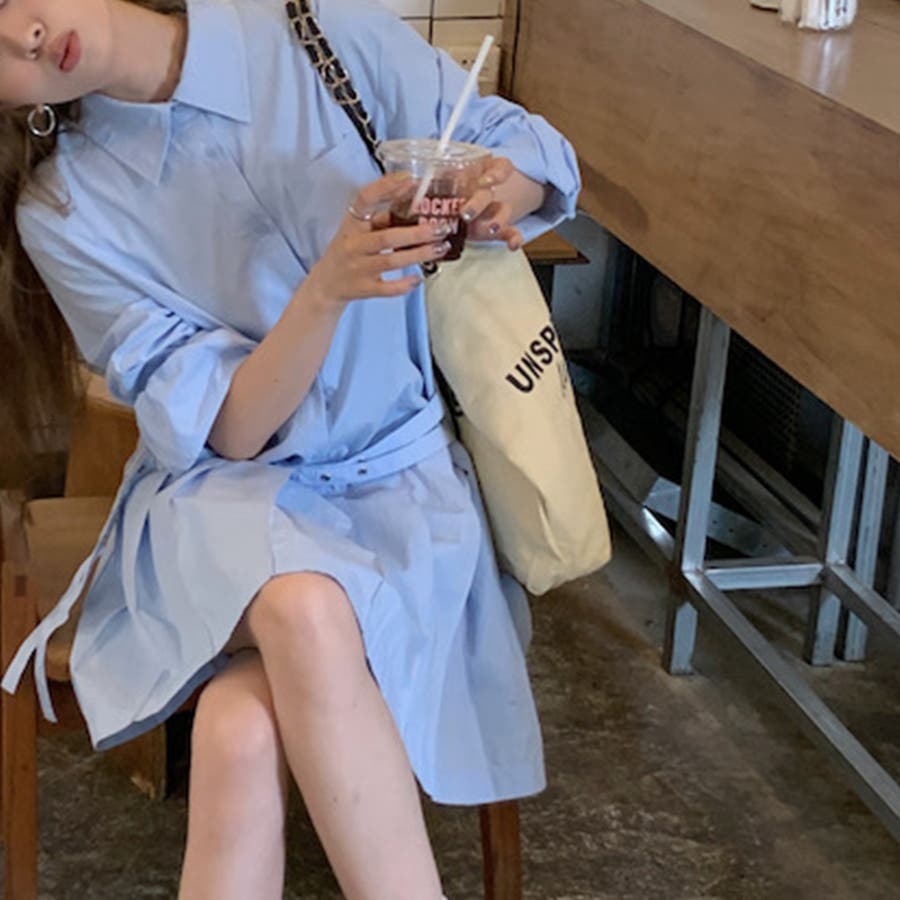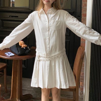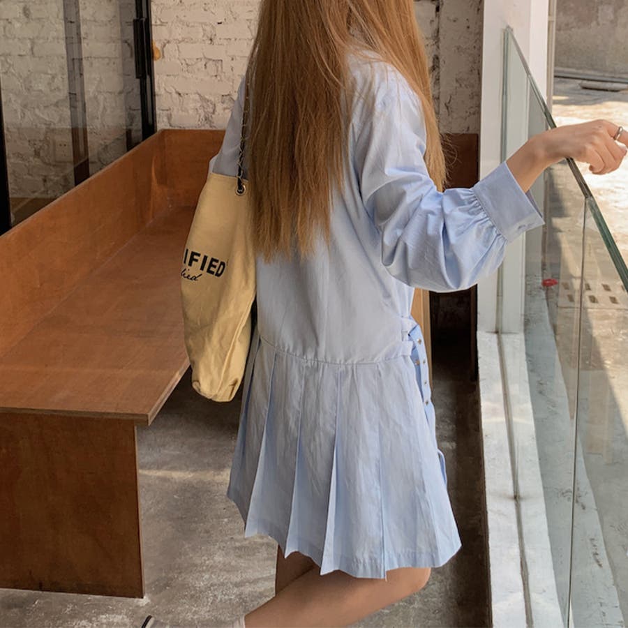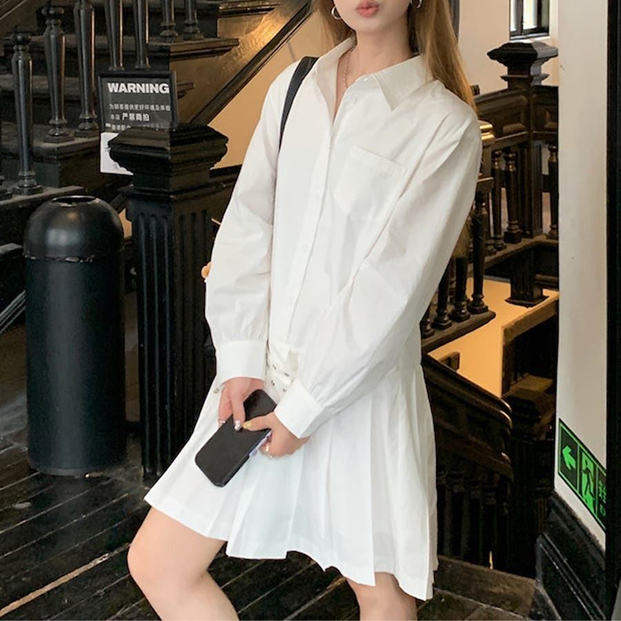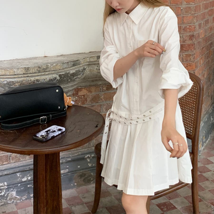 甘辛系ガールズ 【春】ダブルウエストベルト装飾 シャツワンピースプリーツスカート