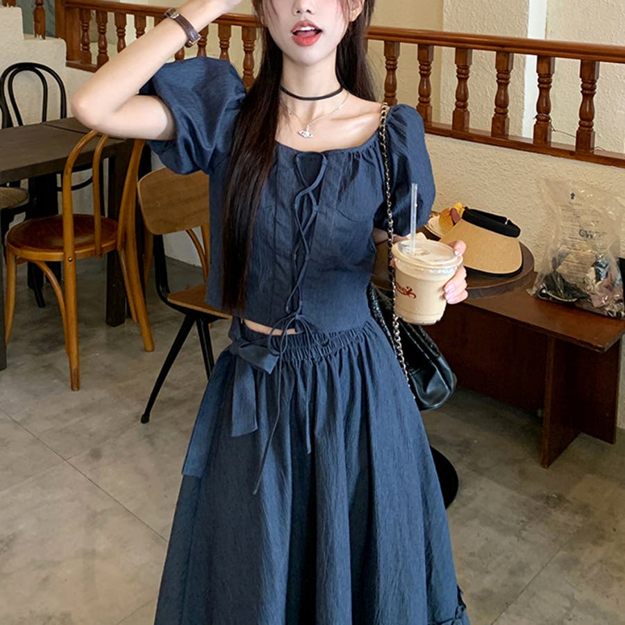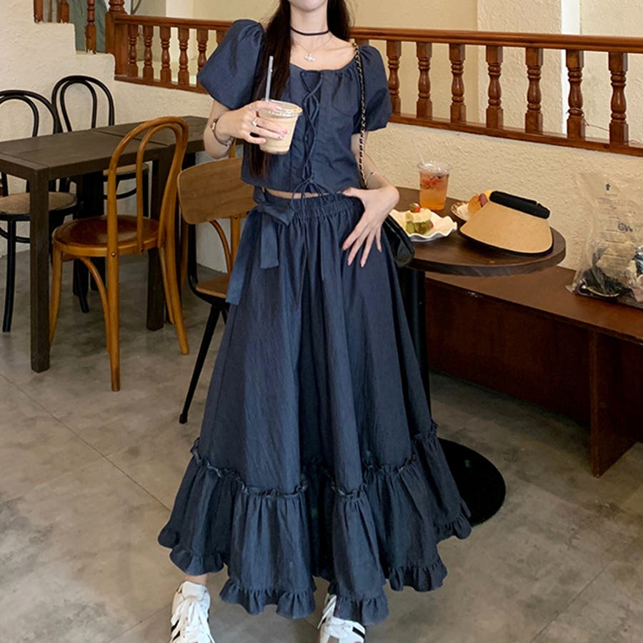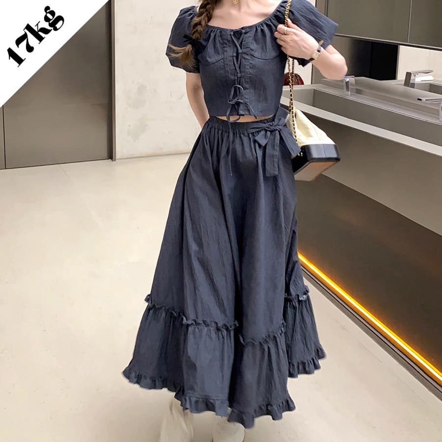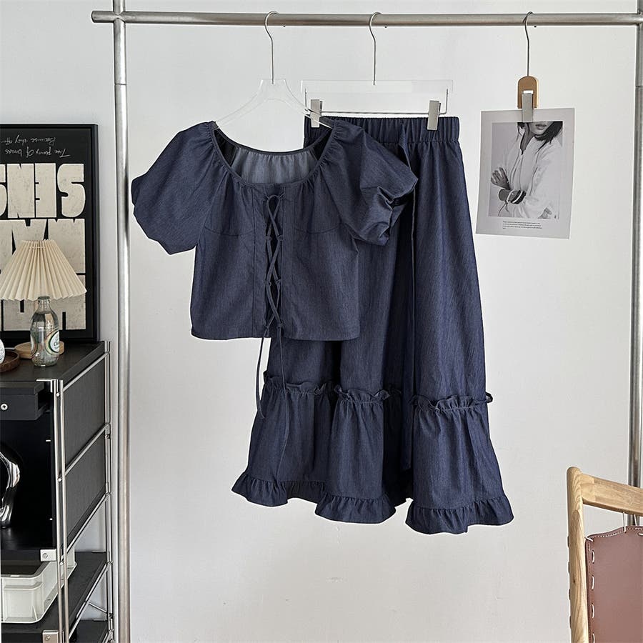 デニム綿生地 優しい雰囲気が漂うレースアップトップス&蝶結びスカート セット