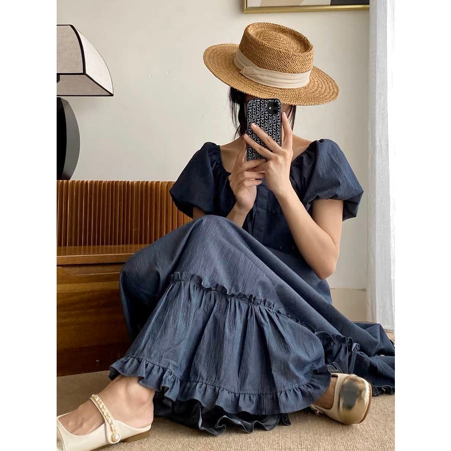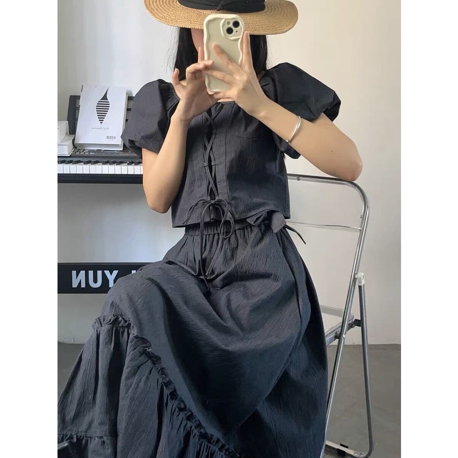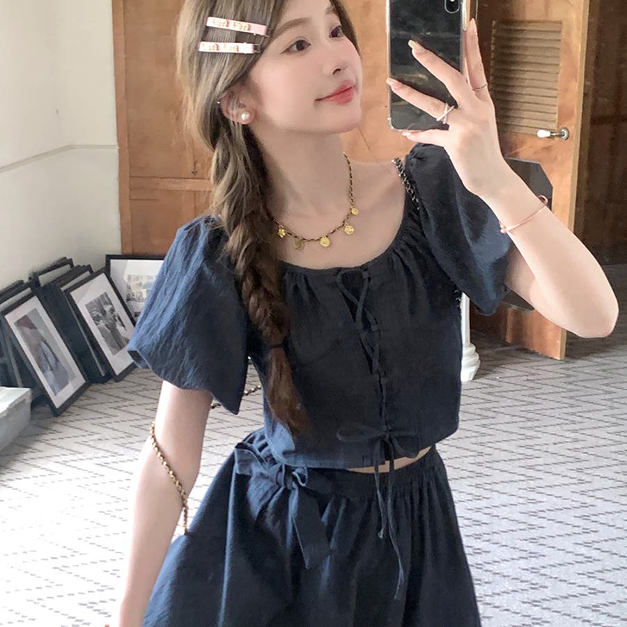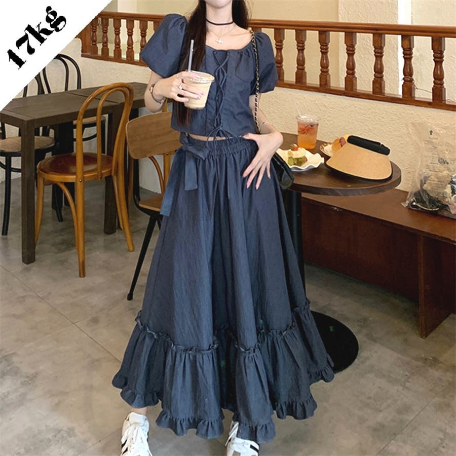 デニム綿生地 優しい雰囲気が漂うレースアップトップス&蝶結びスカート セット
