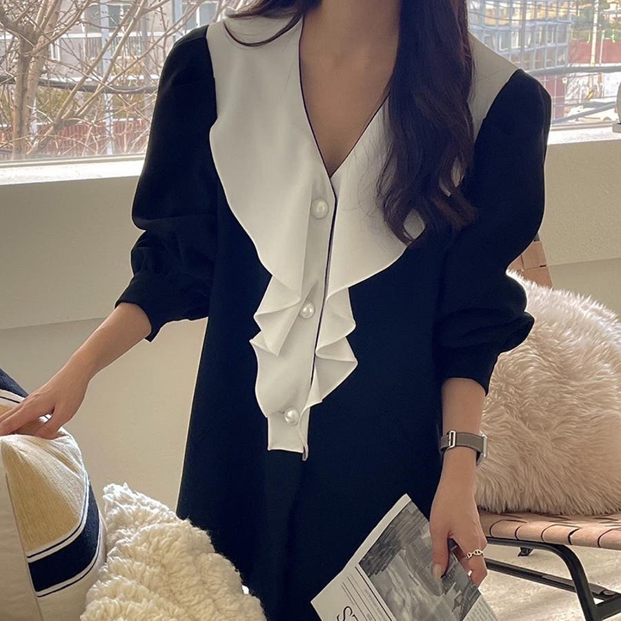 【SHOPLIST限定】Vネックの荷葉エッジワンピース
