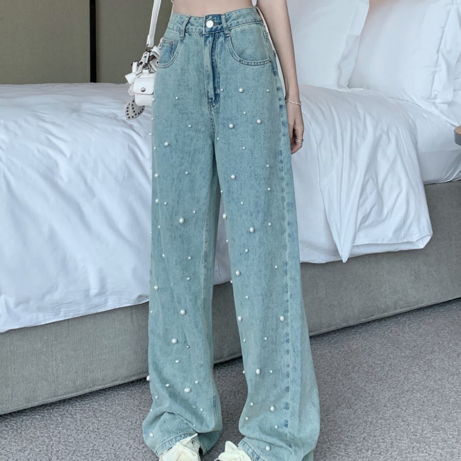 パール付きデザイン感のあるハイウエストでスリムなストレートレッグのデニムパンツ