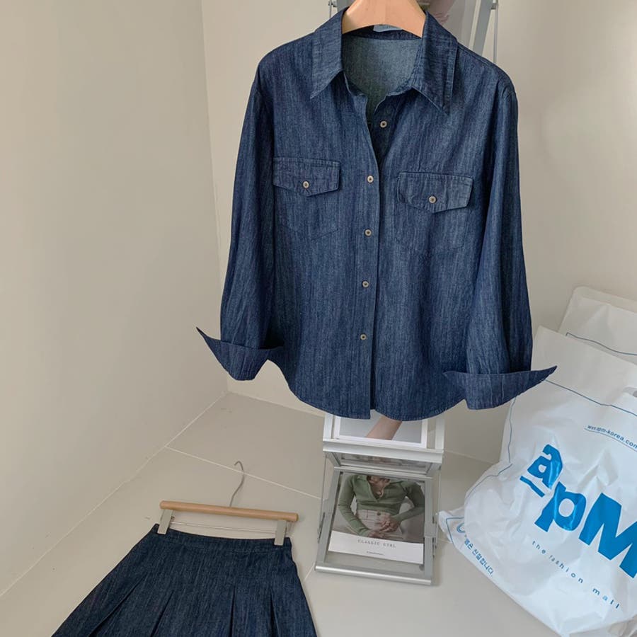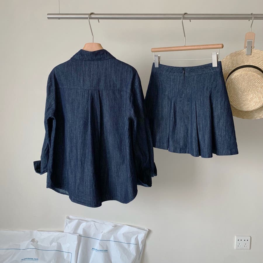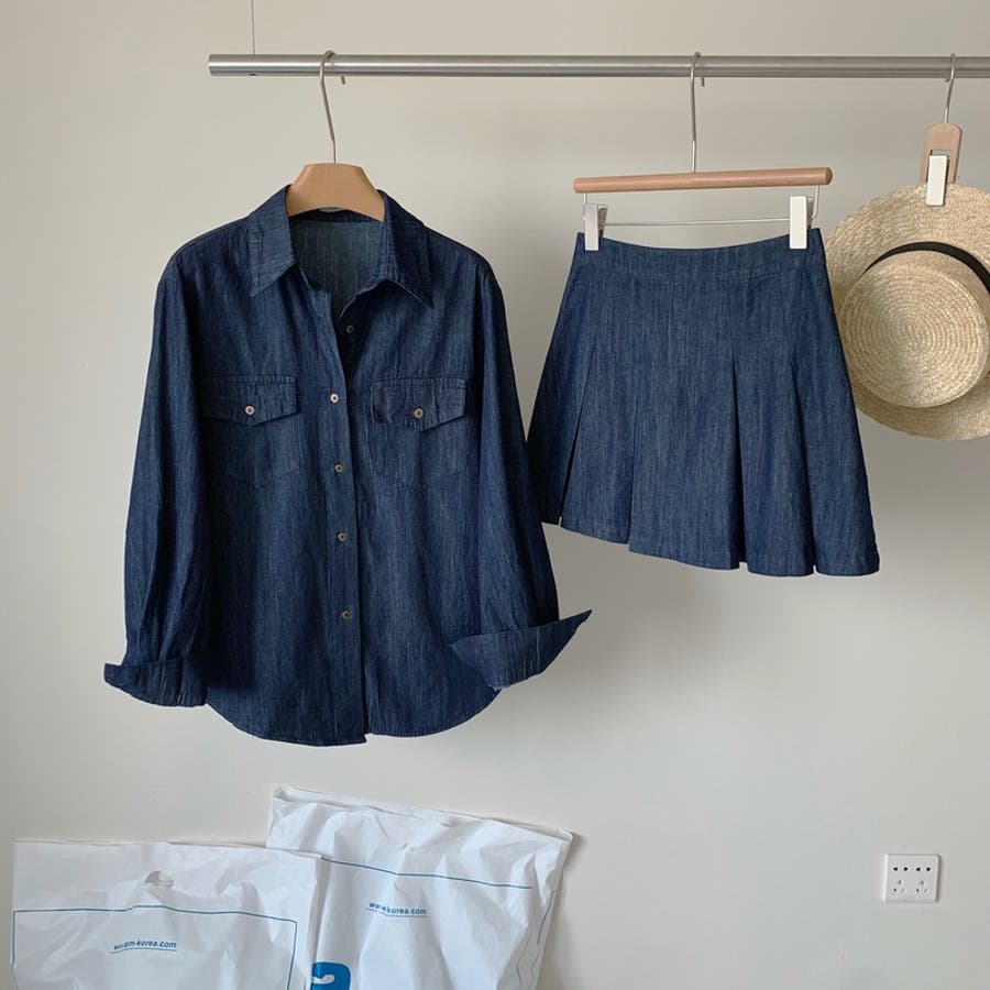 韓国風の体のラインを強調する長袖シャツと、ショートスカート
