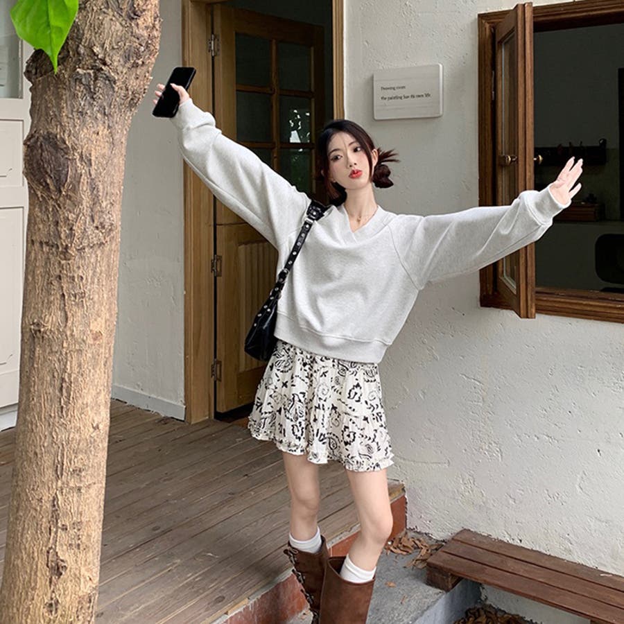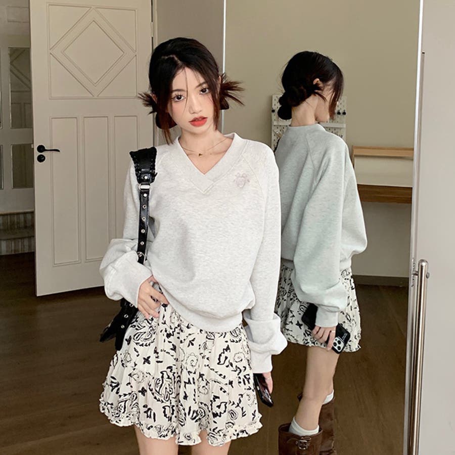 アメリカンレトロでゆったりVネックのパーカーと、すっきり印象のAラインの花柄ハー…