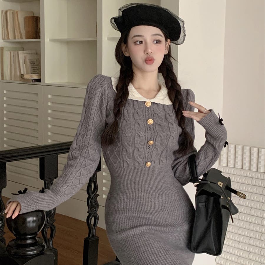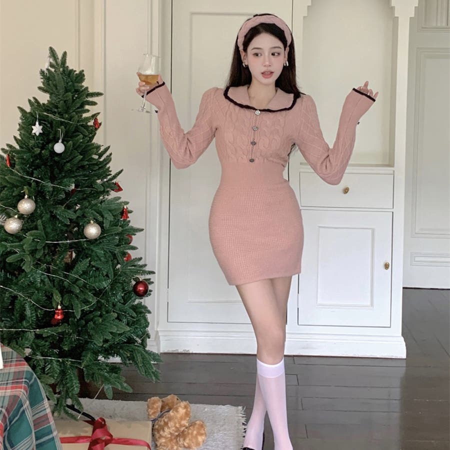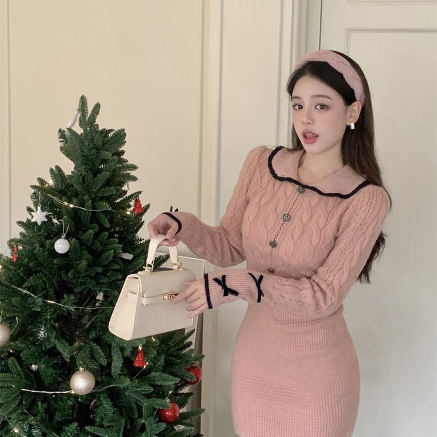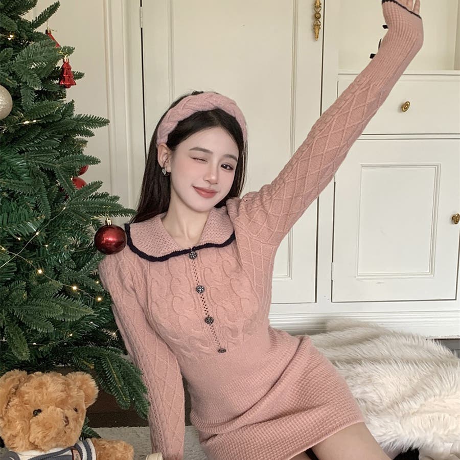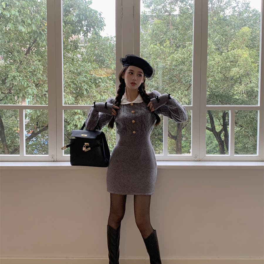 【SHOPLIST限定】韓国風シックな秋新作バイカラーニットタイトワンピース