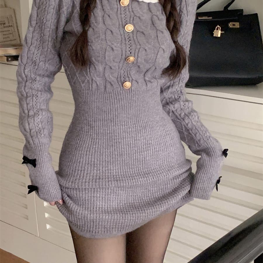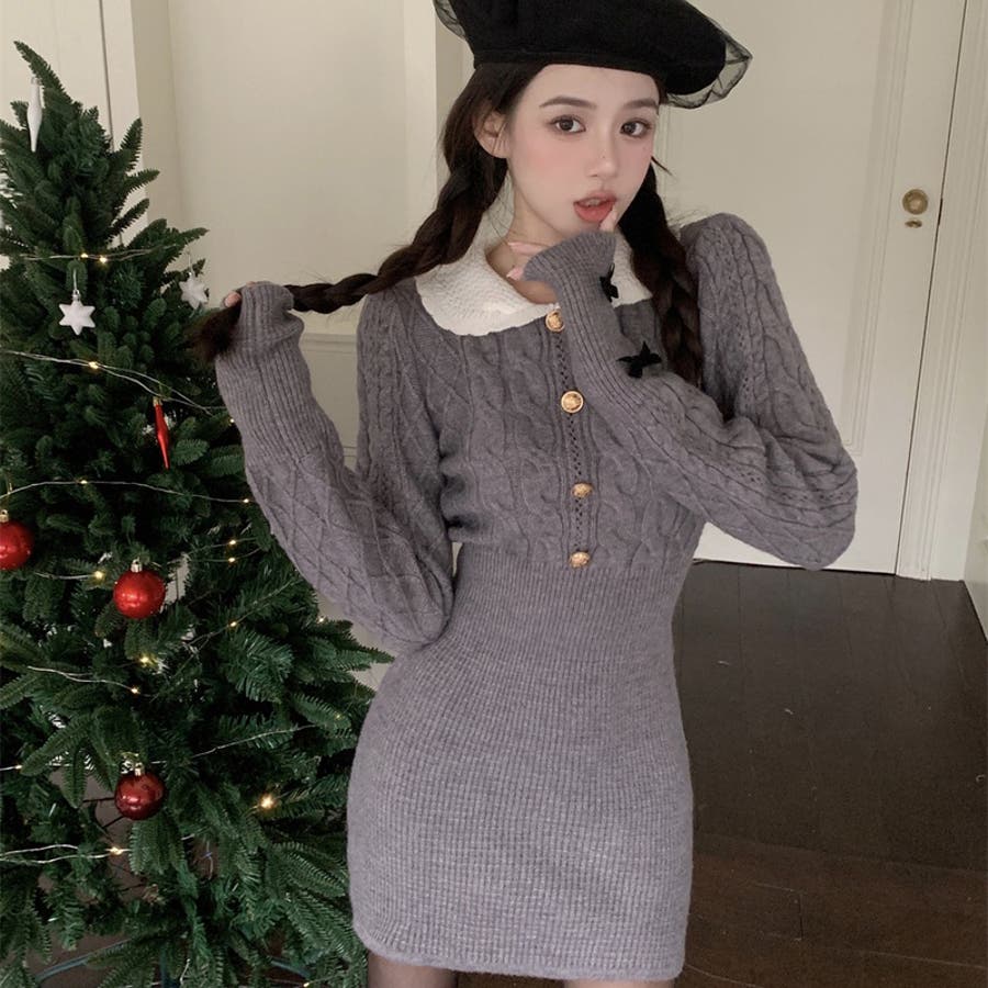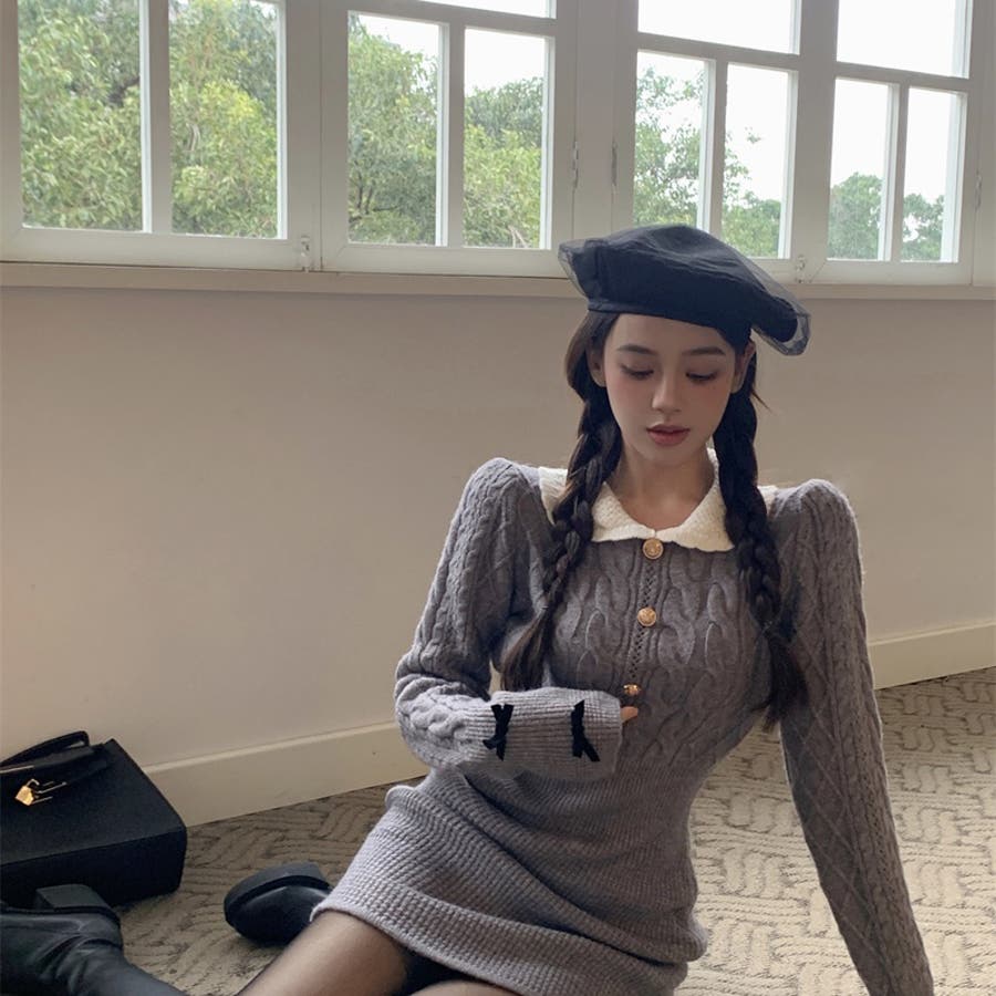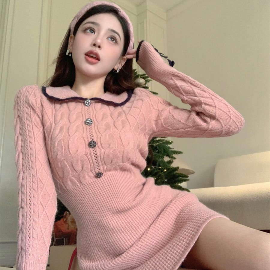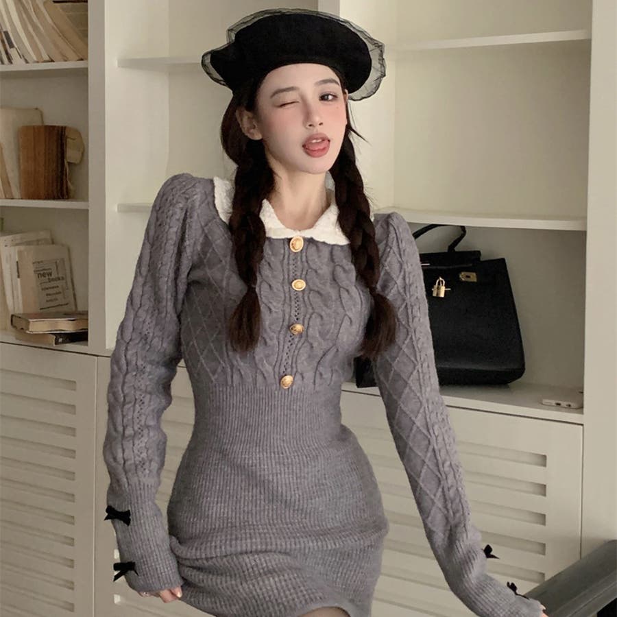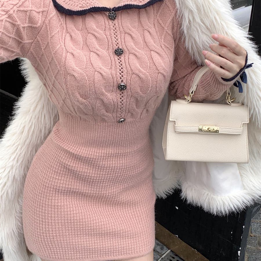 【SHOPLIST限定】韓国風シックな秋新作バイカラーニットタイトワンピース