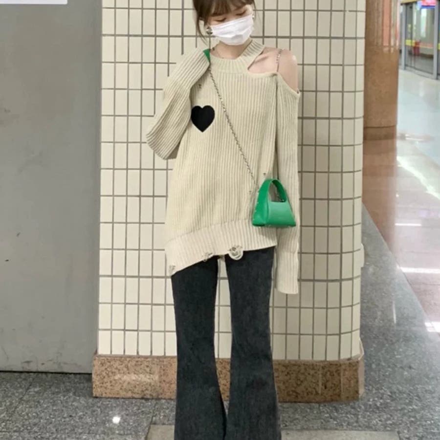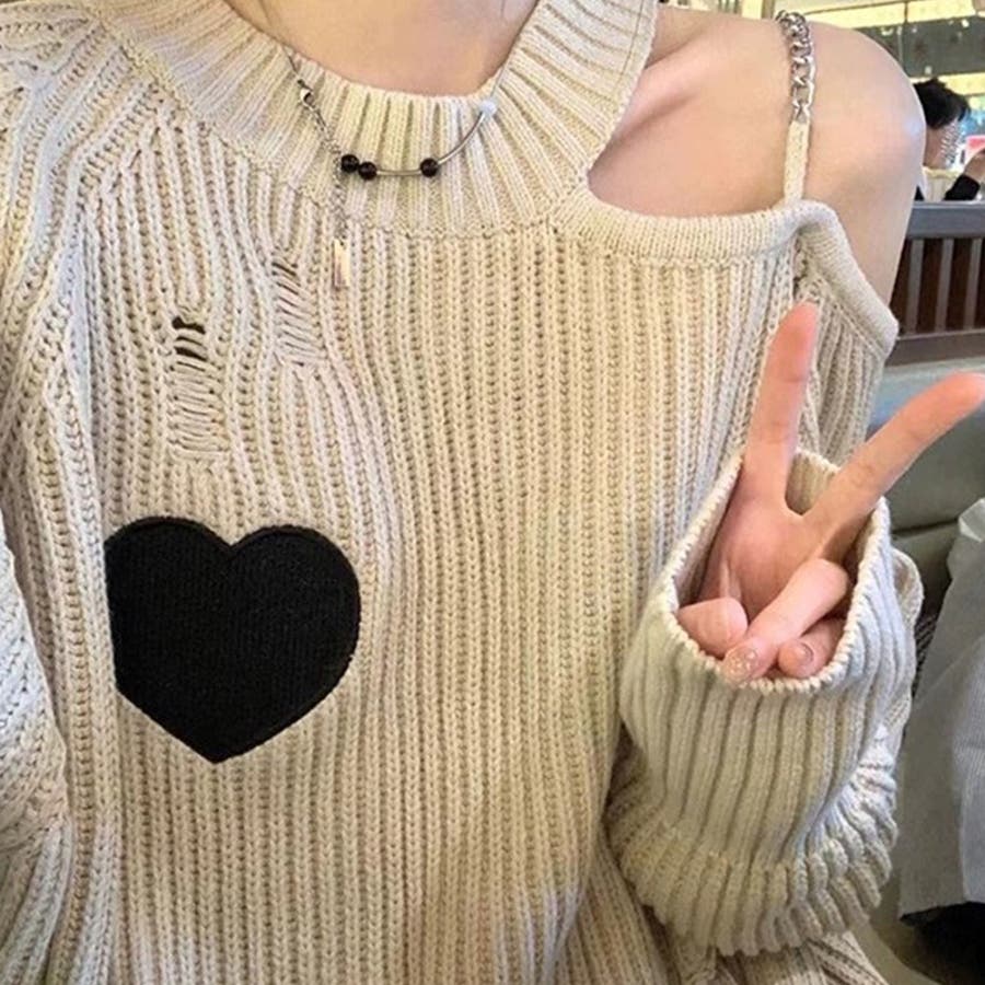 【赤字覚悟!処分セール】秋の優しい雰囲気を持つ柔らかなオフショルダーハート柄セー…