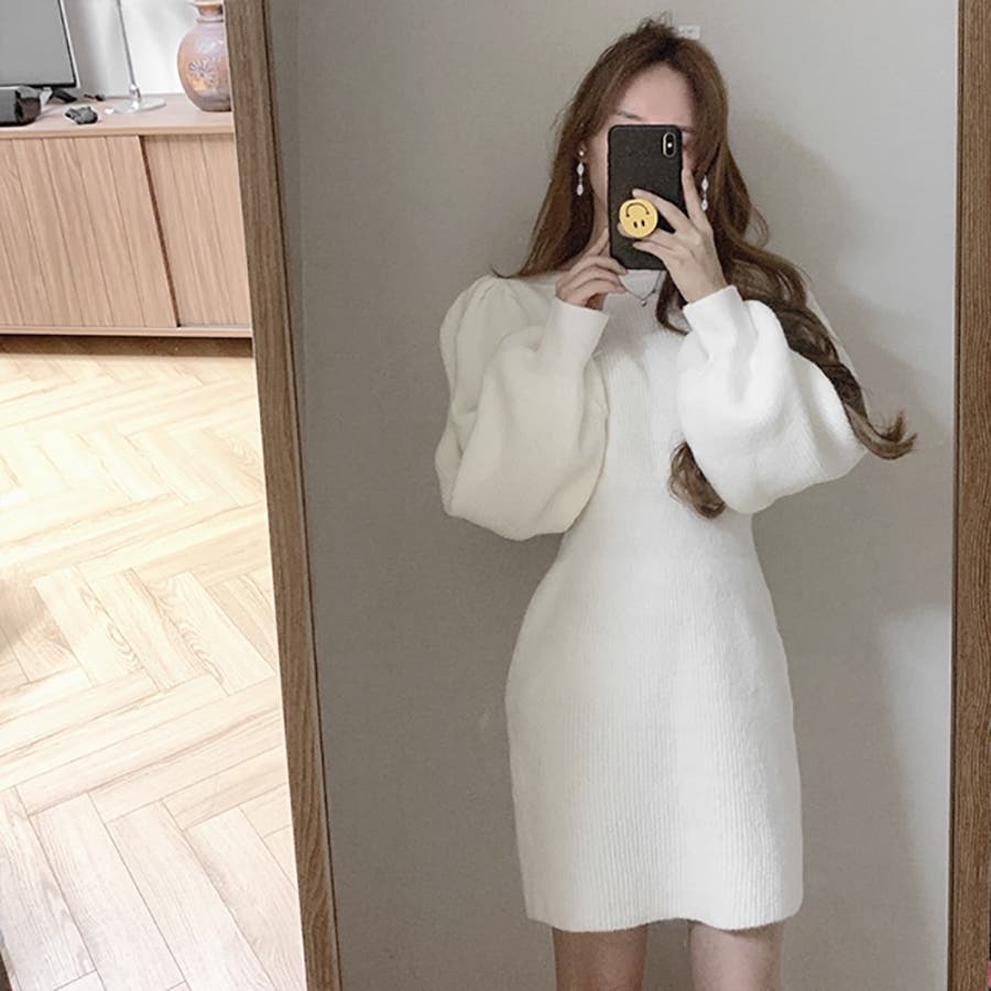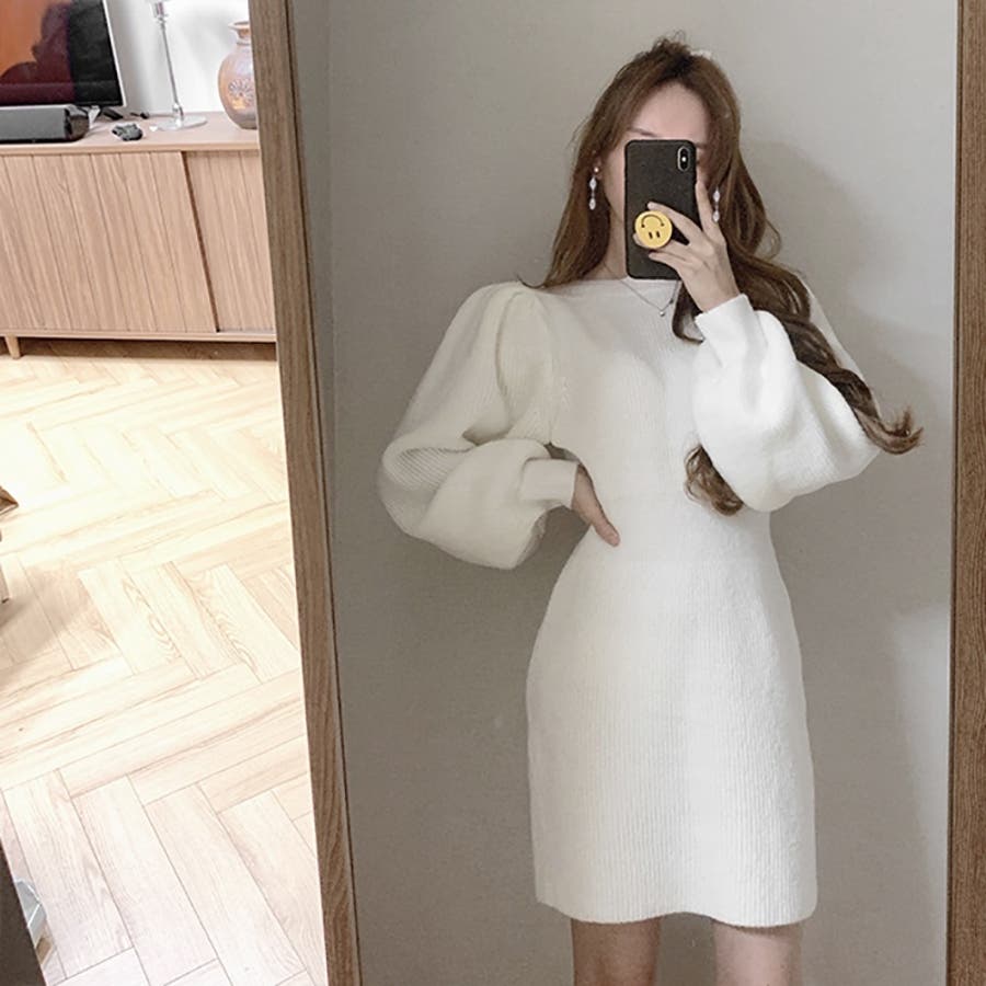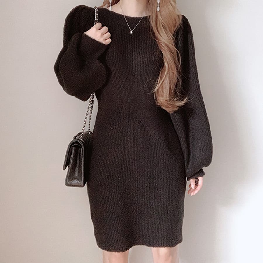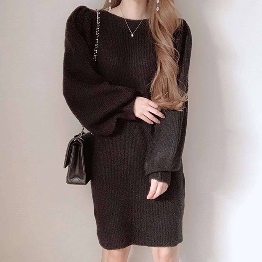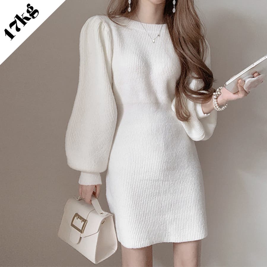 【SHOPLIST限定】パフスリーブリブニットドレス結婚式ゲスト年末スリムニット…