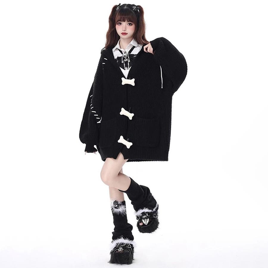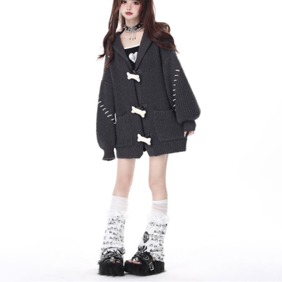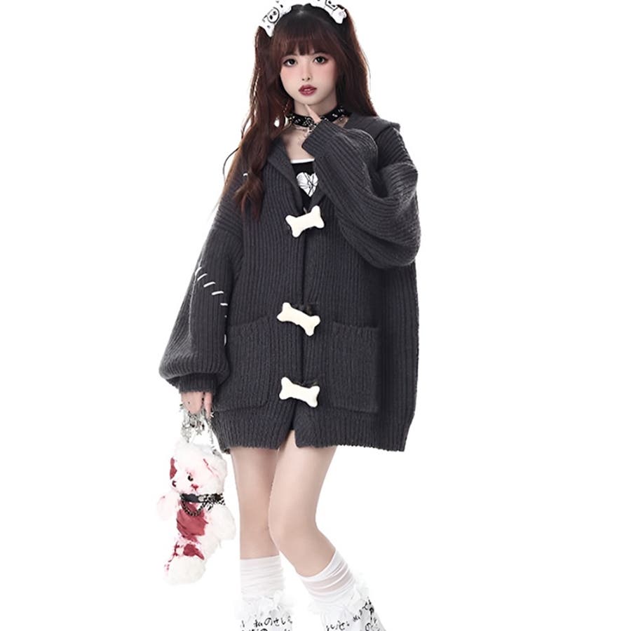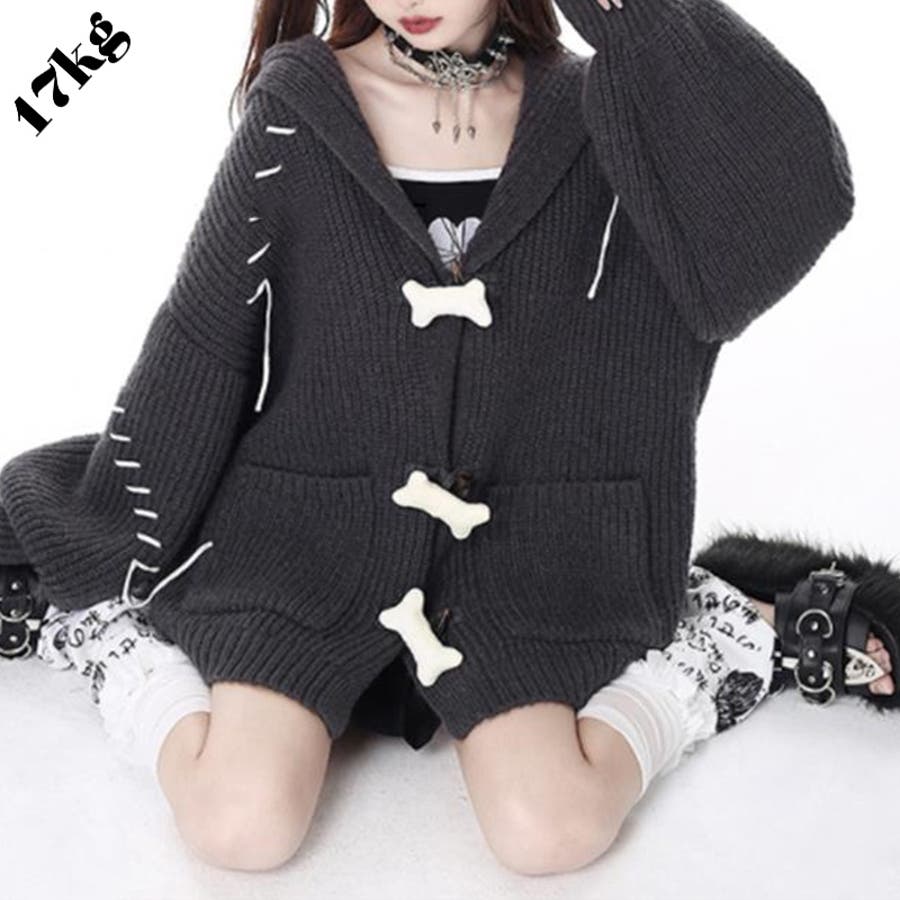 アメリカンパンク風個性的フード付きニットセーターカーディガン