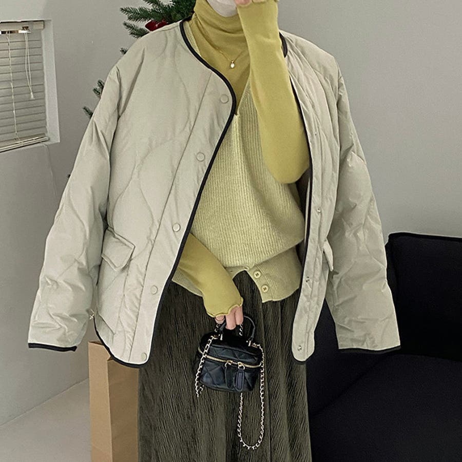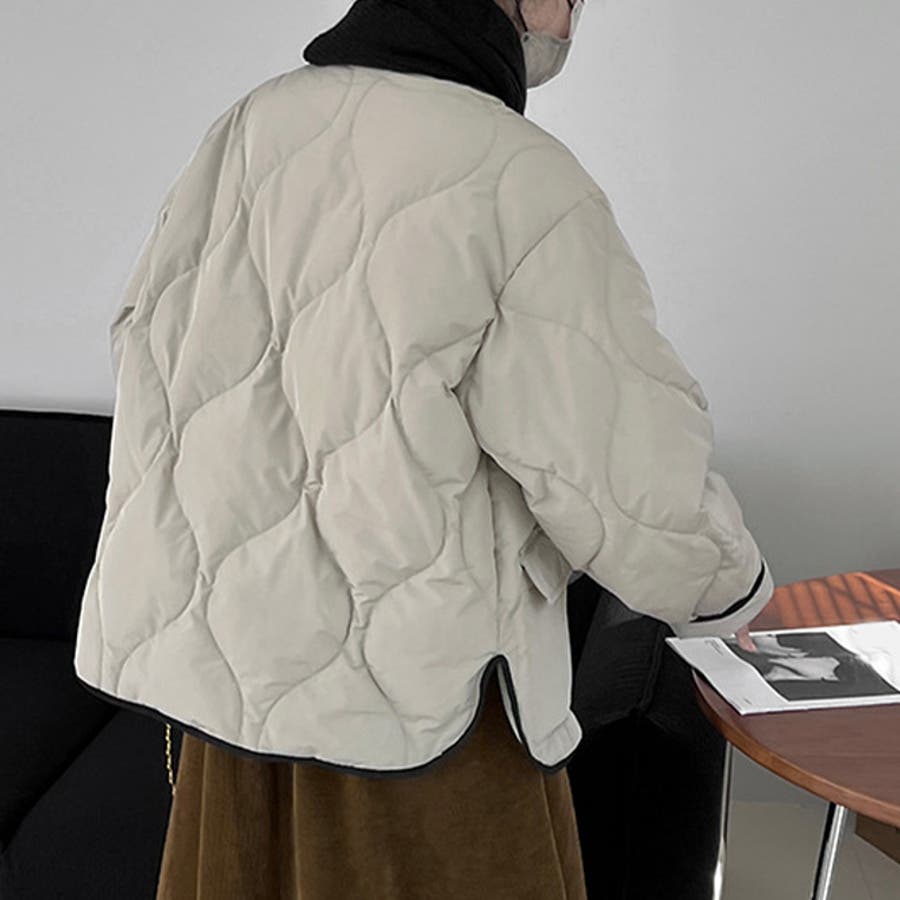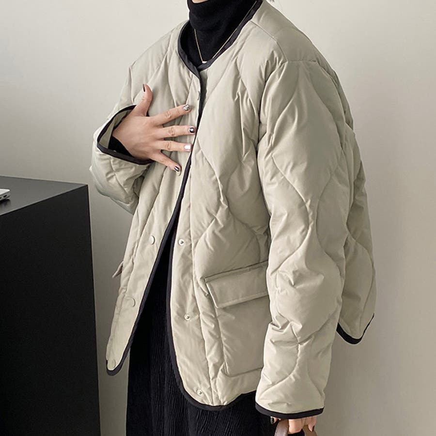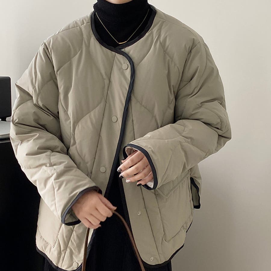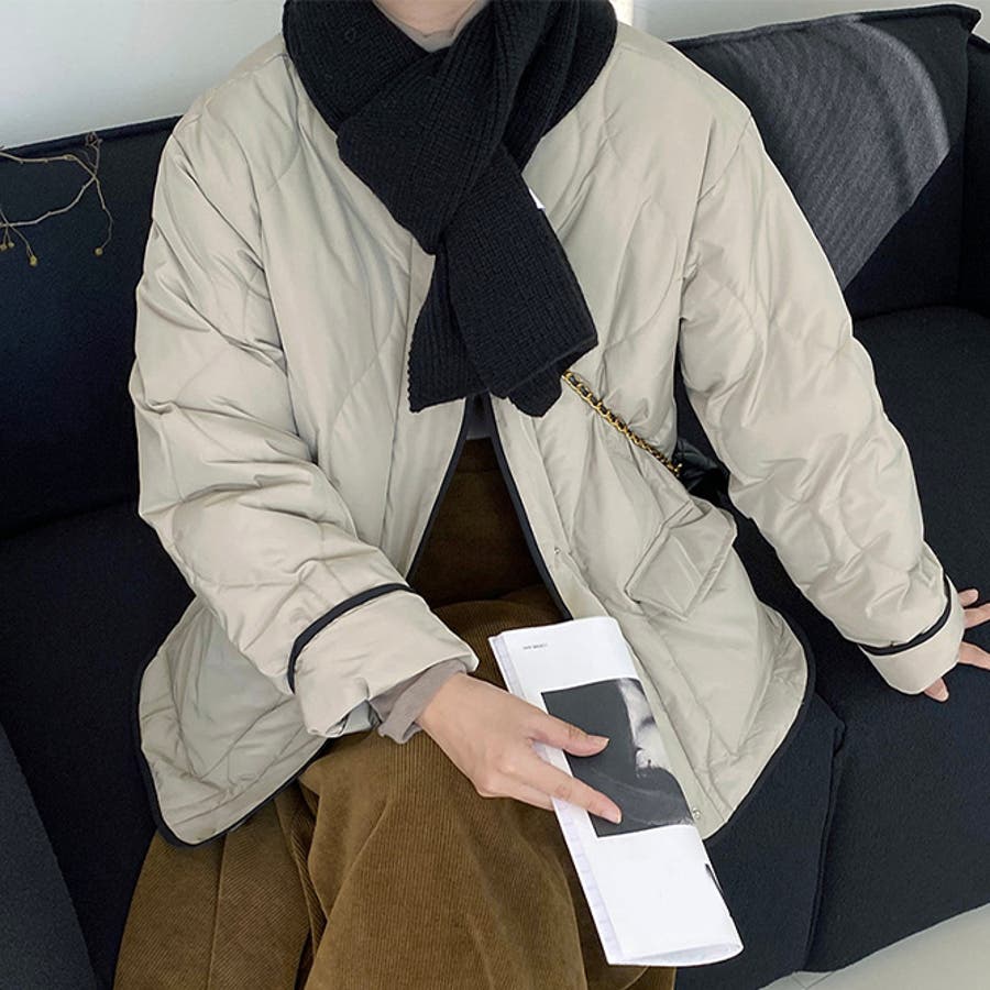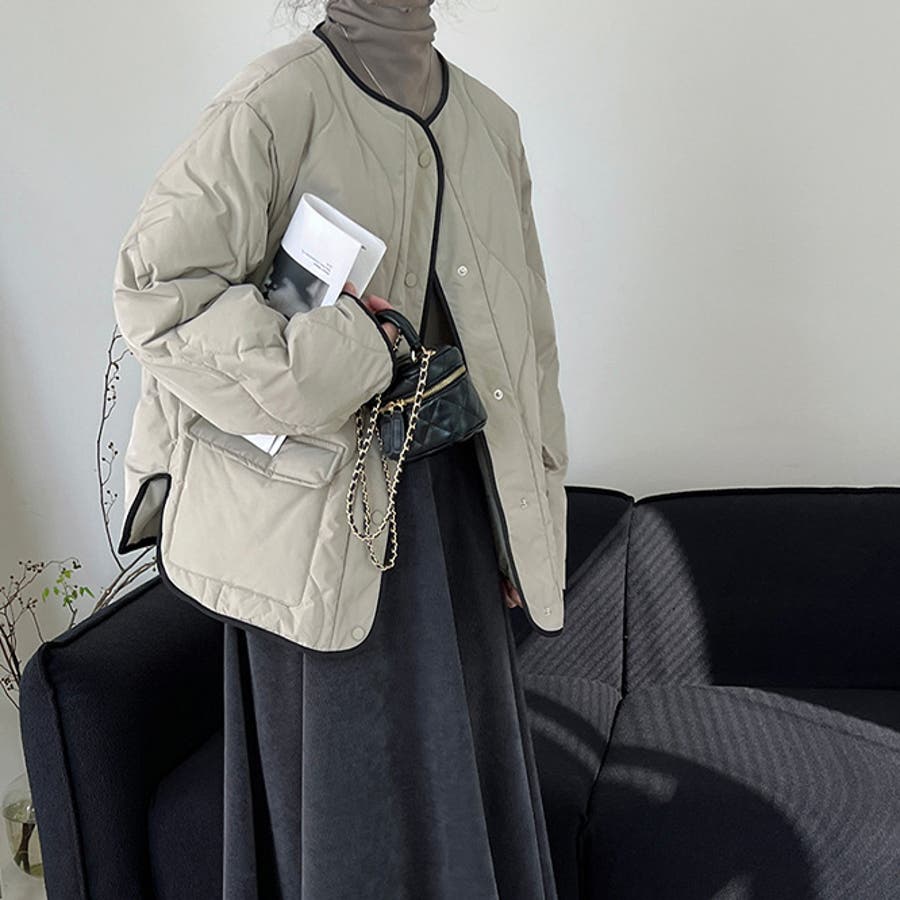 韓国ファッション オフィスバイカラー切替ノーカラー ダイヤ柄コート
