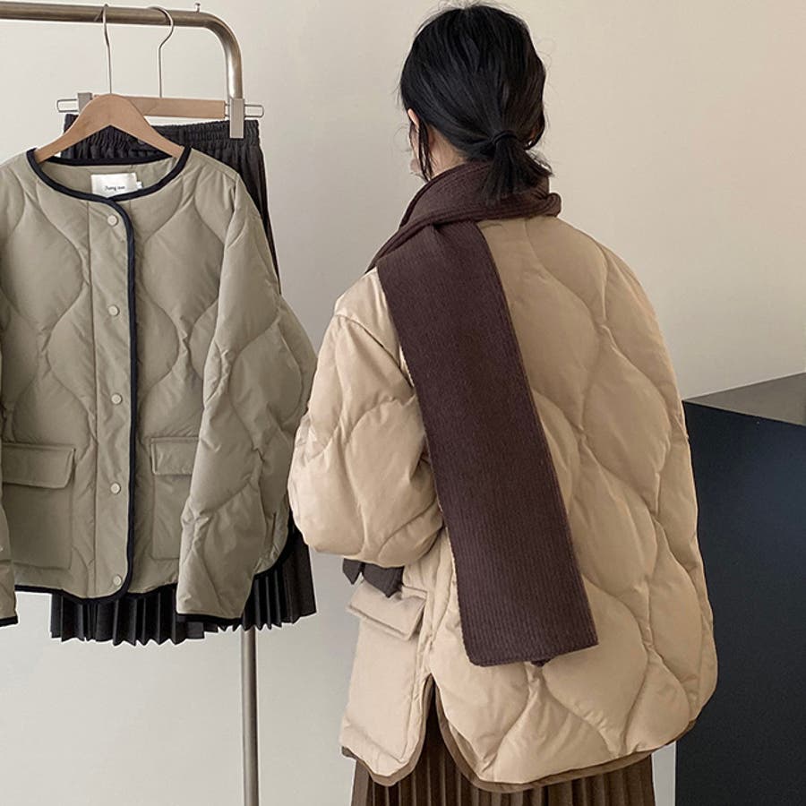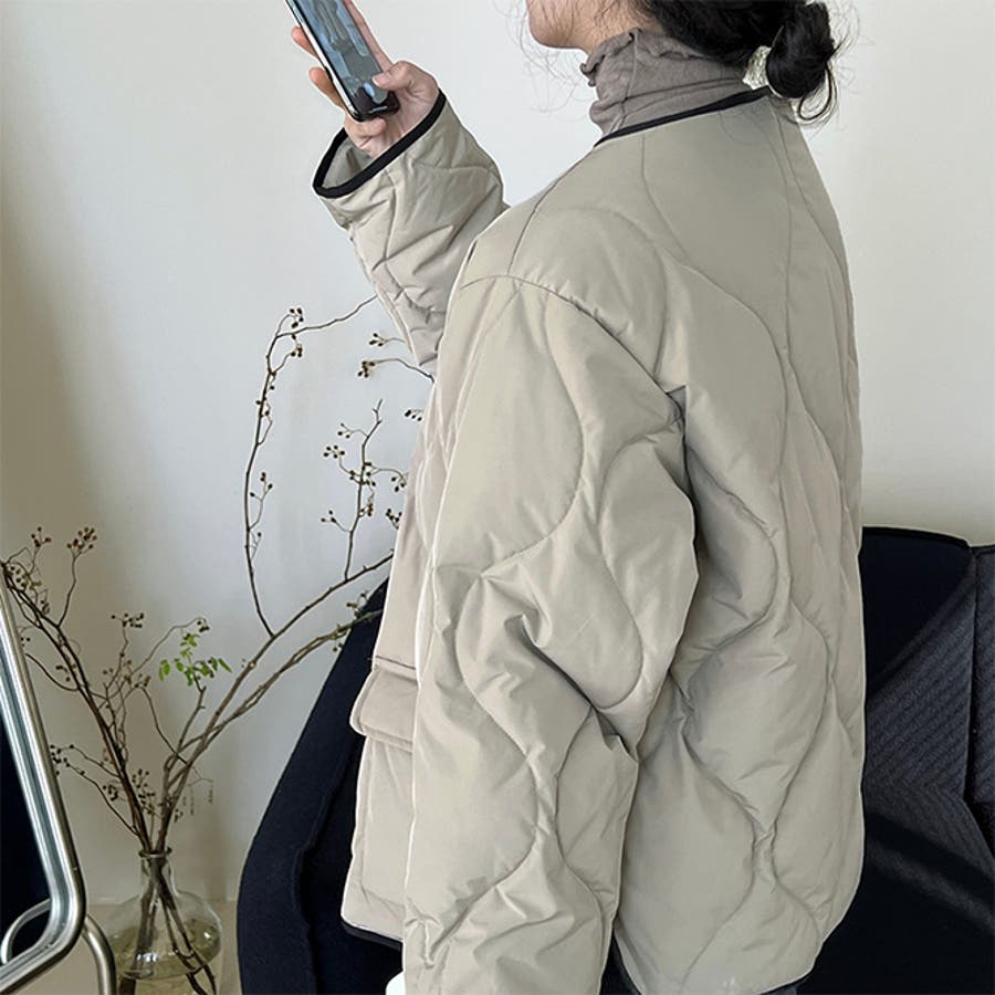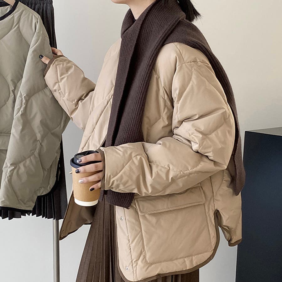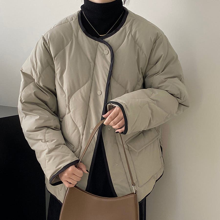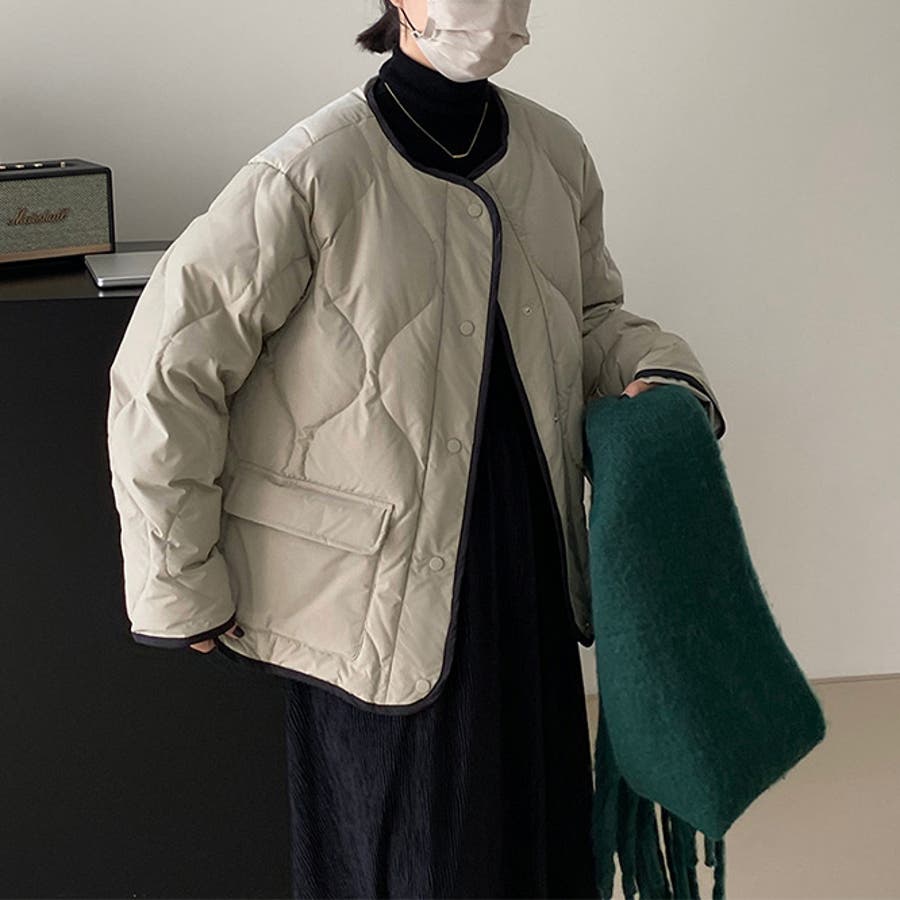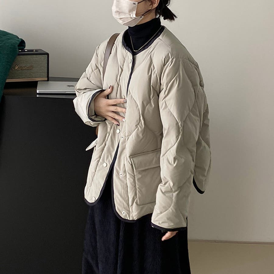 韓国ファッション オフィスバイカラー切替ノーカラー ダイヤ柄コート