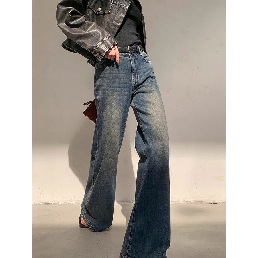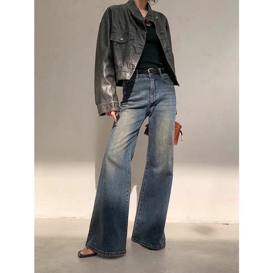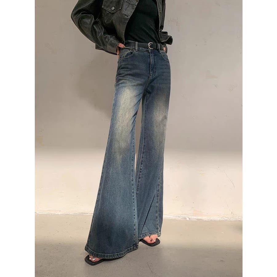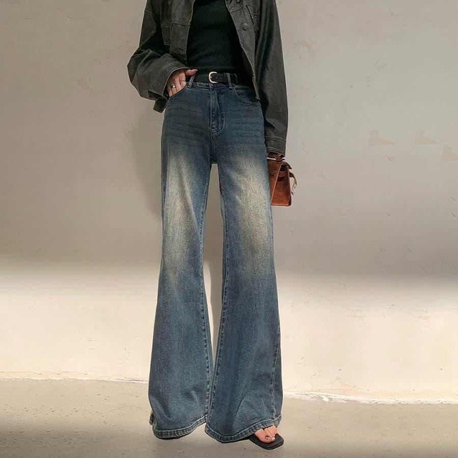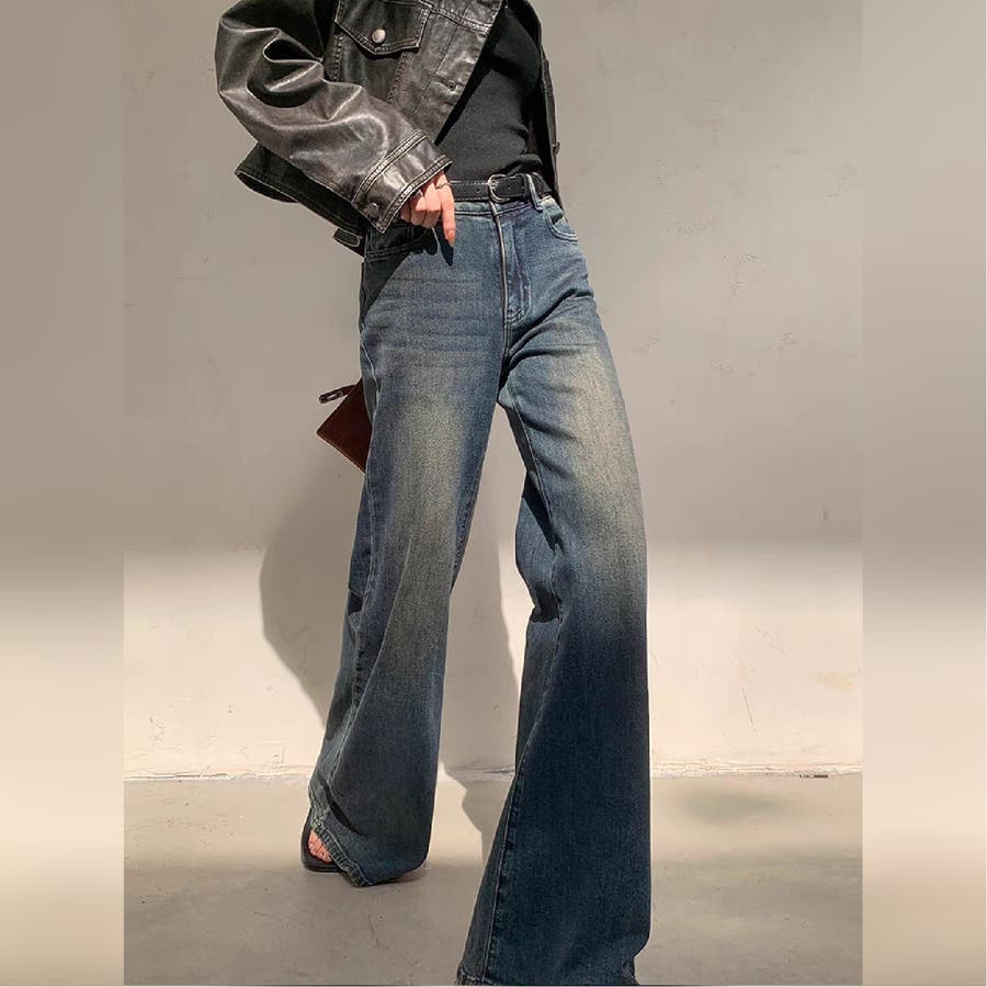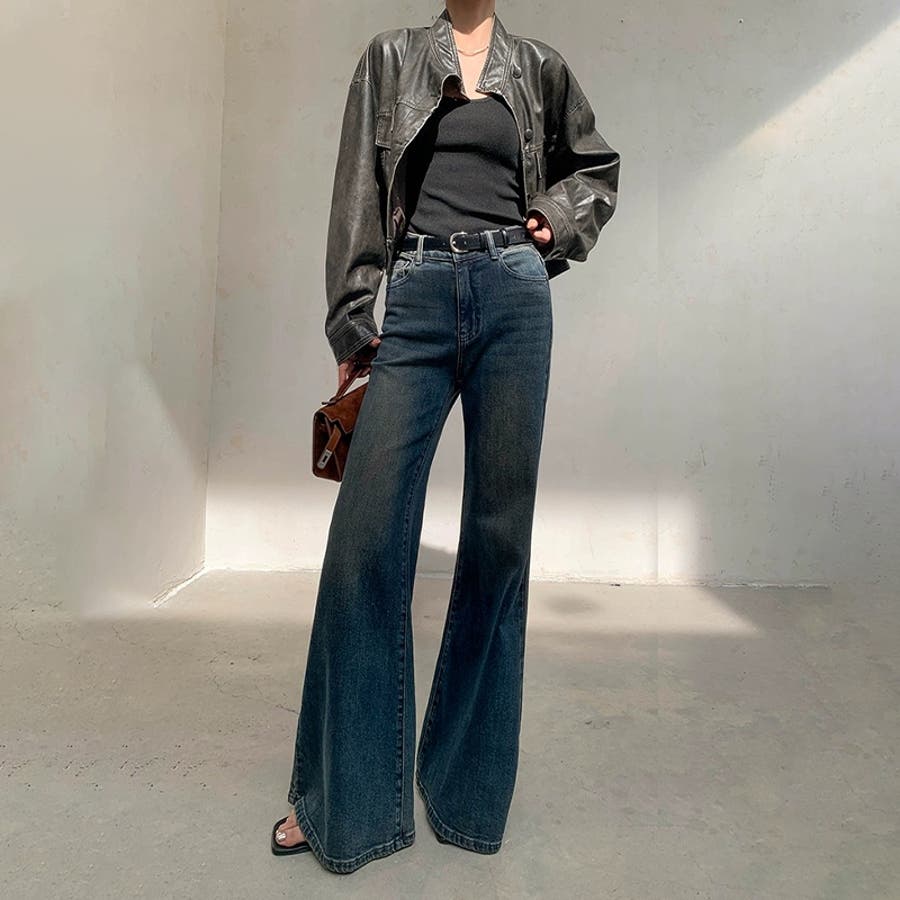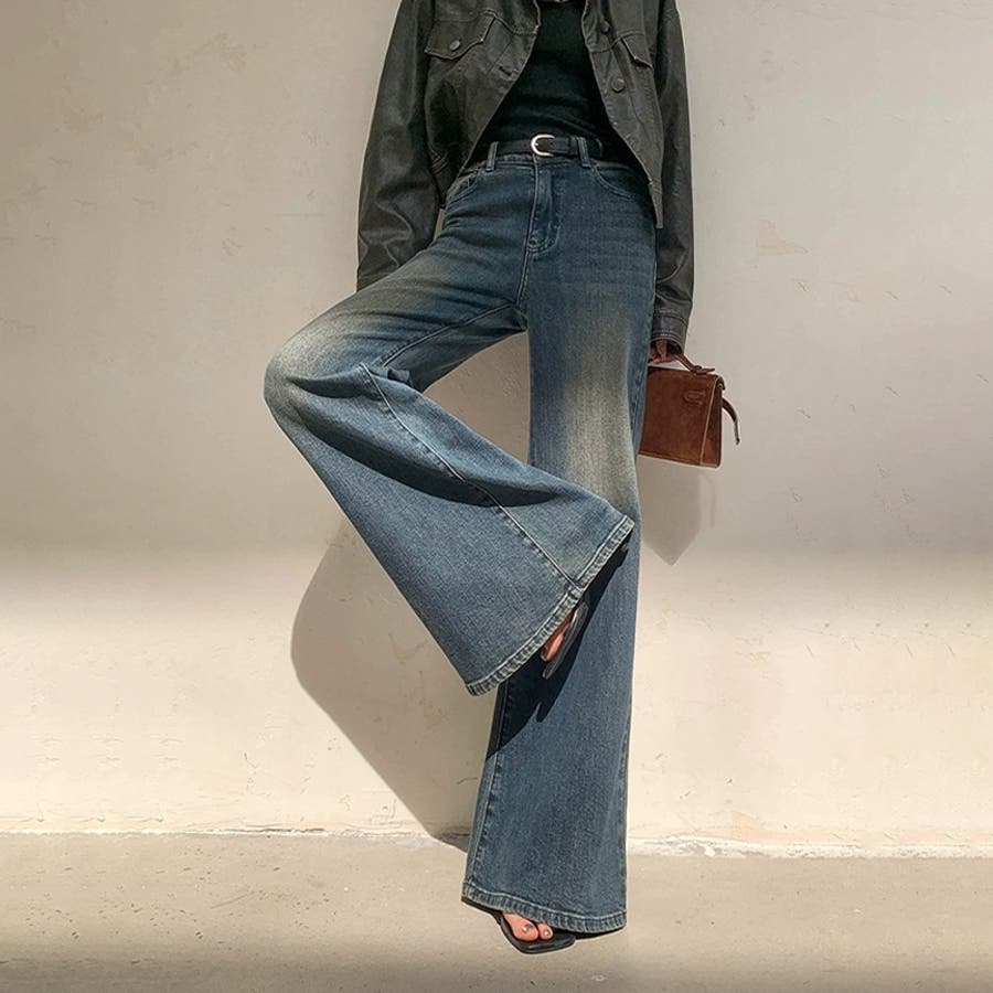 ファッション性と微妙なフレアラインが特徴。フレアワイドレッグデニムパンツ