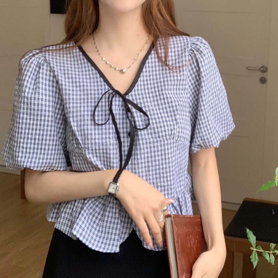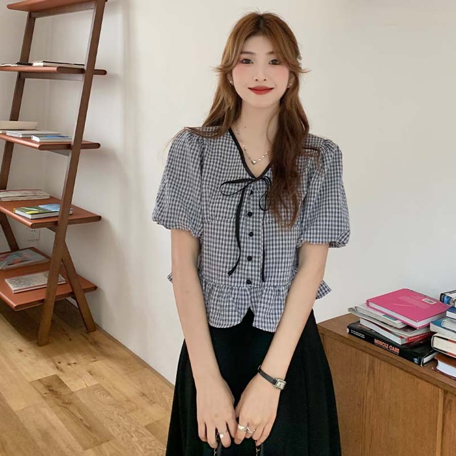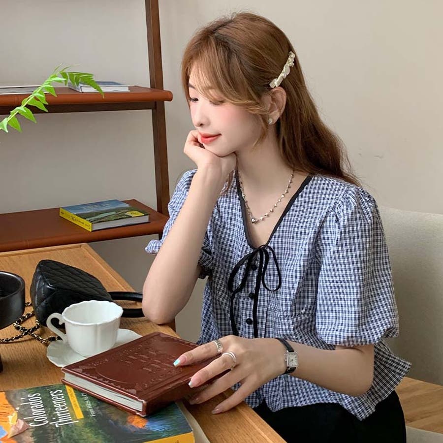 【SHOPLIST限定】チェック柄のVネックショートスリーブシャツ