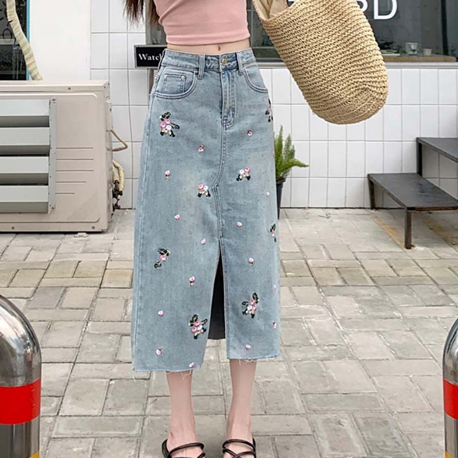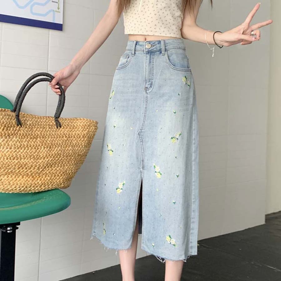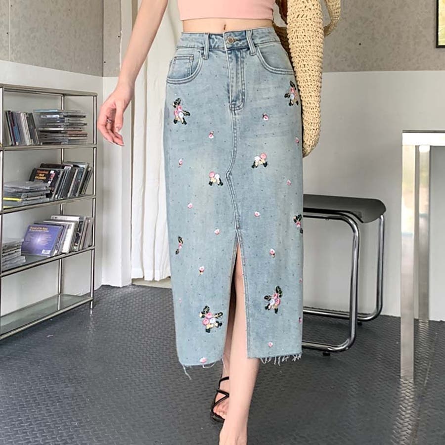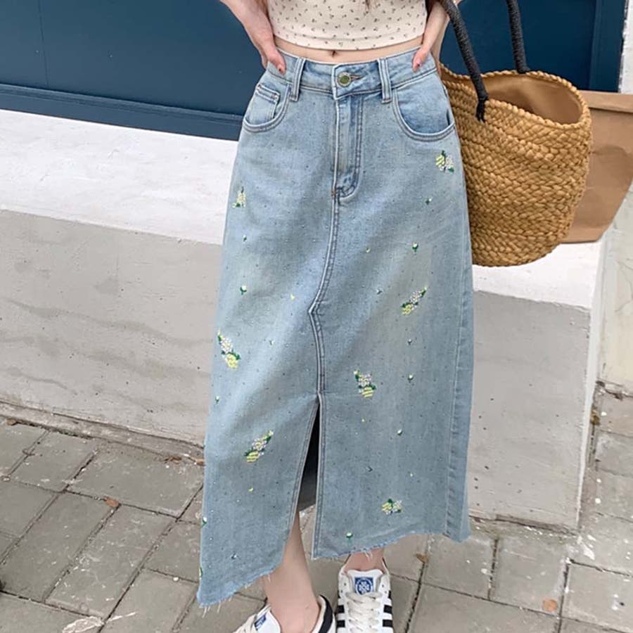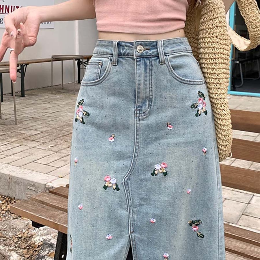独自の雰囲気を演出。刺繍デニムスカート。ラインストーン装飾