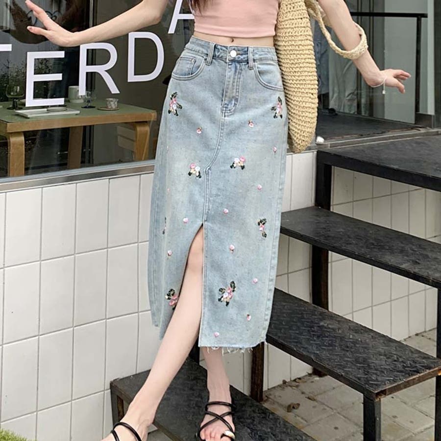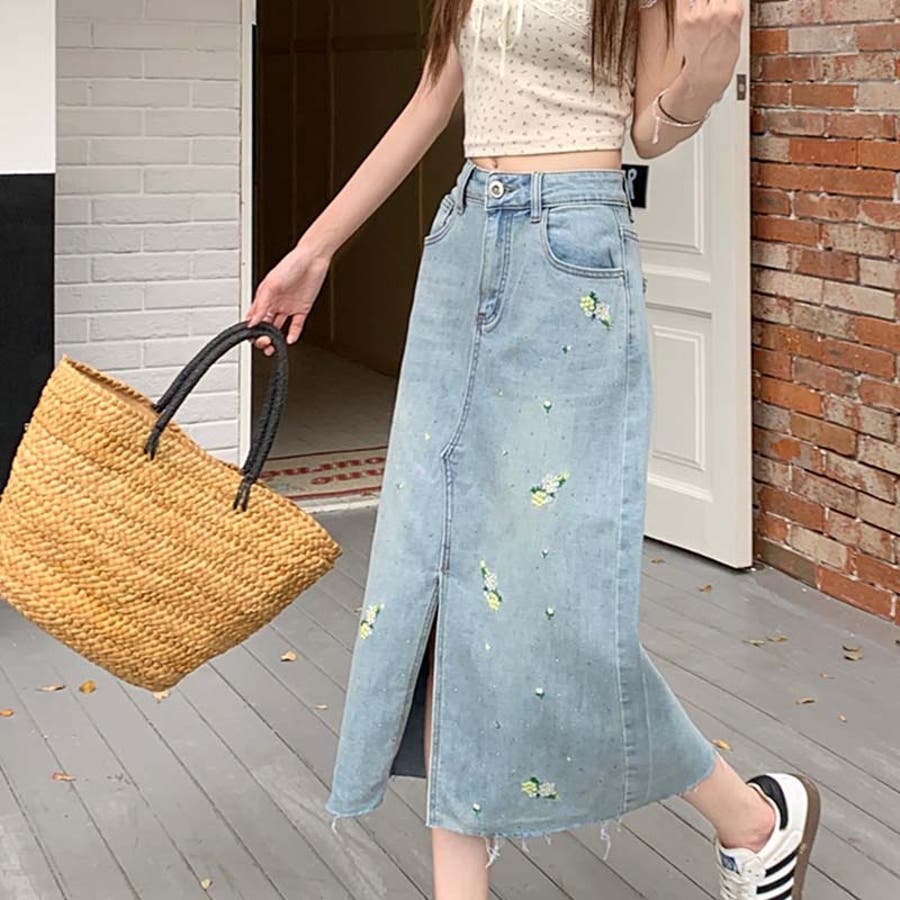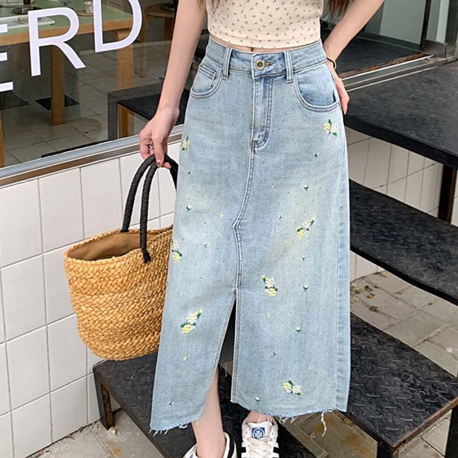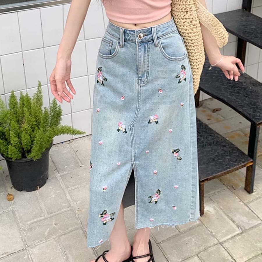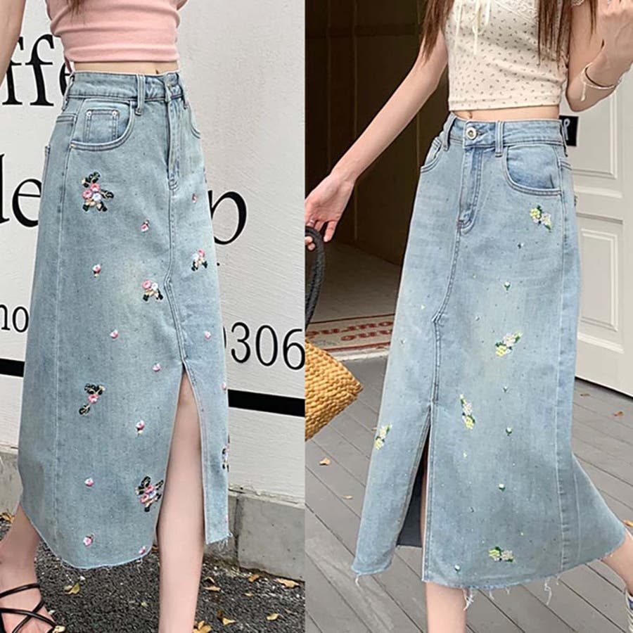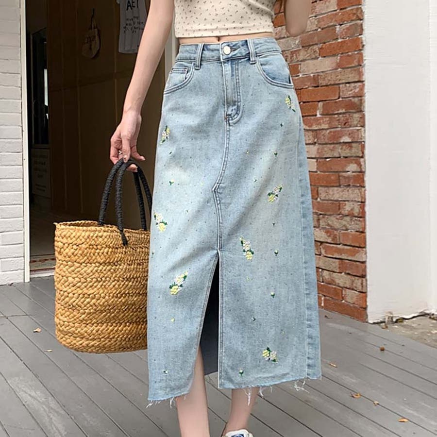 独自の雰囲気を演出。刺繍デニムスカート。ラインストーン装飾