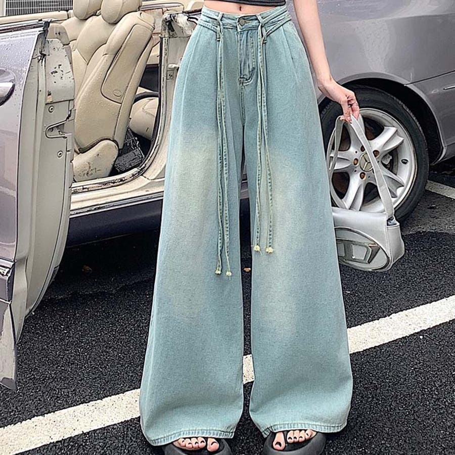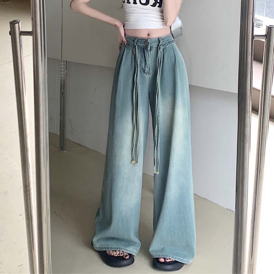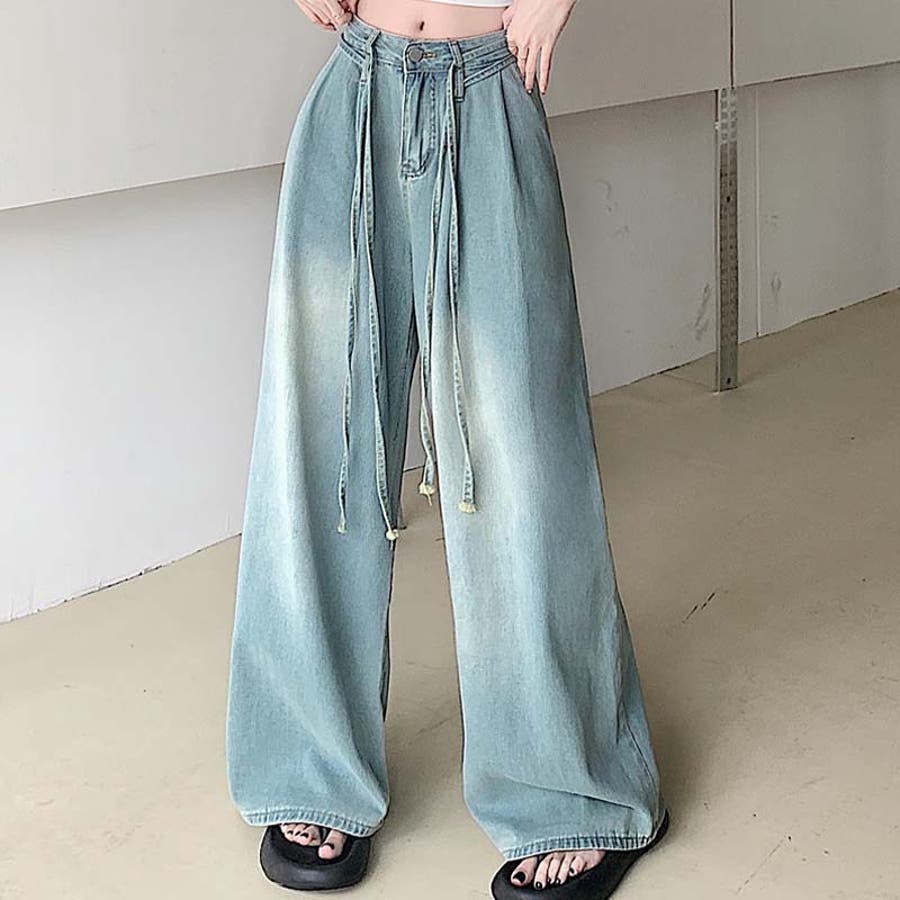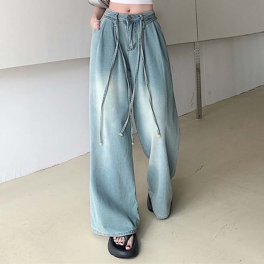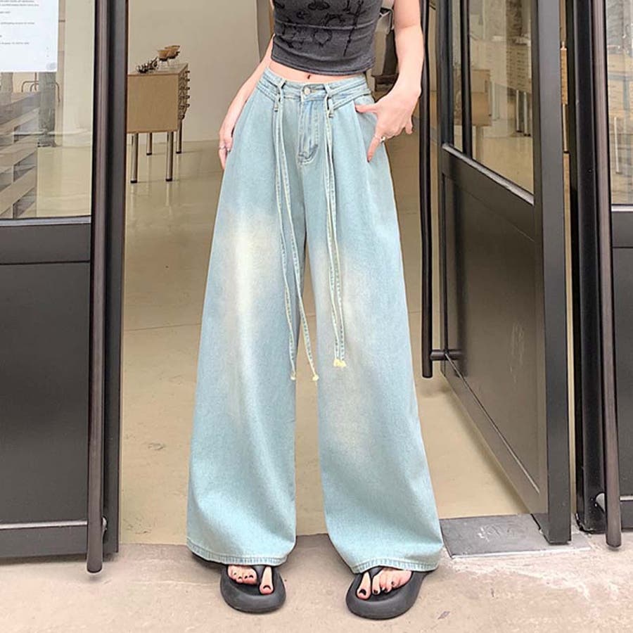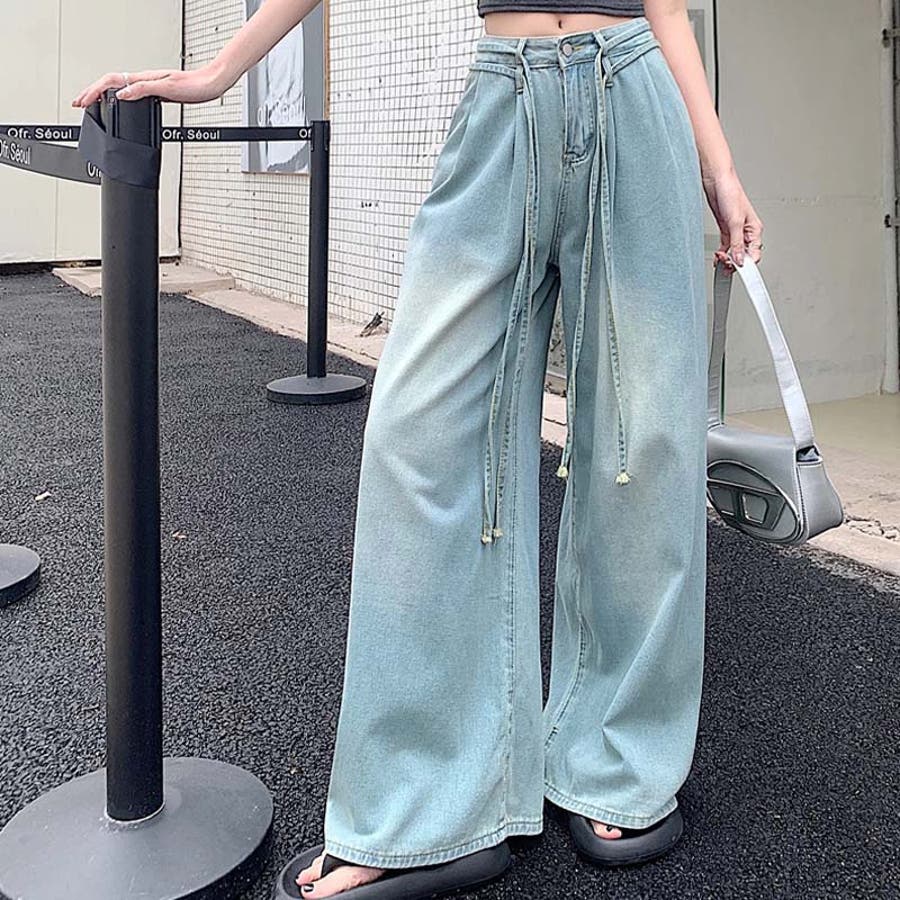 スリム効果のある!ドローストリング付きデニムワイドパンツ