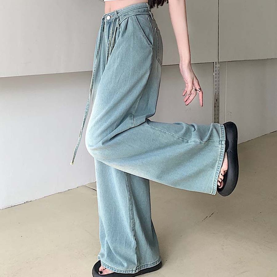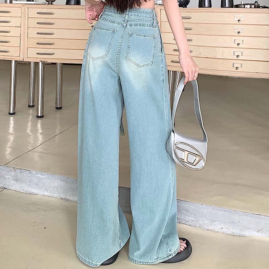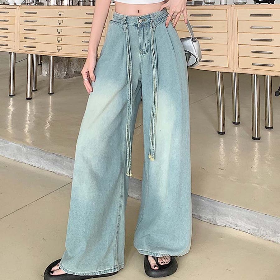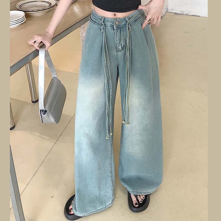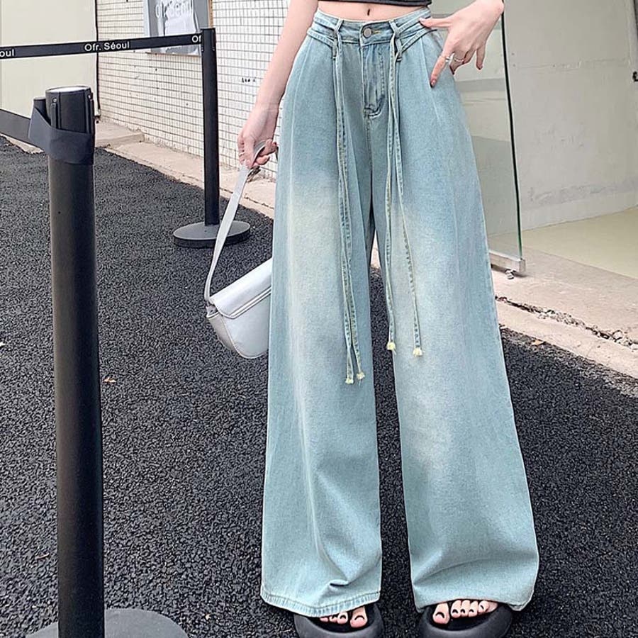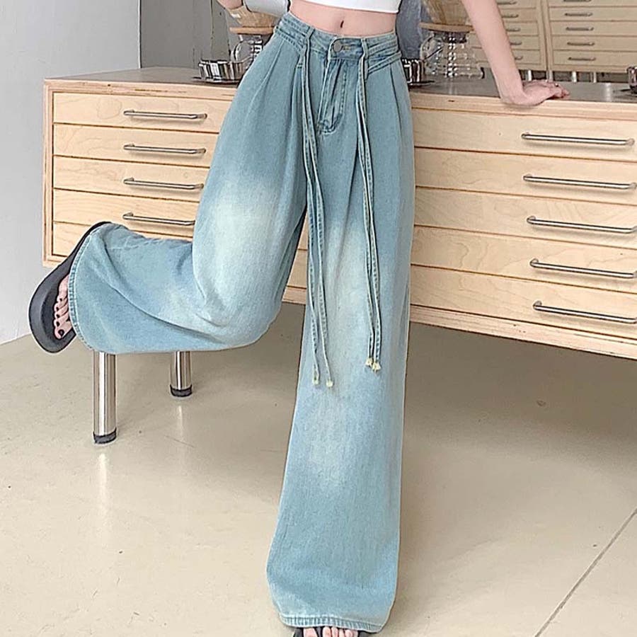 スリム効果のある!ドローストリング付きデニムワイドパンツ