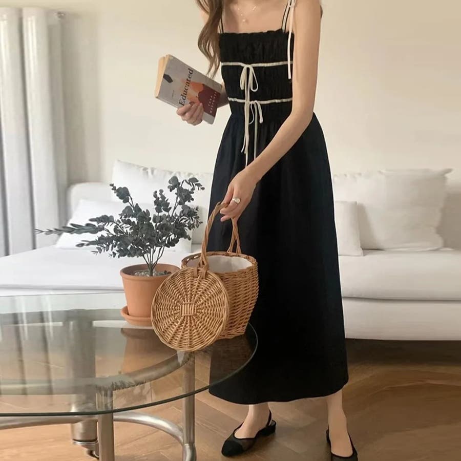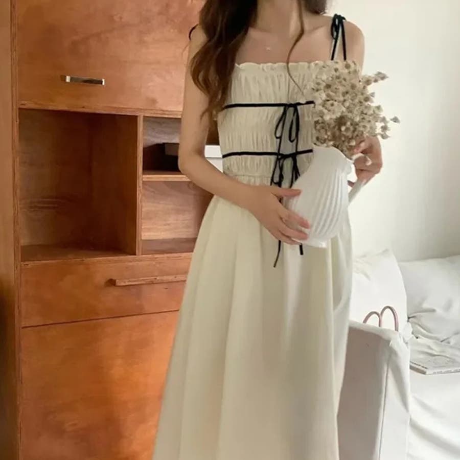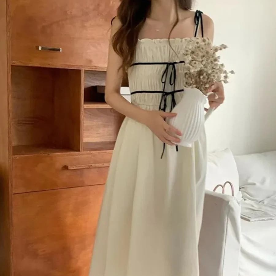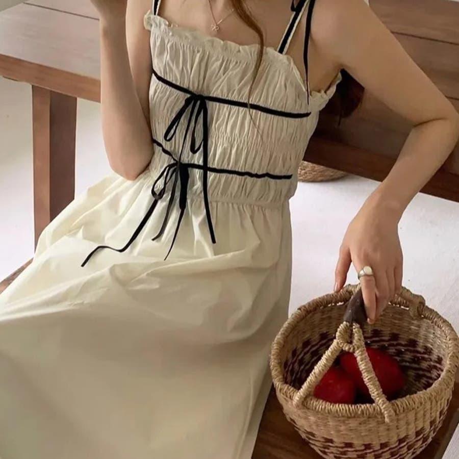 甘くて若々しい印象をボウタイのカラーパターンノースリープのストラップワンピース