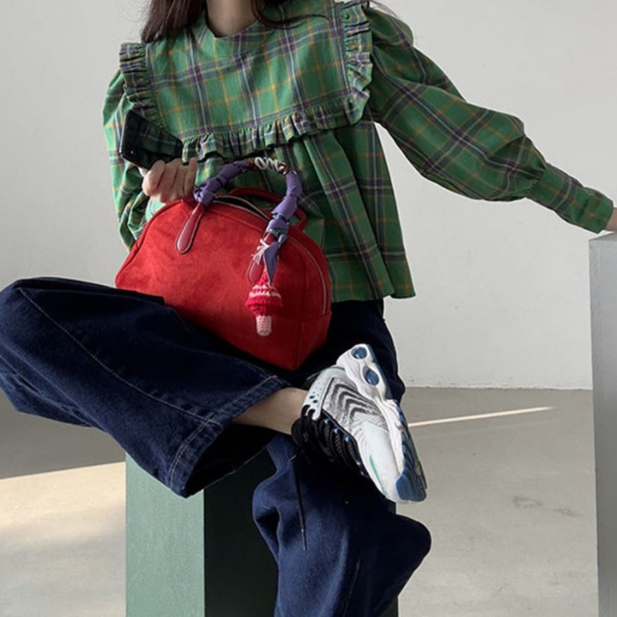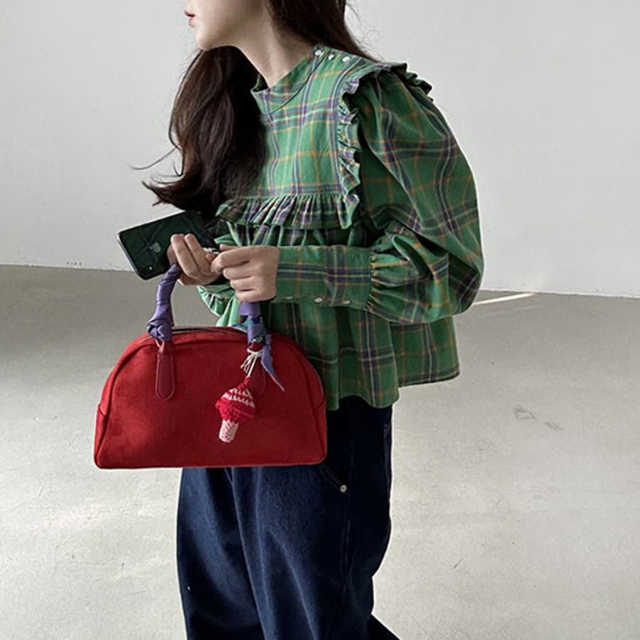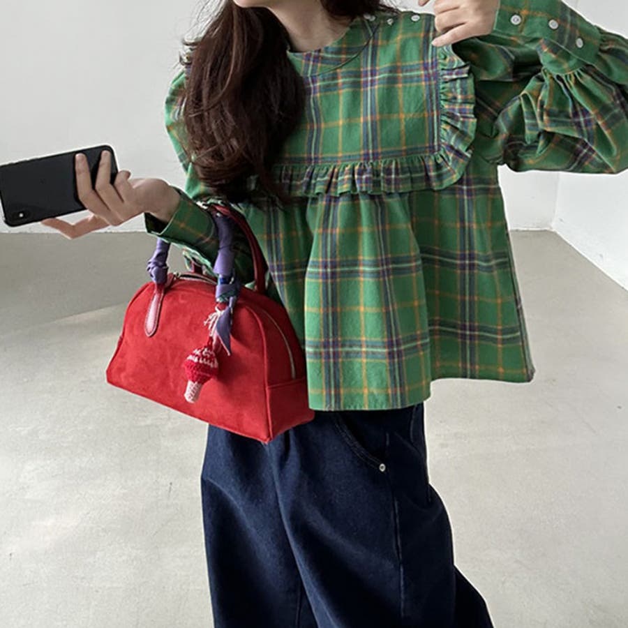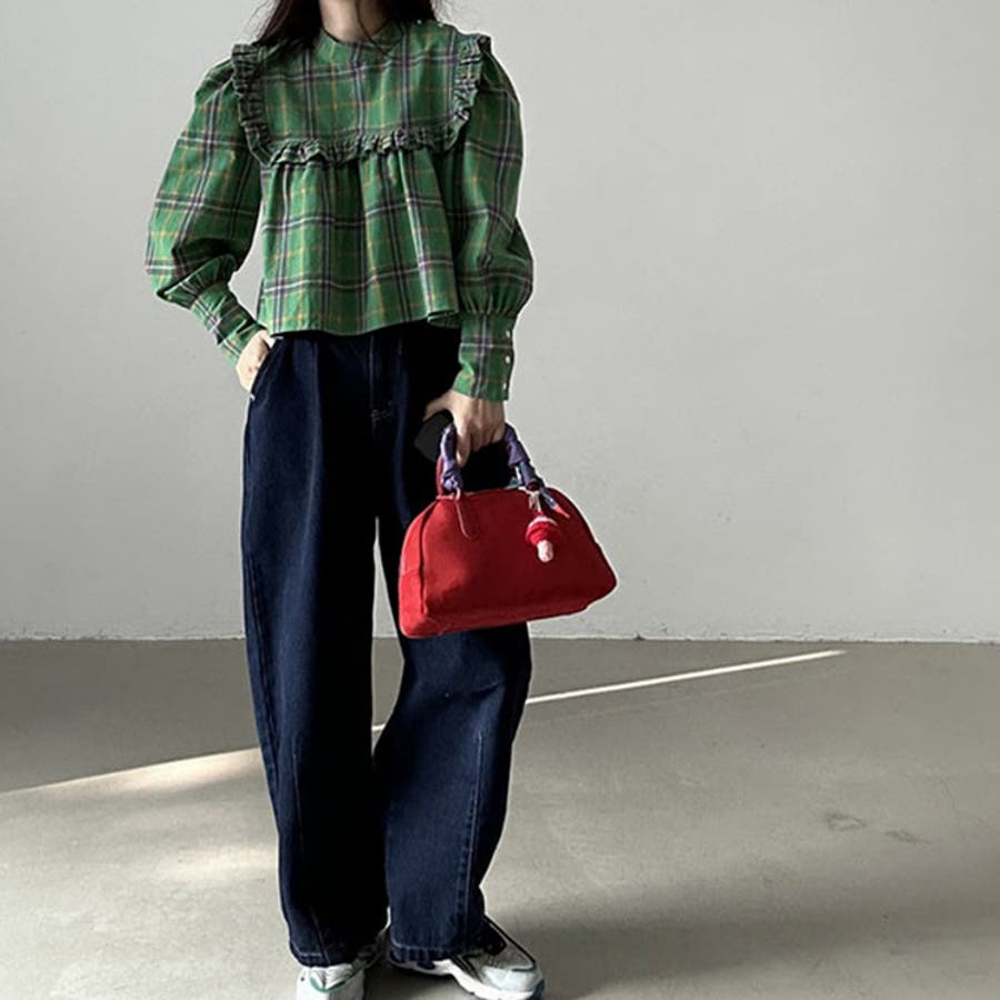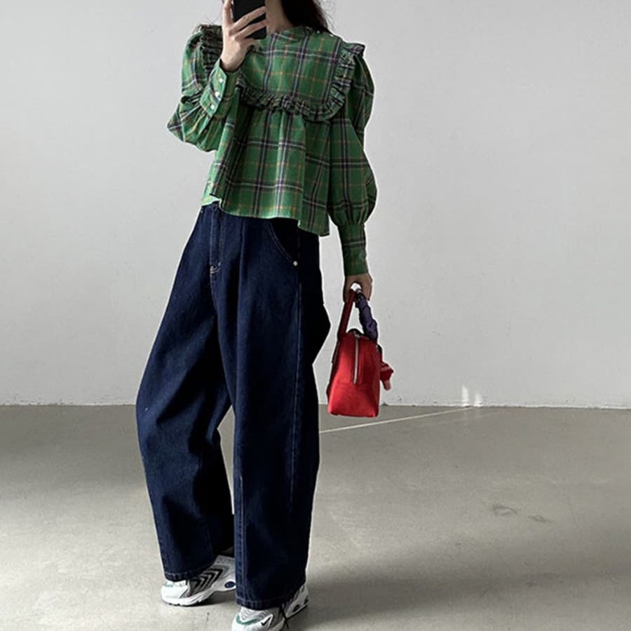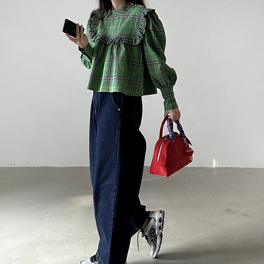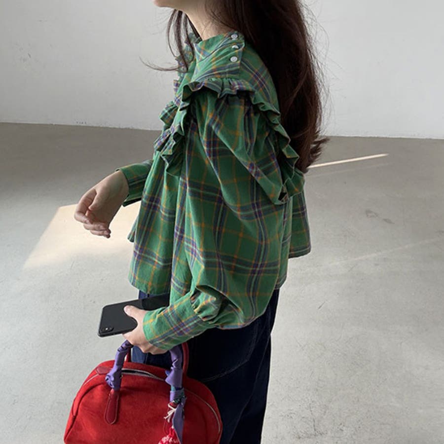 可愛らしい大人スタイルグリーンチェックのスリーブシャツ