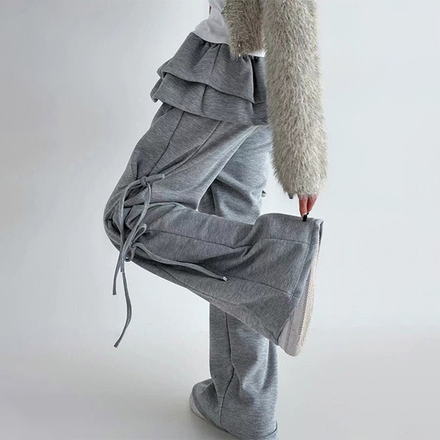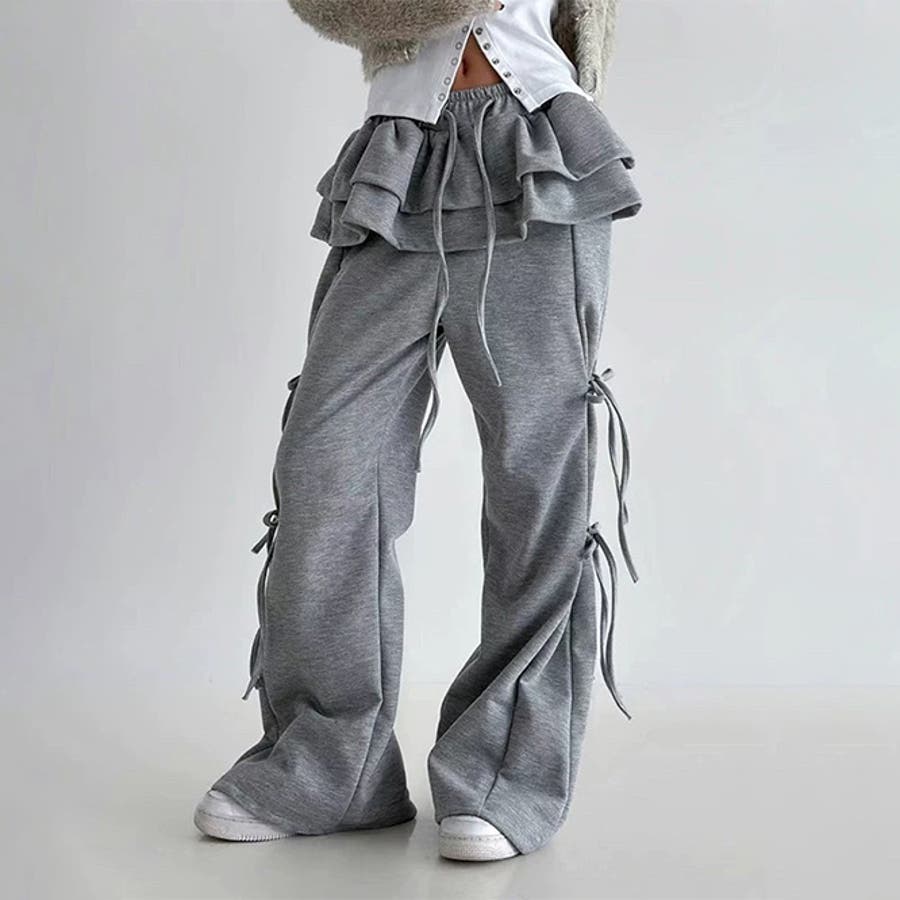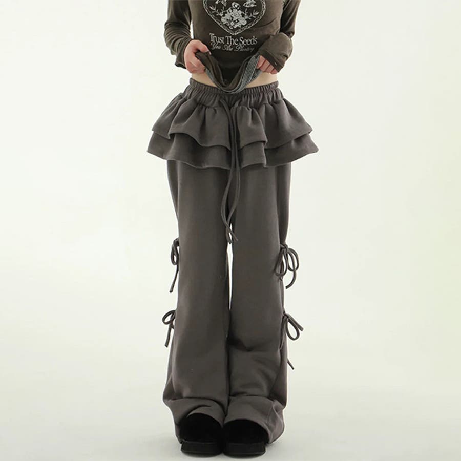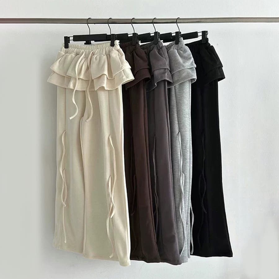 レースフリル裾&タイアップデザイン!ストレッチ素材のゆったりワイドパンツ