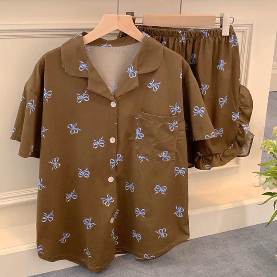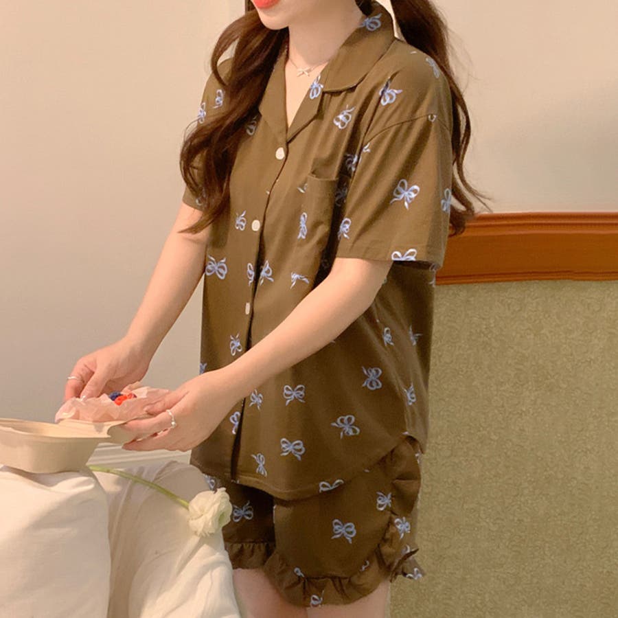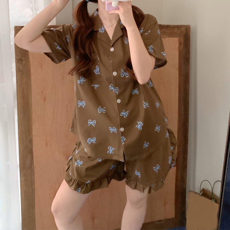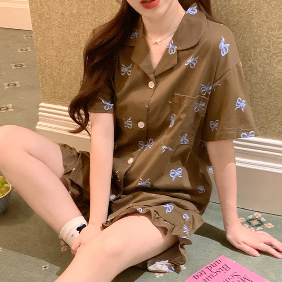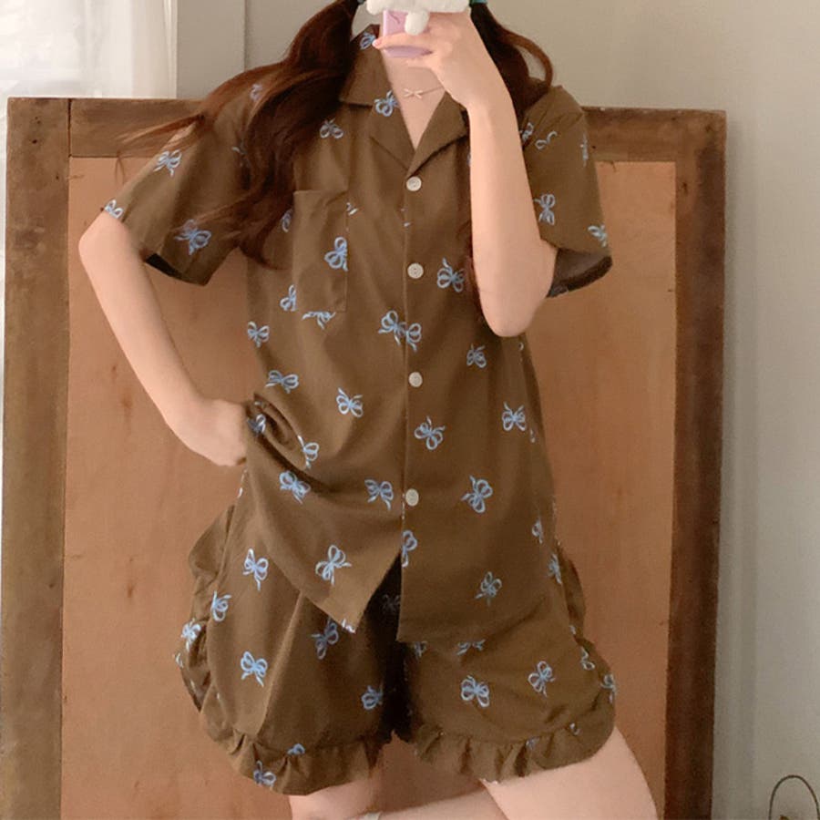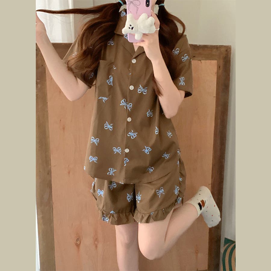 2025インスタ新作ボウプリントが彩るルームウェアセットパジャマ