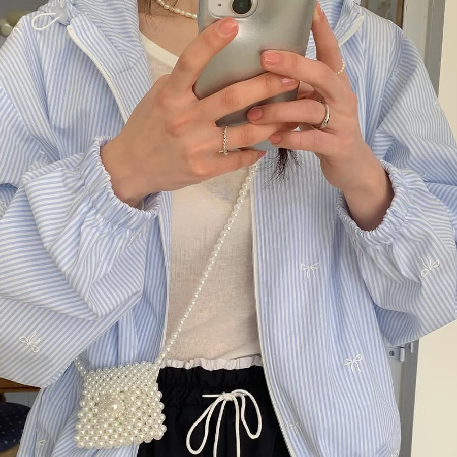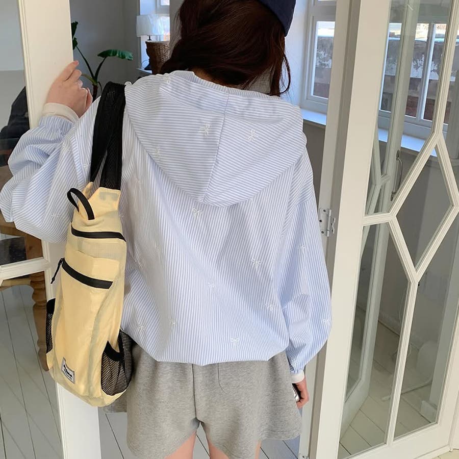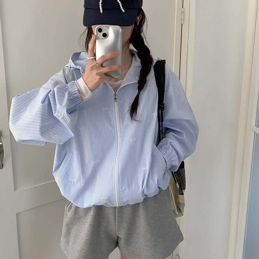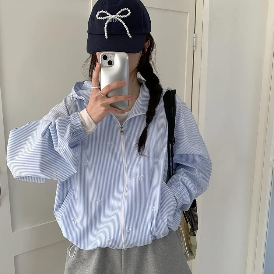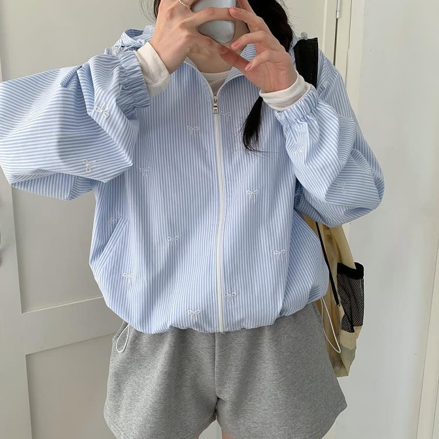 【赤字覚悟!処分セール】スイートなリボン刺繍入りストライプフード付きUVカットコ…