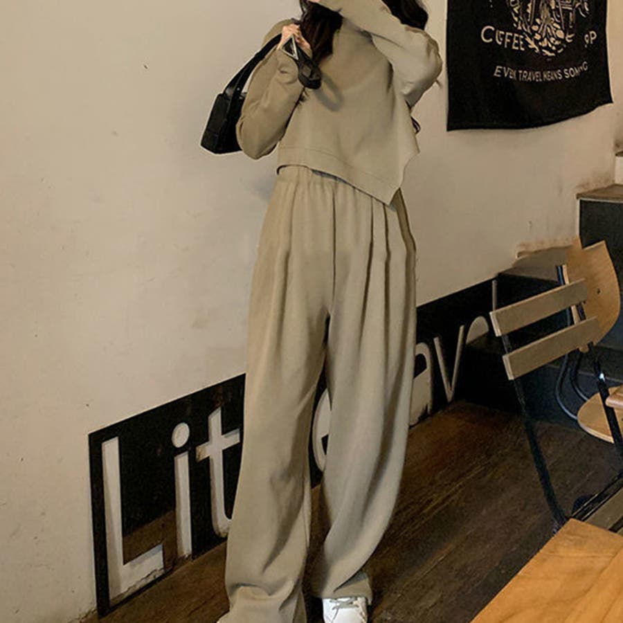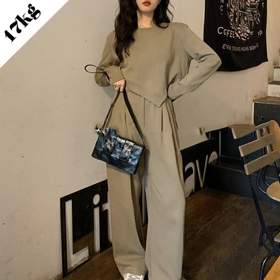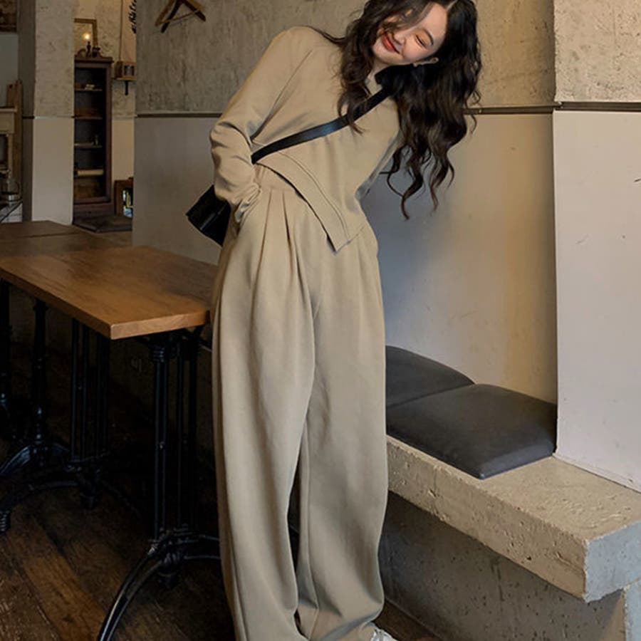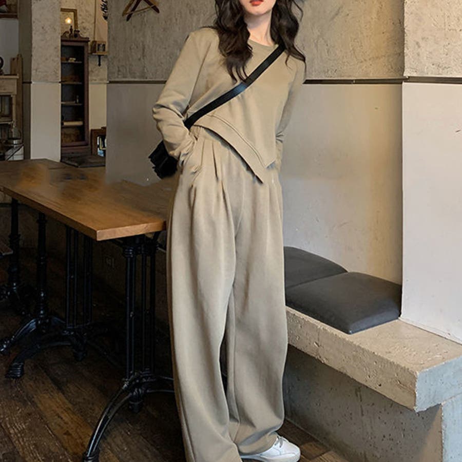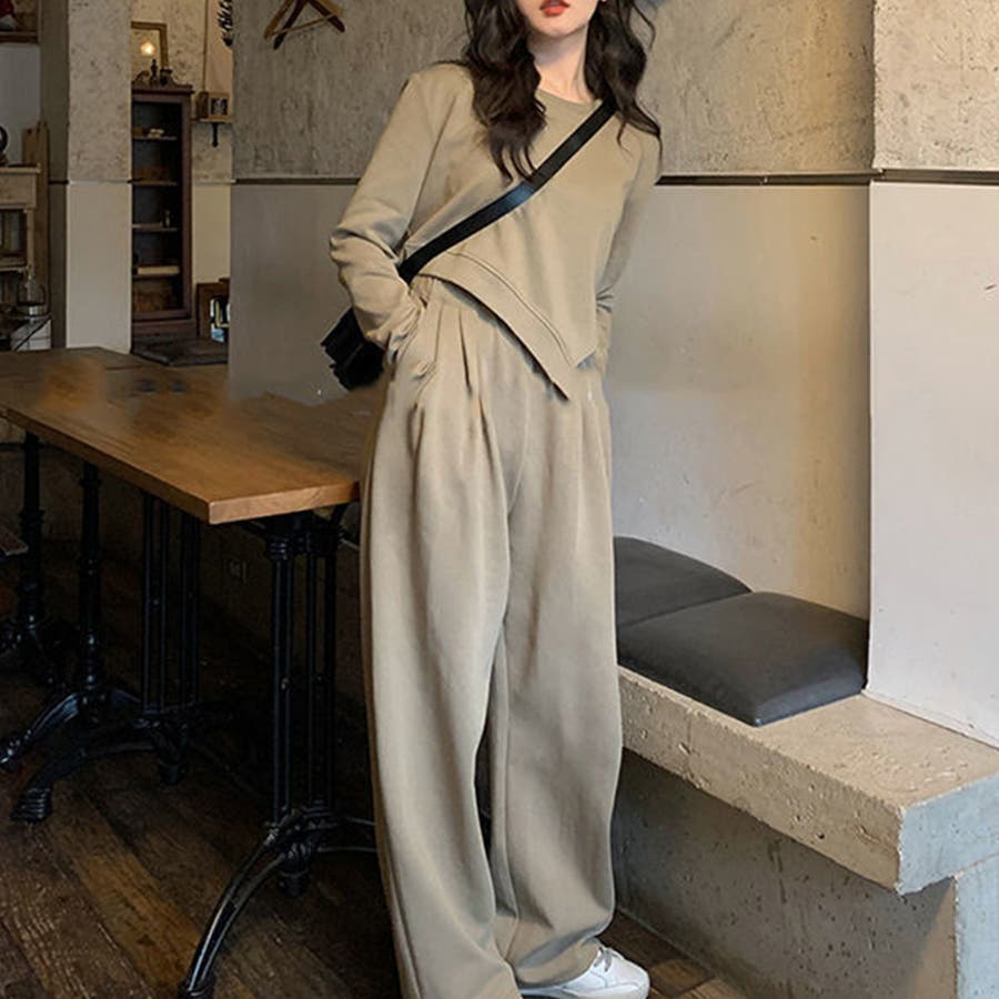 普段使いにぴったりの不規則パーカー&ロングパンツセットアップ