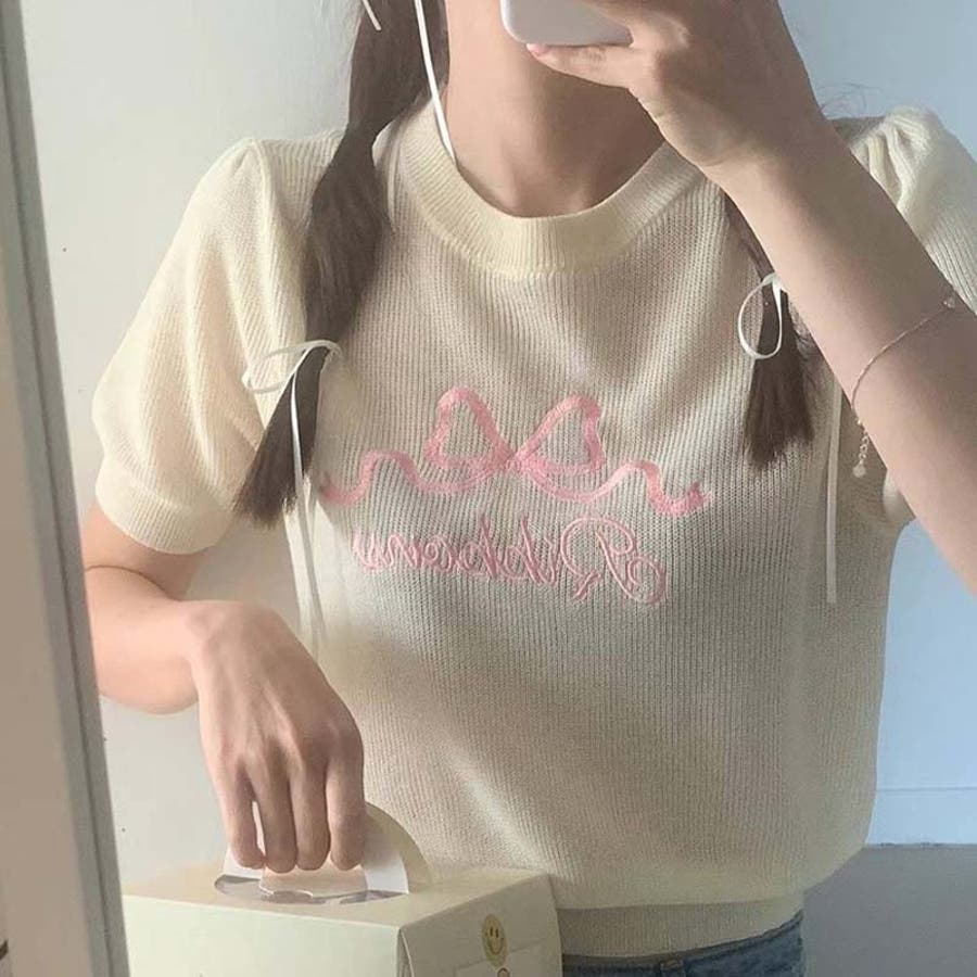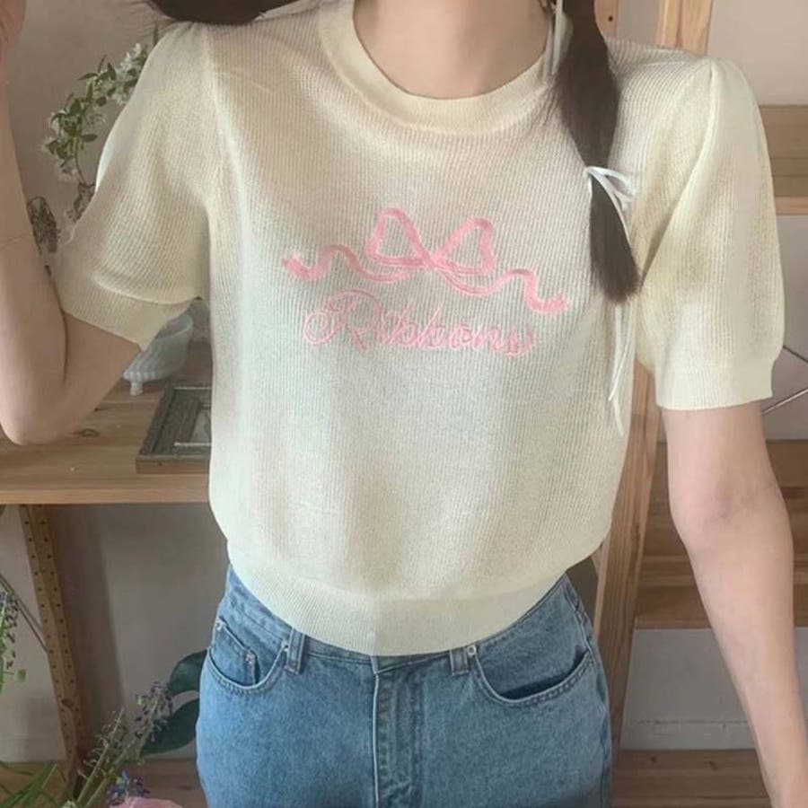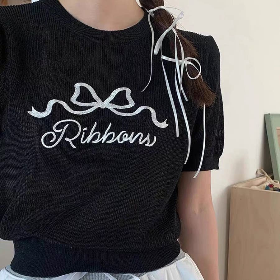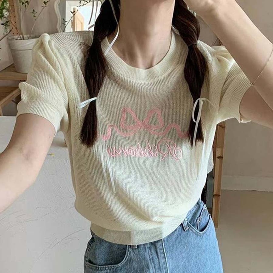 涼しい素材で通気性ある。蝶ネクタイと文字刺繍ニット半袖トップス