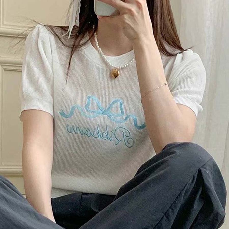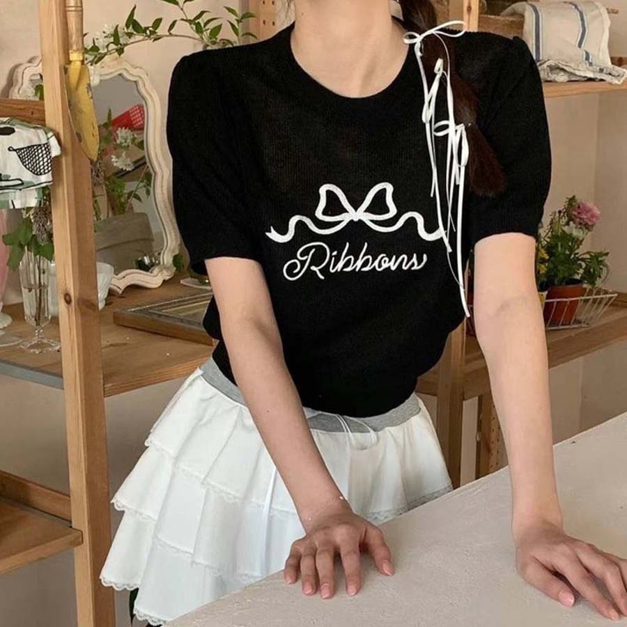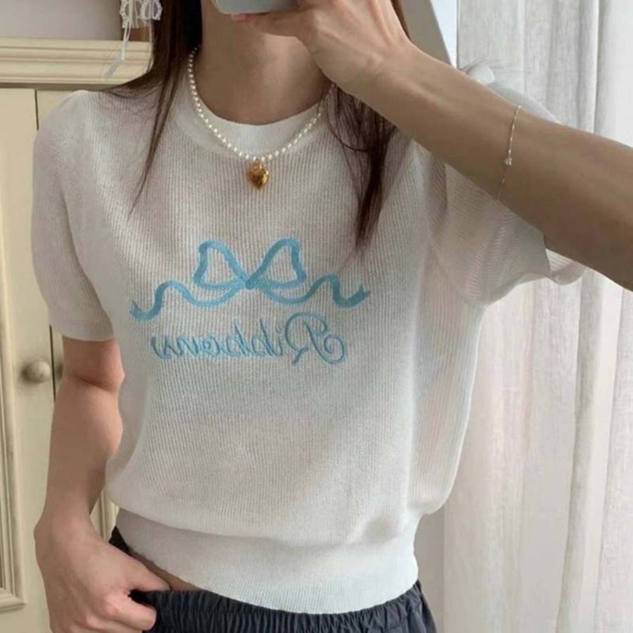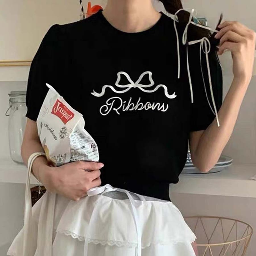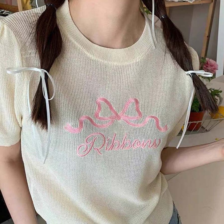 涼しい素材で通気性ある。蝶ネクタイと文字刺繍ニット半袖トップス