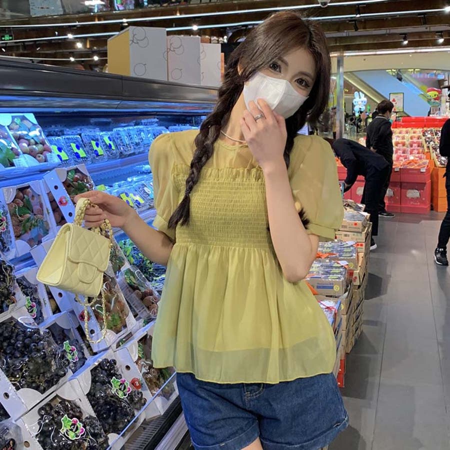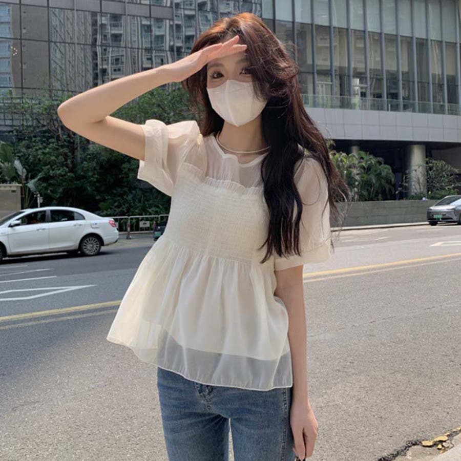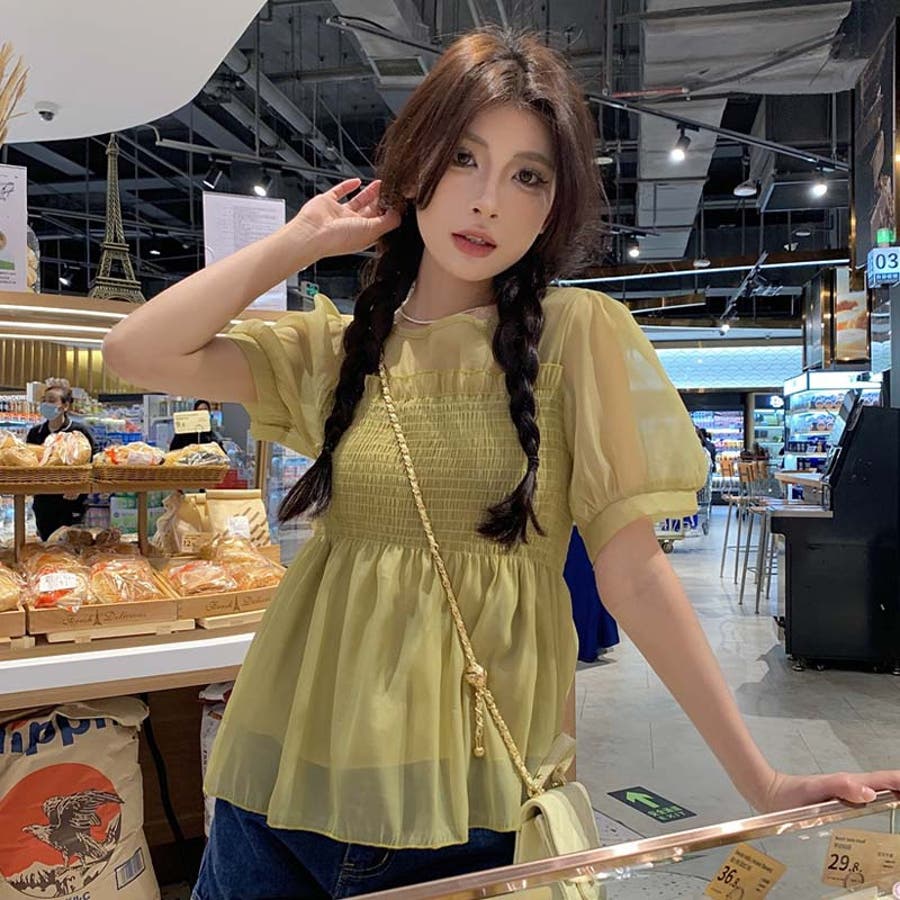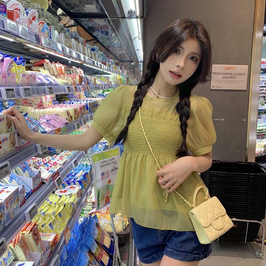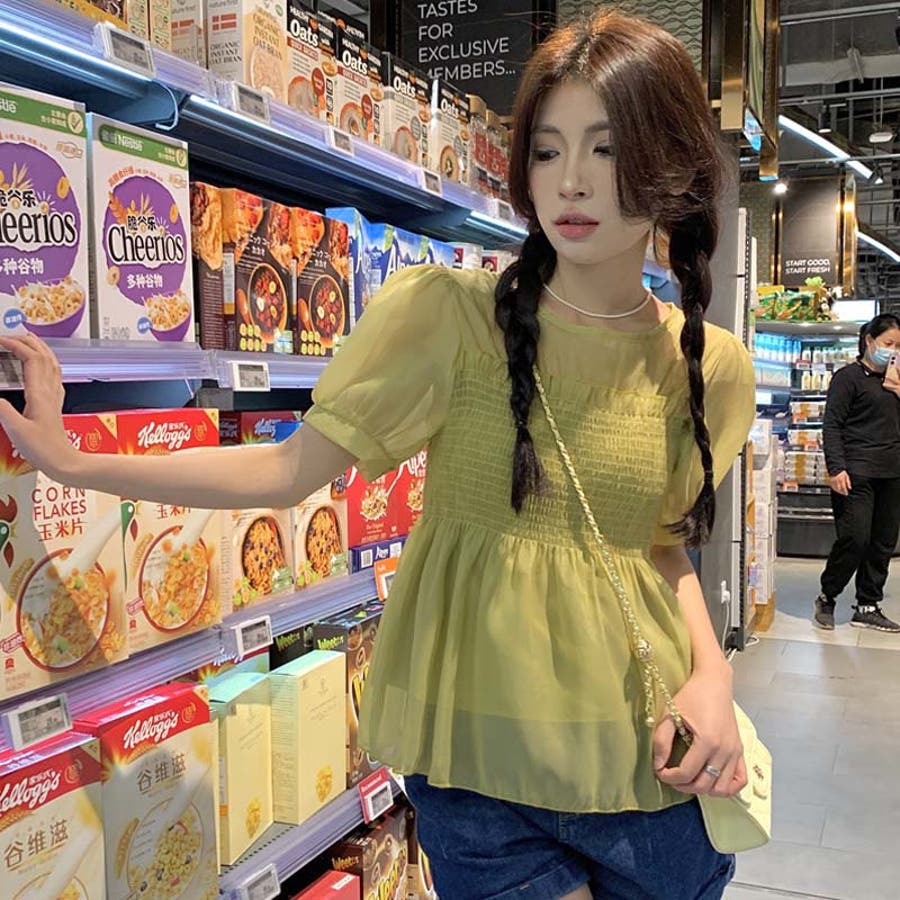 フレンチスイートスタイルのパフスリーブシフォンブラウス、夏の新作。スリム効果でお腹をカバーし、エレガントでスタイリッシュ。魅力的なコーディネートを簡単に実現。