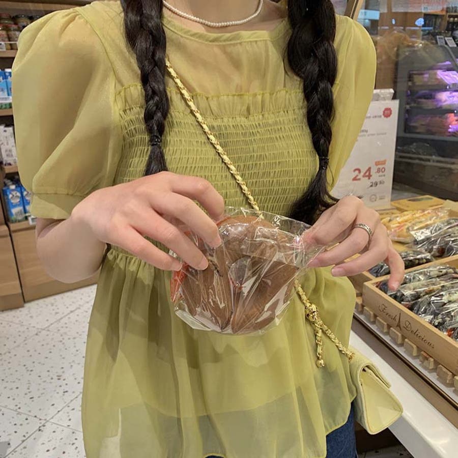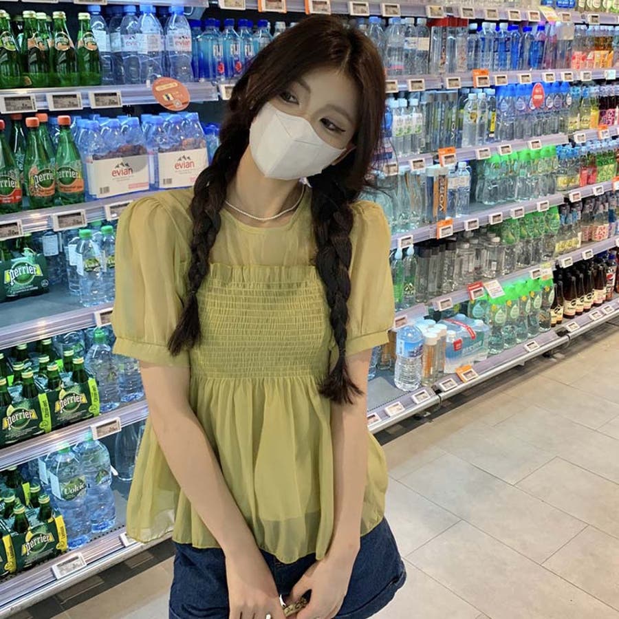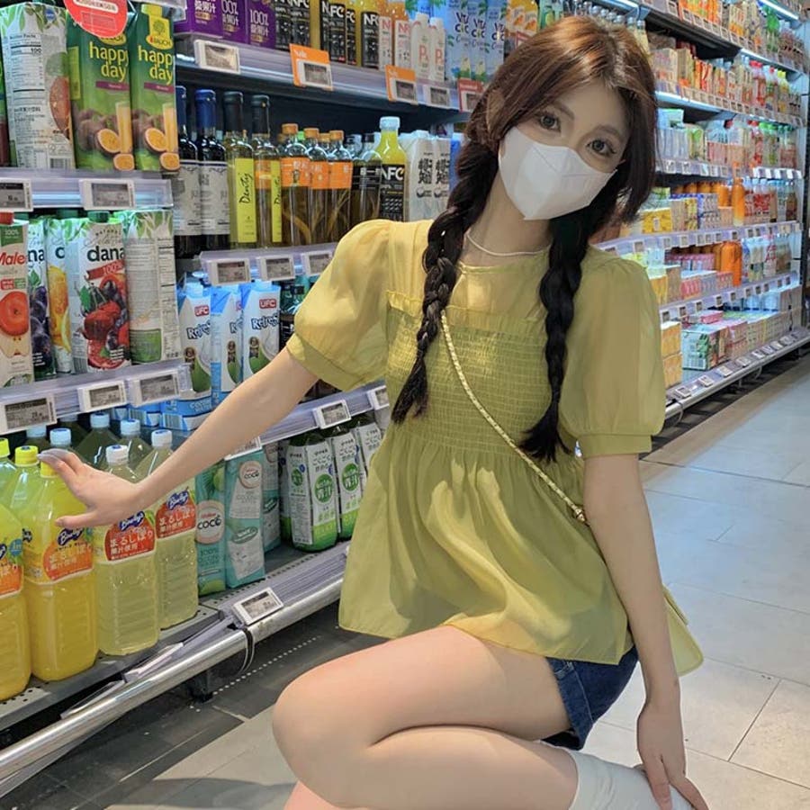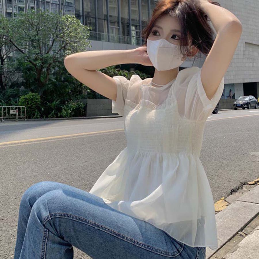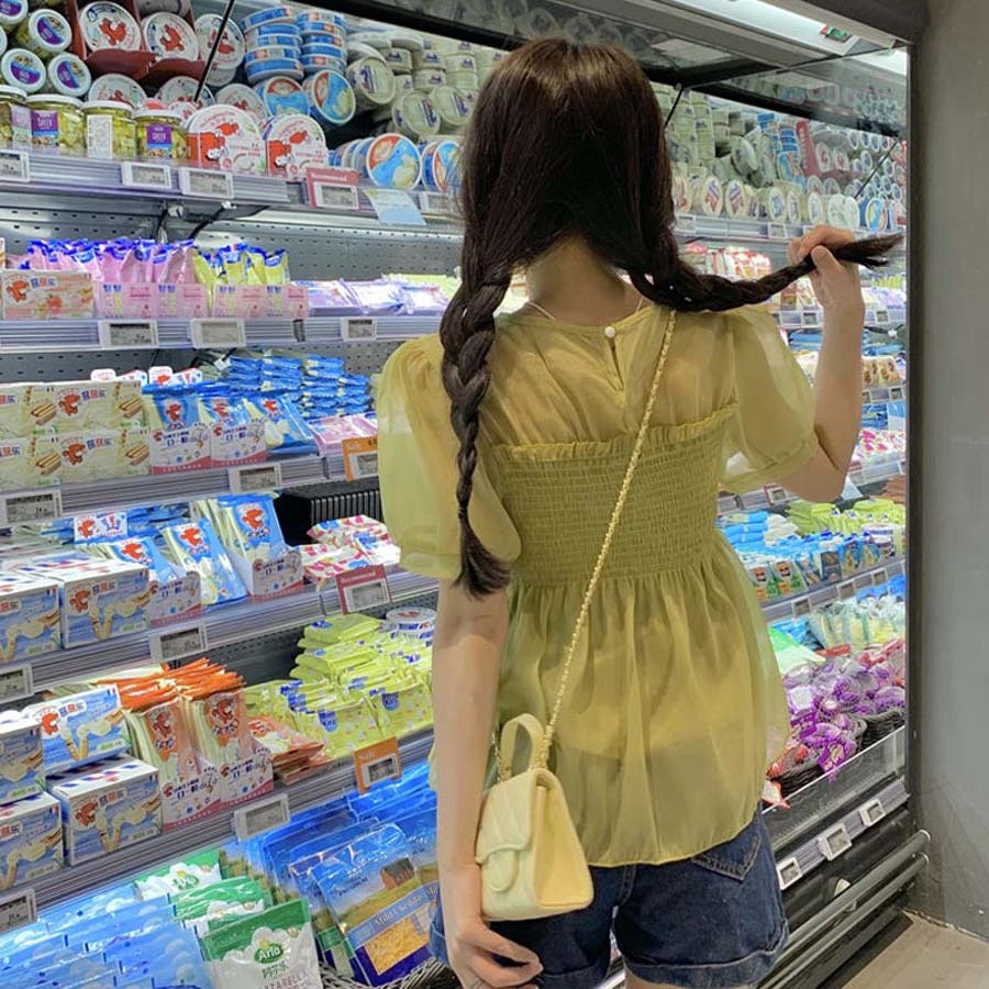 フレンチスイートスタイルのパフスリーブシフォンブラウス、夏の新作。スリム効果でお腹をカバーし、エレガントでスタイリッシュ。魅力的なコーディネートを簡単に実現。