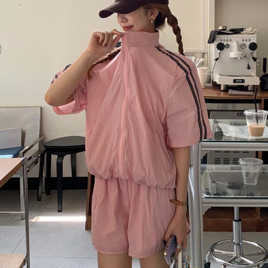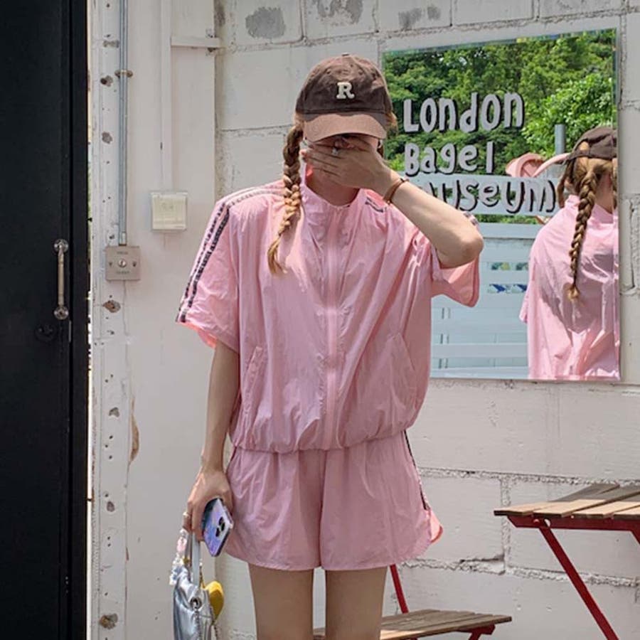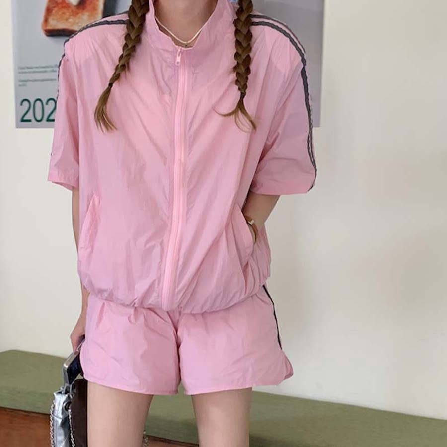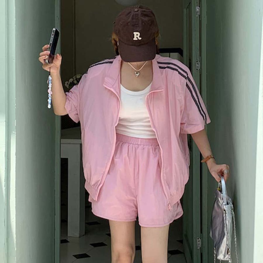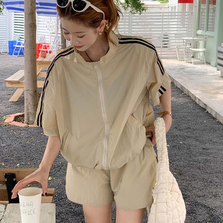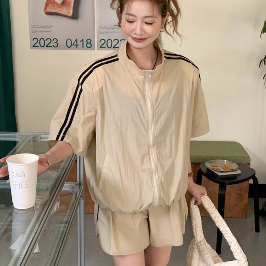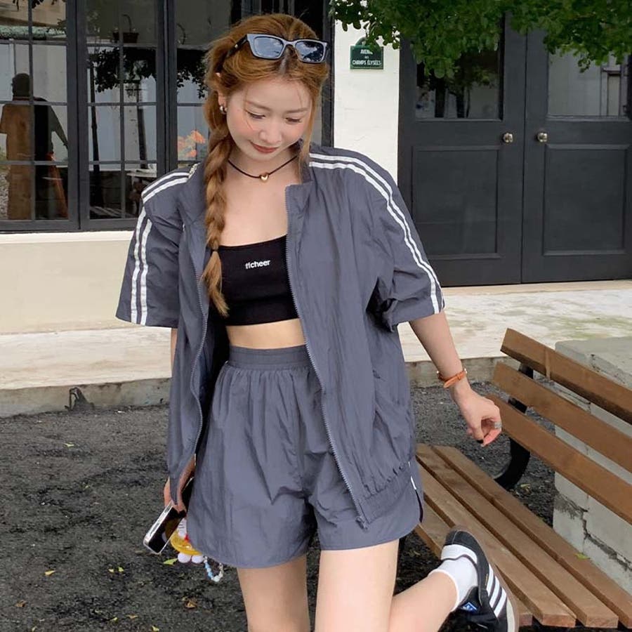【グレー】軽量で通気性に優れ。カジュアルスポーツ風短袖ジャケット+ショートパンツ2点セット…