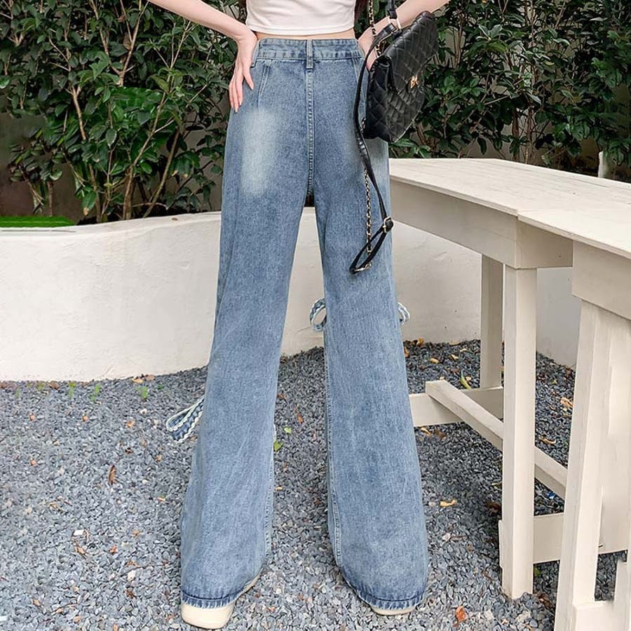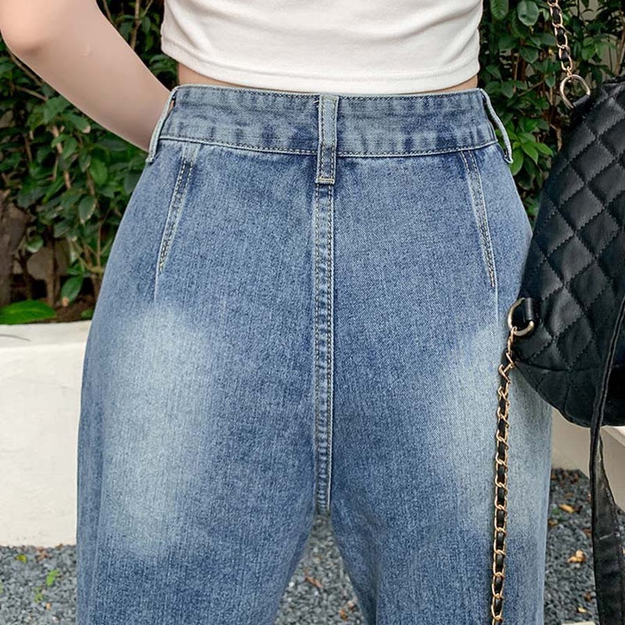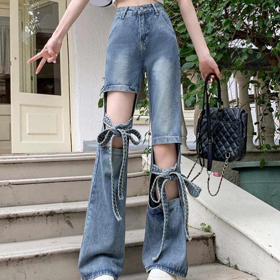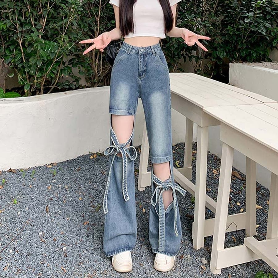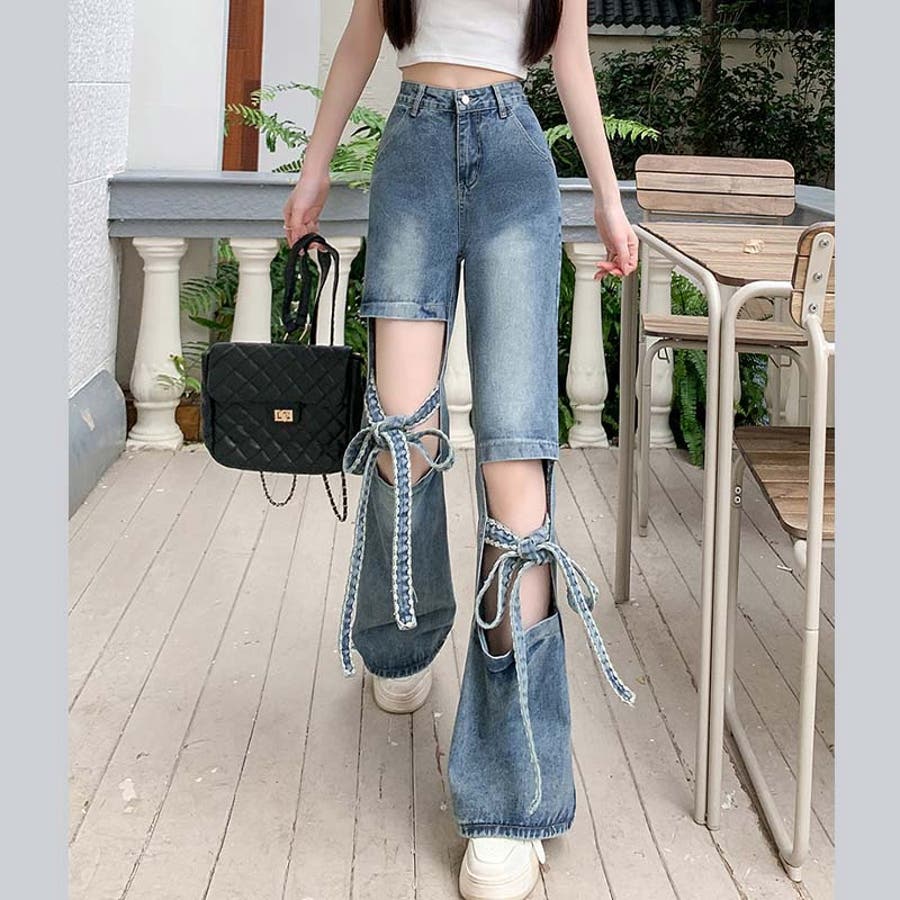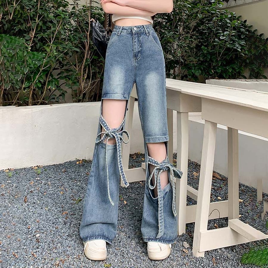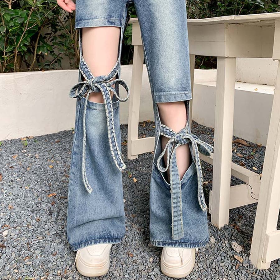 カットアウトとダメージ要素が個性と魅力をプラス。リボン付きのワイドレッグデニムパ…