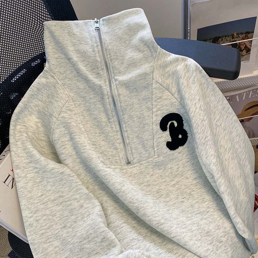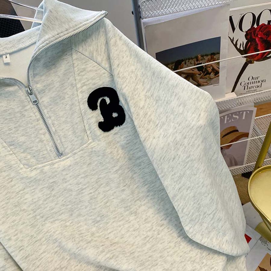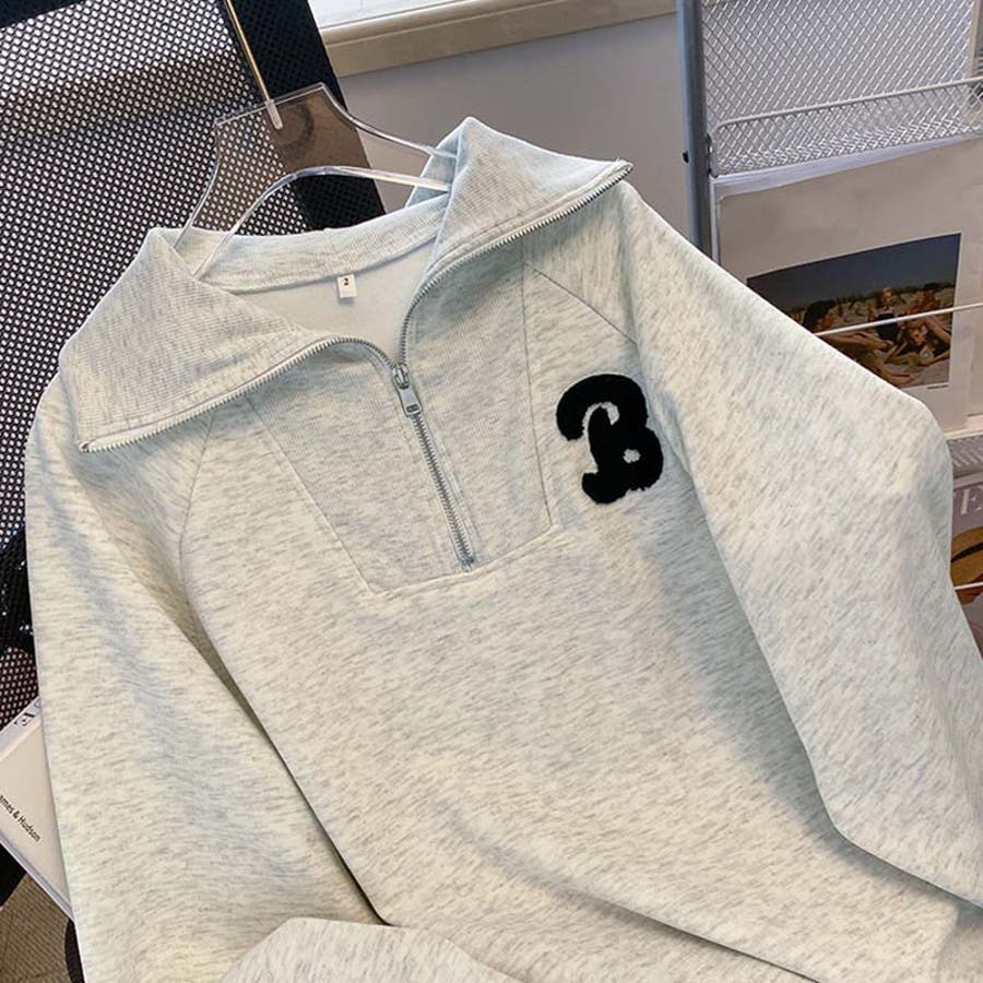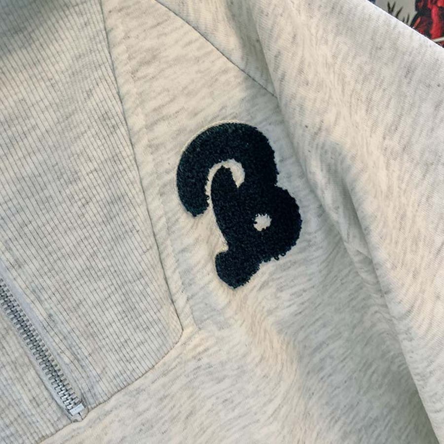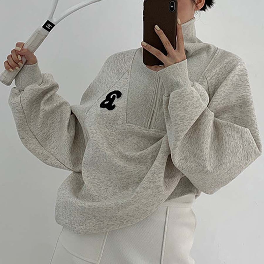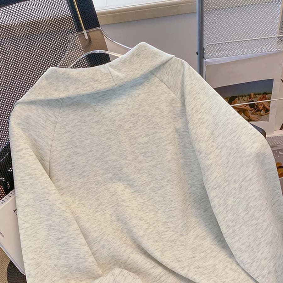 ハーフジップの小さな襟のデザインが魅力的。パッチ付きのグレーの薄手コットン長袖ス…
