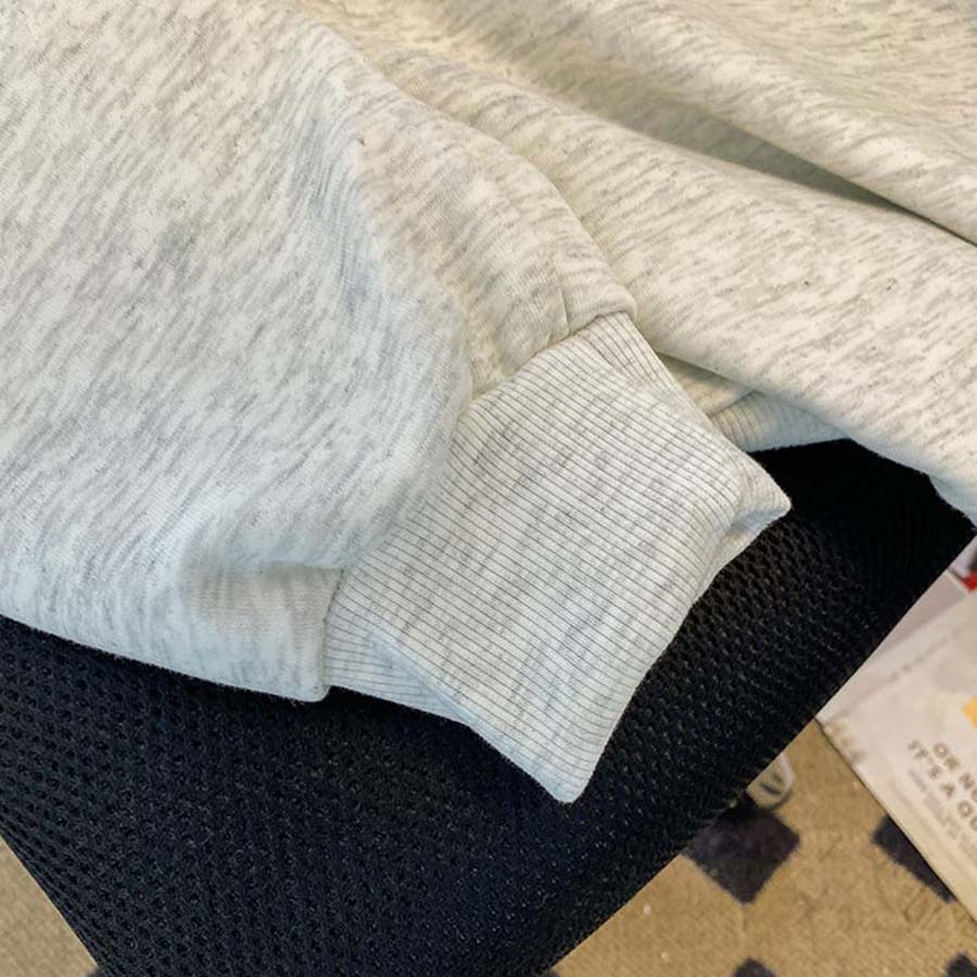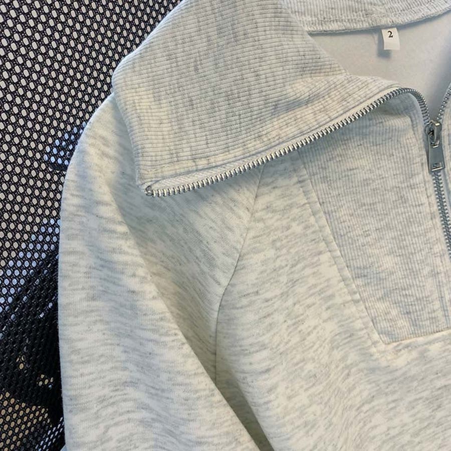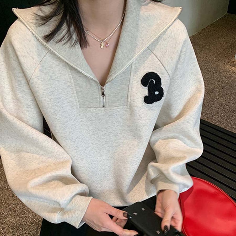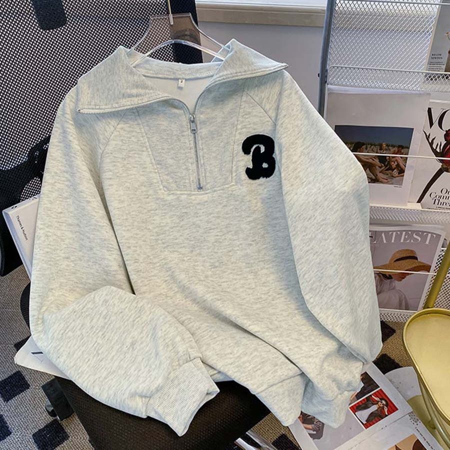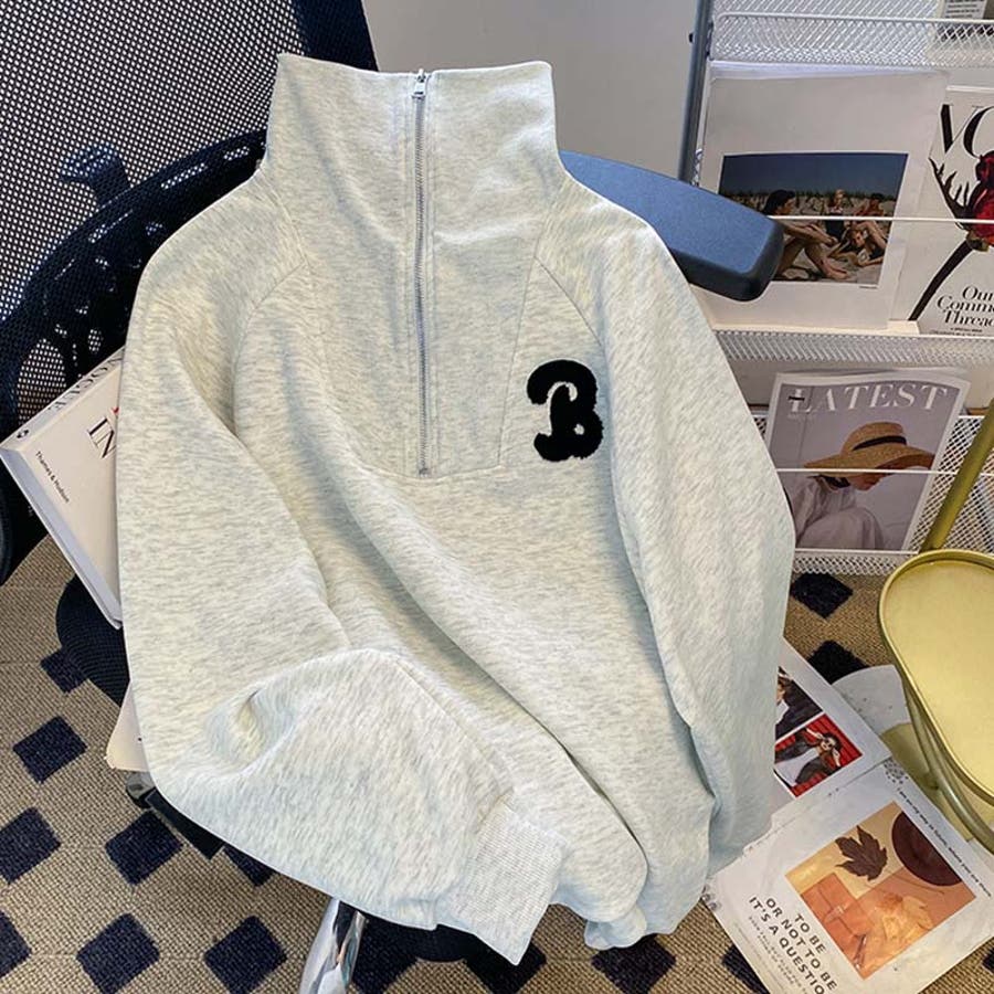 ハーフジップの小さな襟のデザインが魅力的。パッチ付きのグレーの薄手コットン長袖ス…