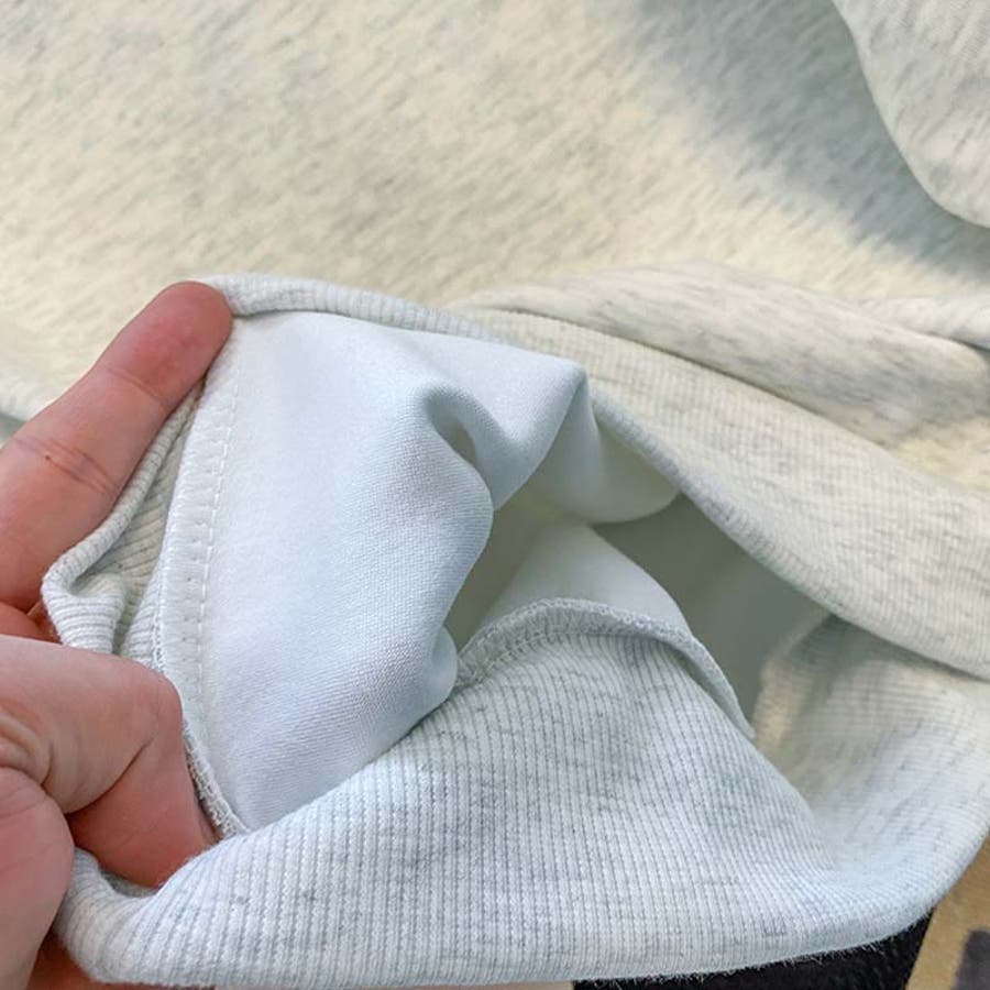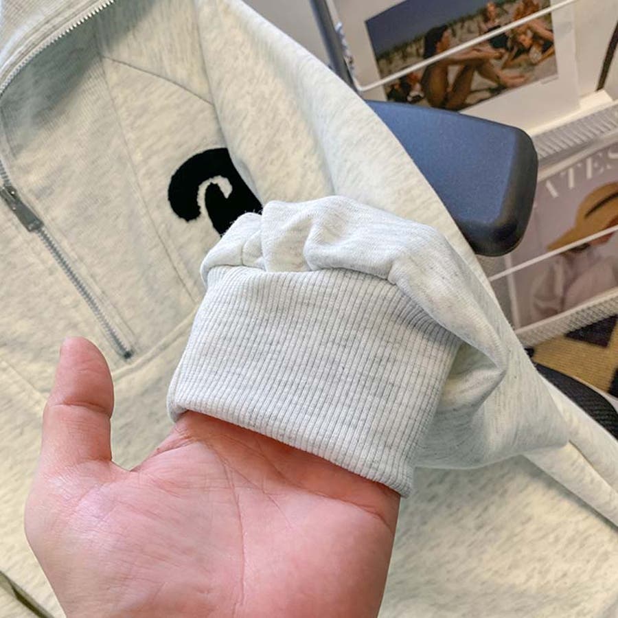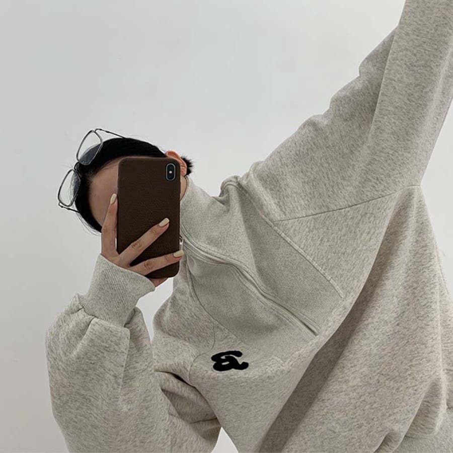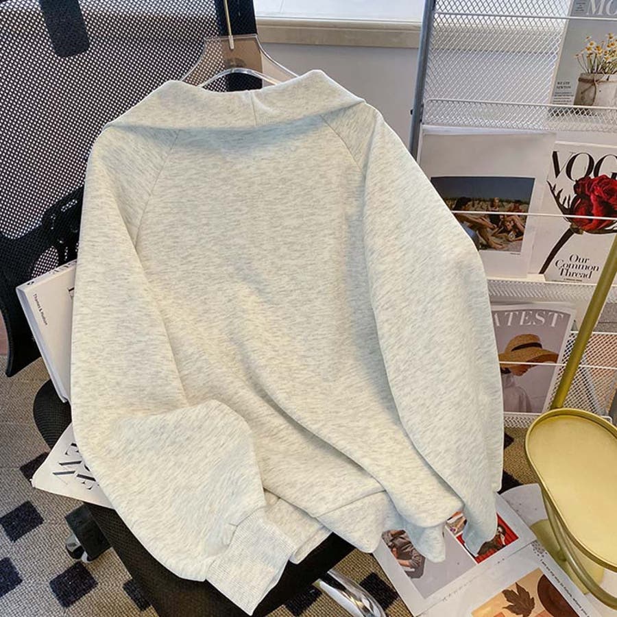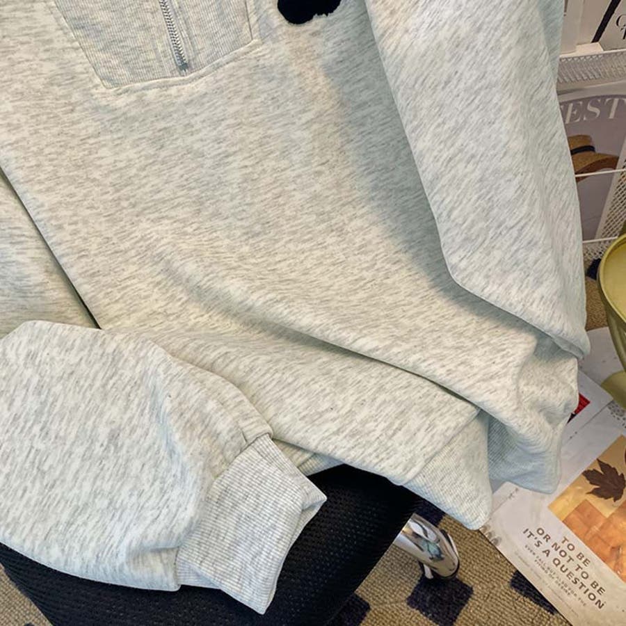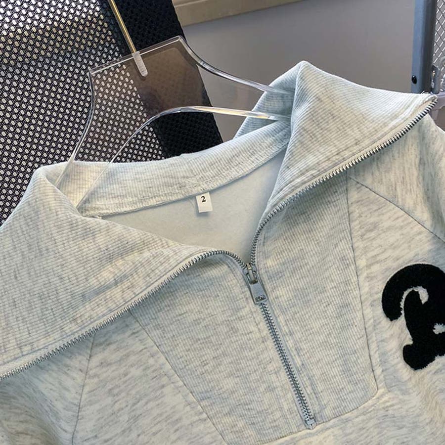 ハーフジップの小さな襟のデザインが魅力的。パッチ付きのグレーの薄手コットン長袖ス…