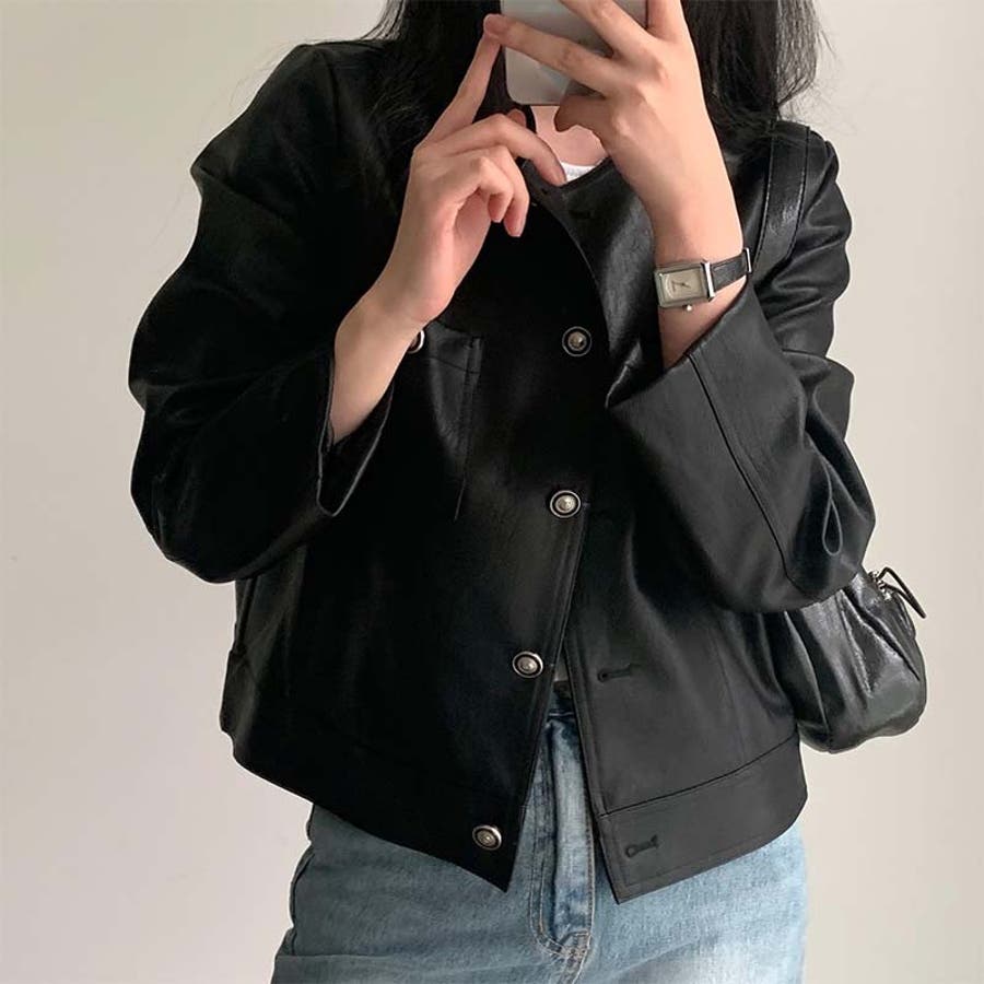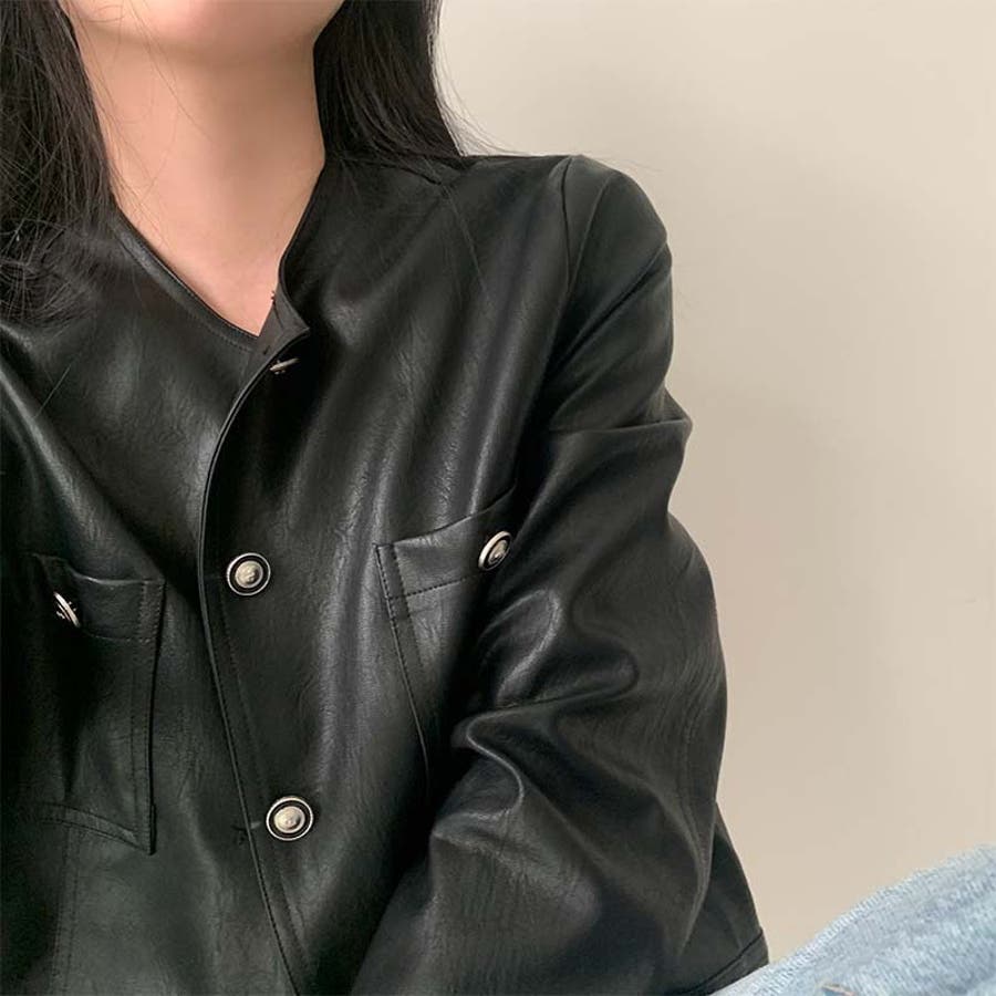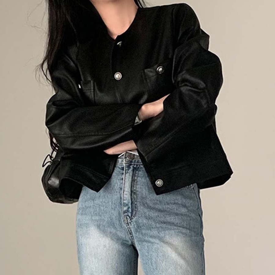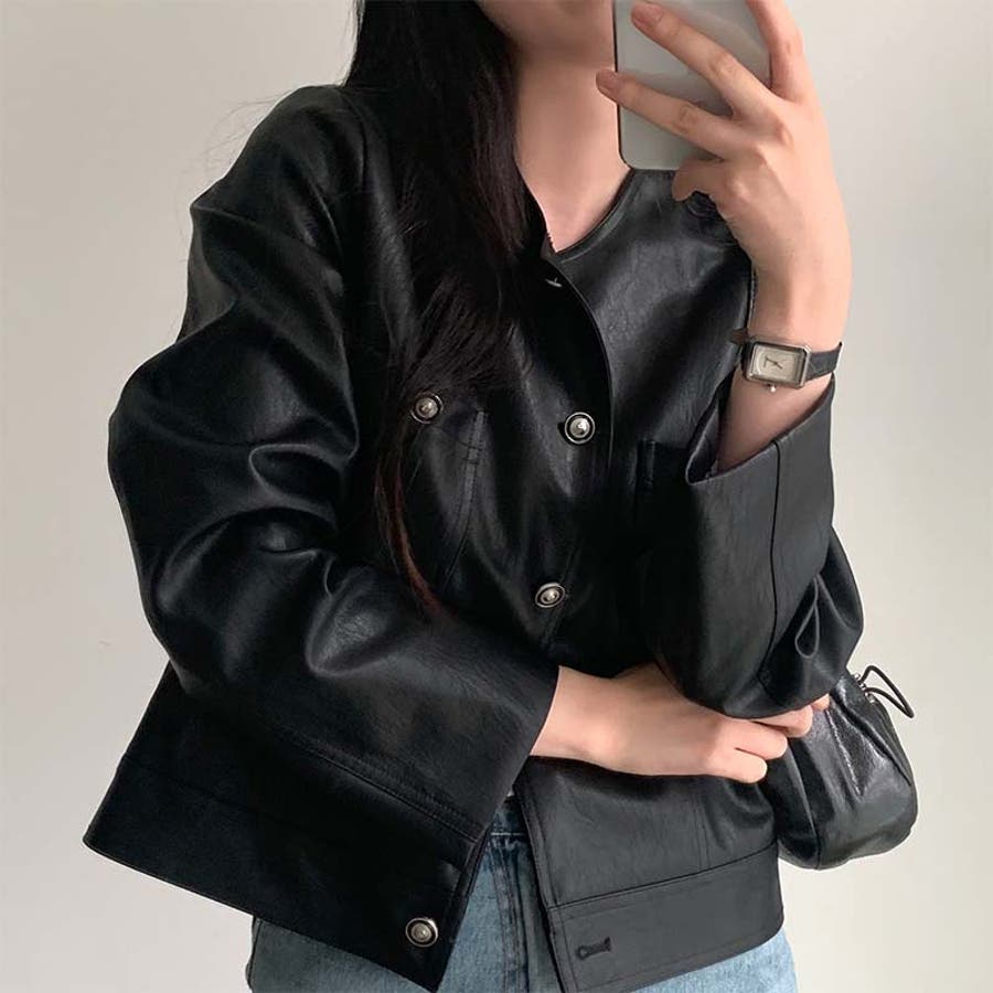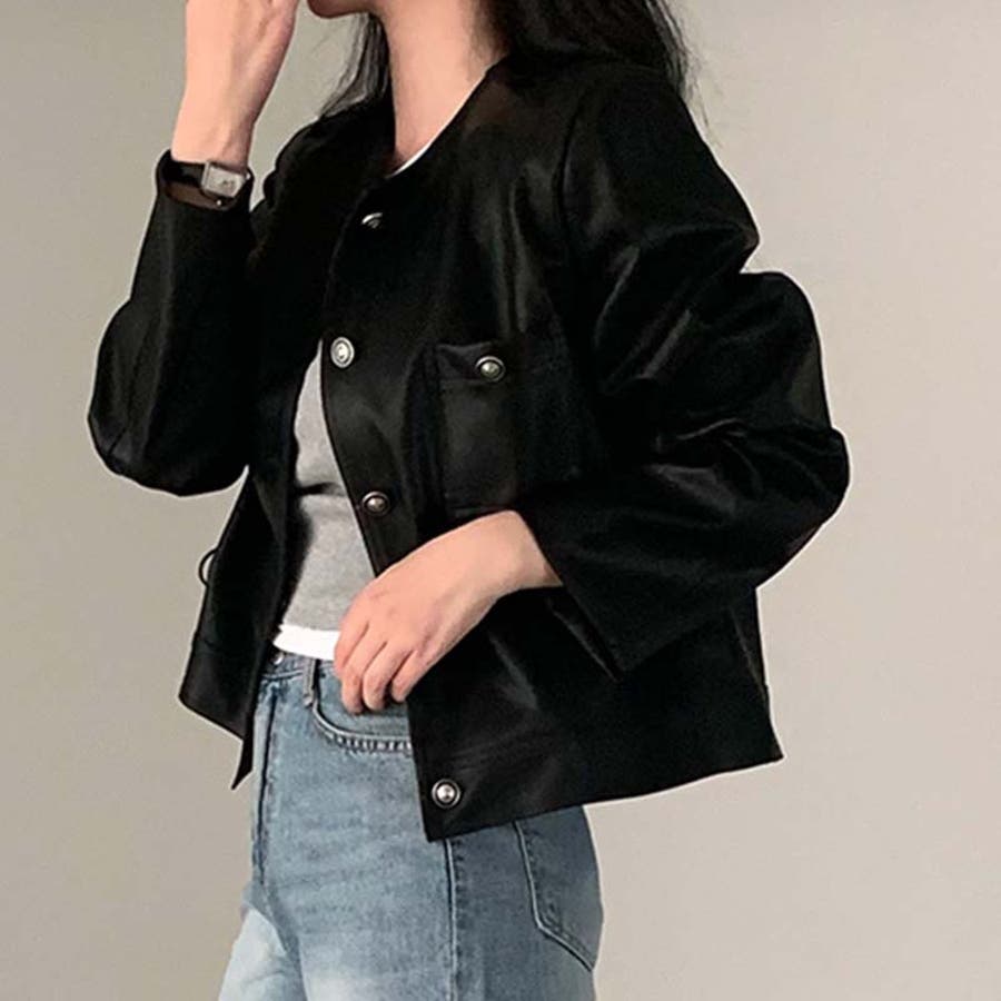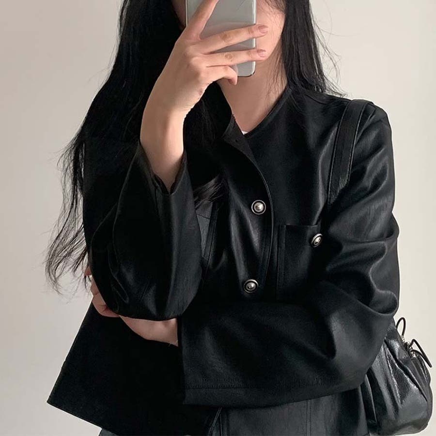 【SHOPLIST限定】スタイルアップ効果。クルーネックの黒いPUレザーショート…