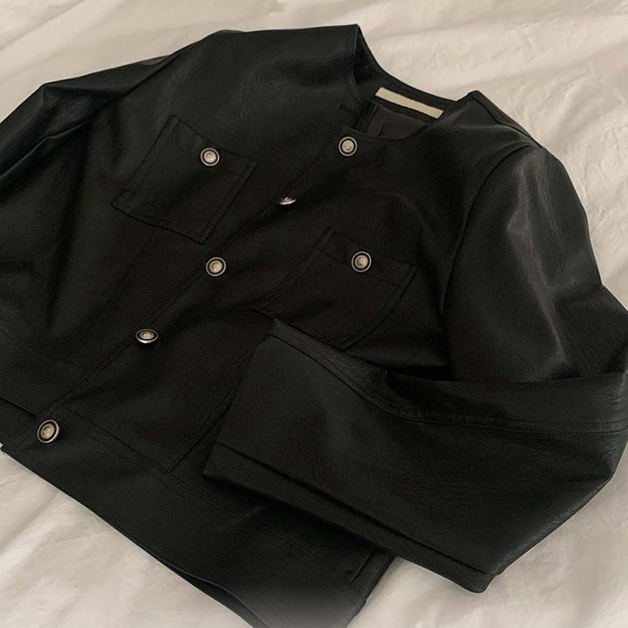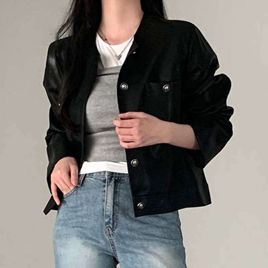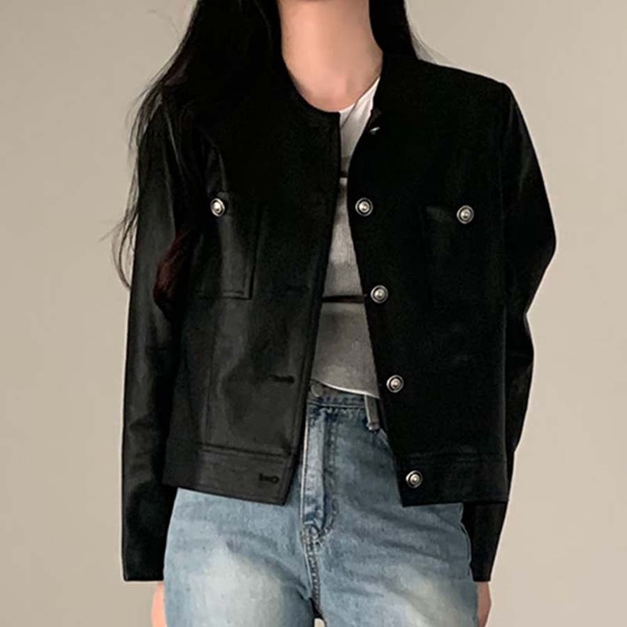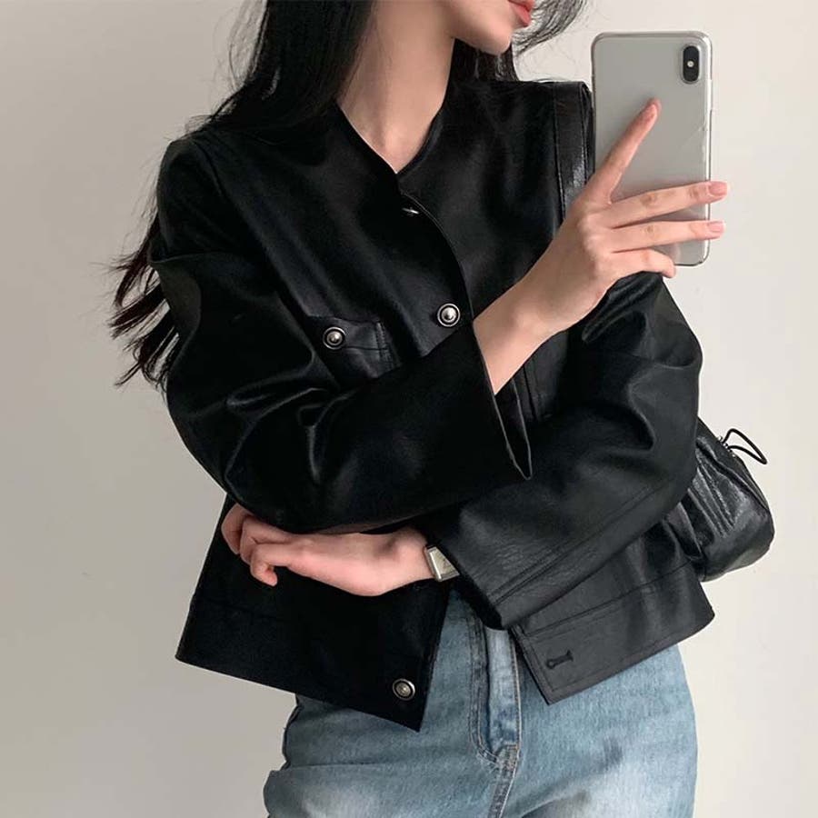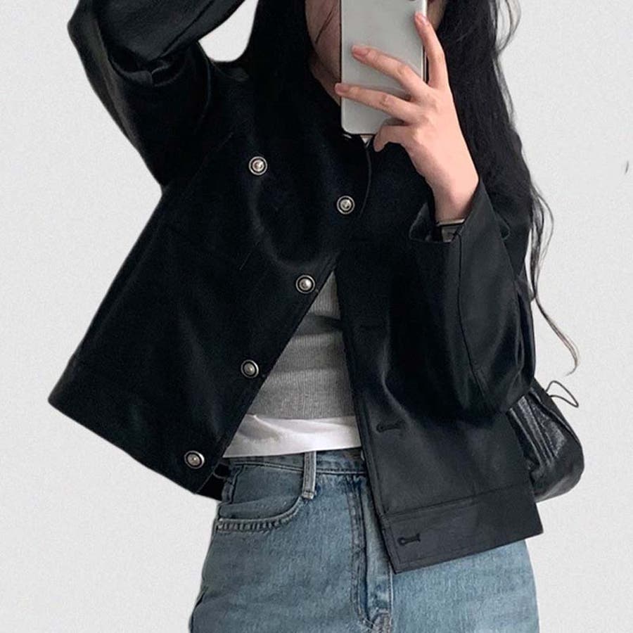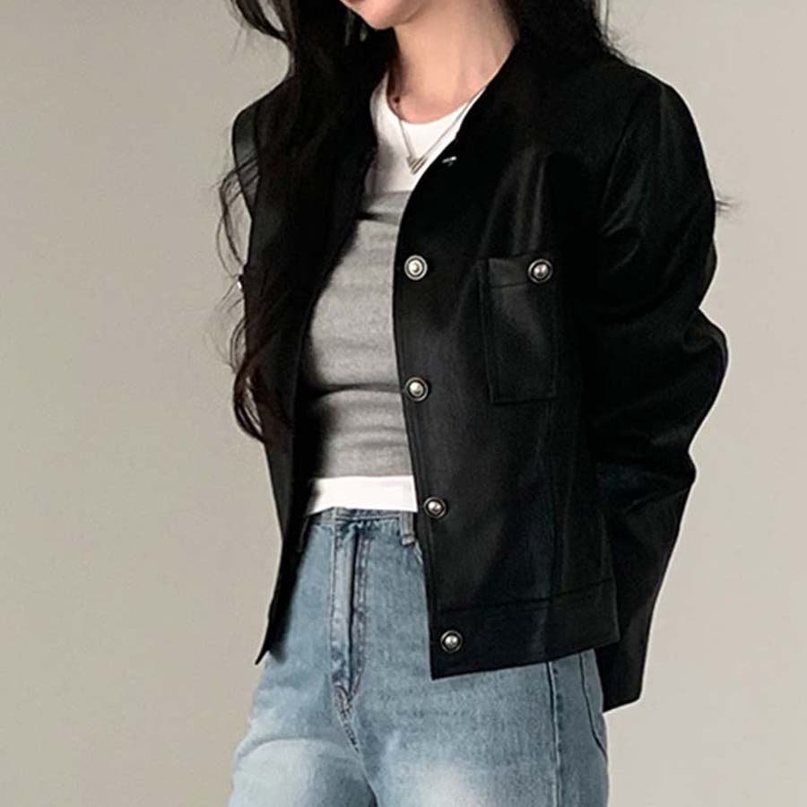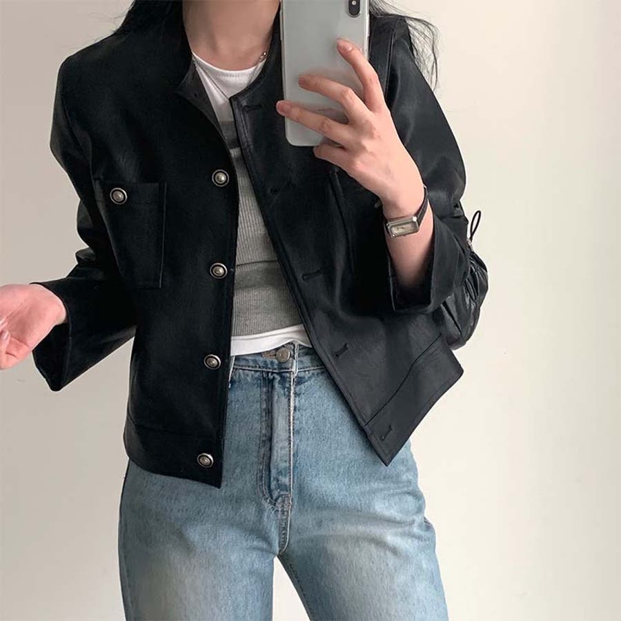 【SHOPLIST限定】スタイルアップ効果。クルーネックの黒いPUレザーショート…