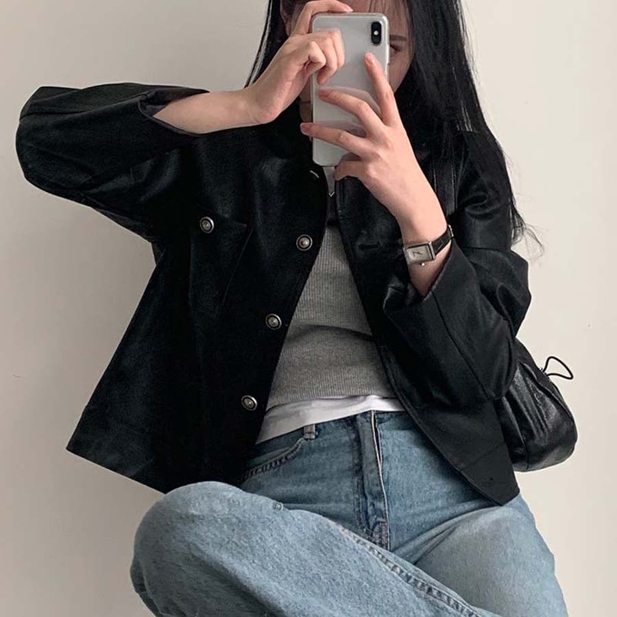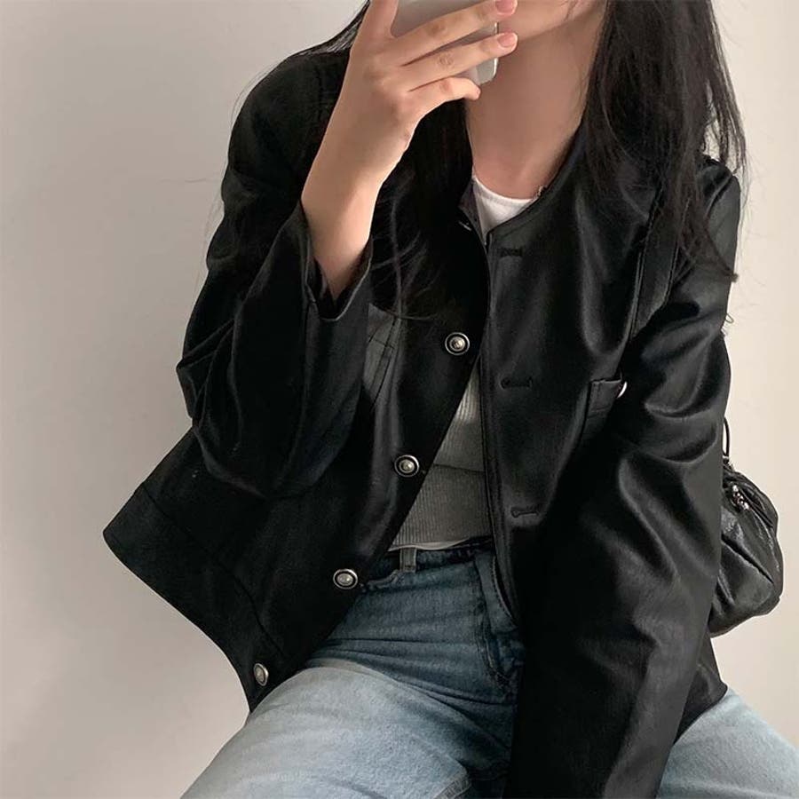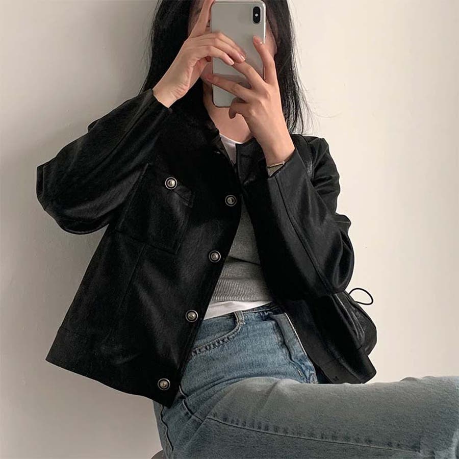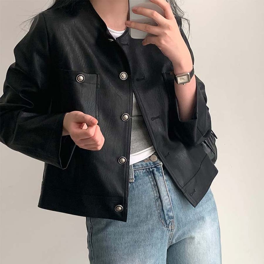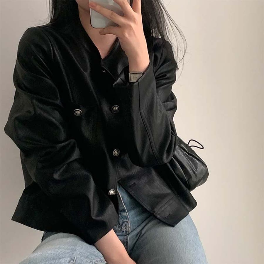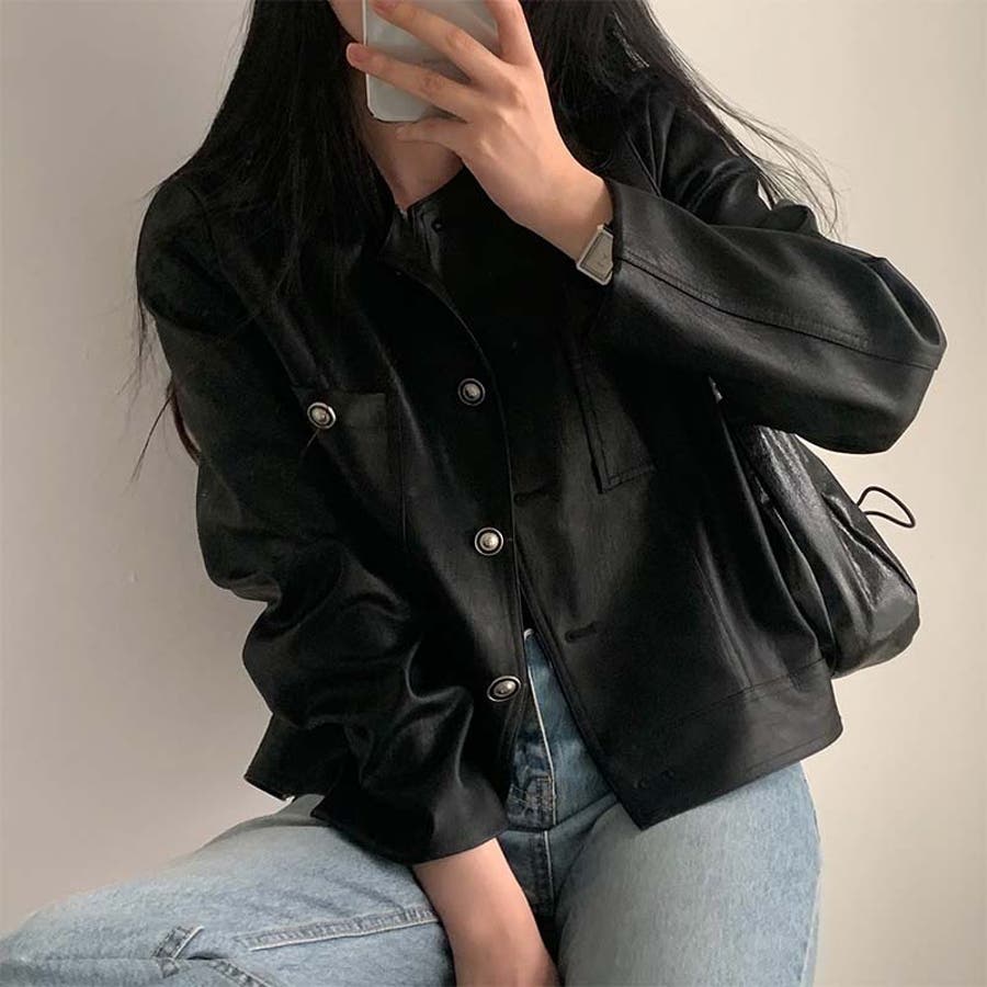 【SHOPLIST限定】スタイルアップ効果。クルーネックの黒いPUレザーショート…