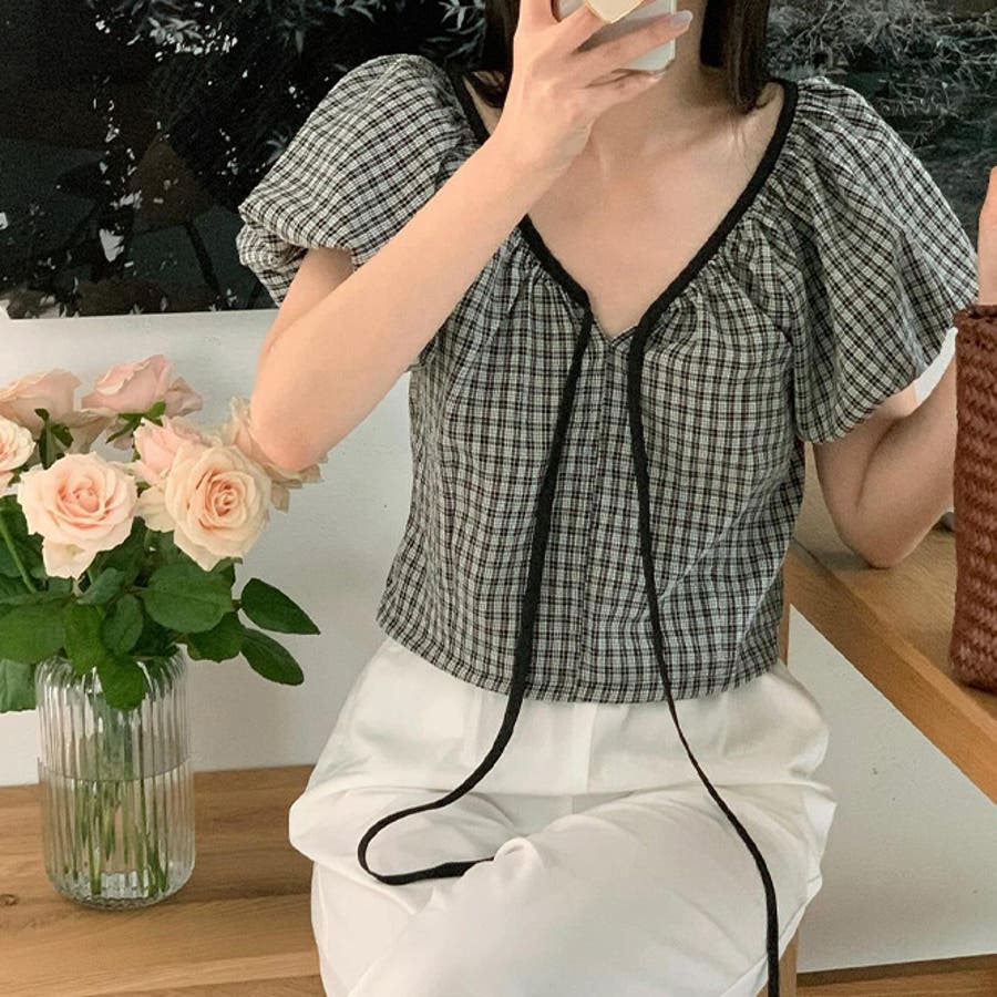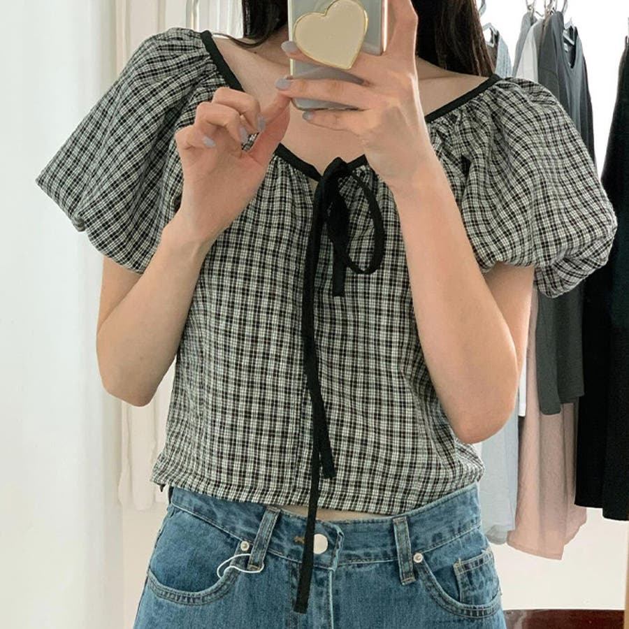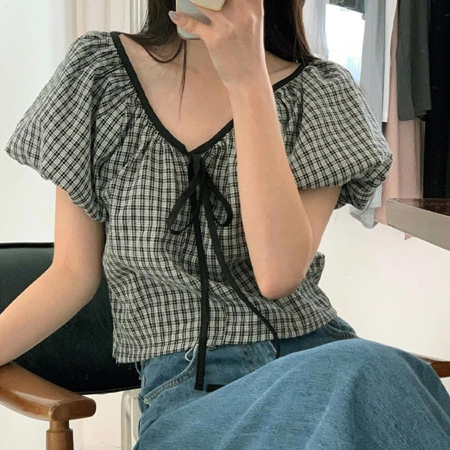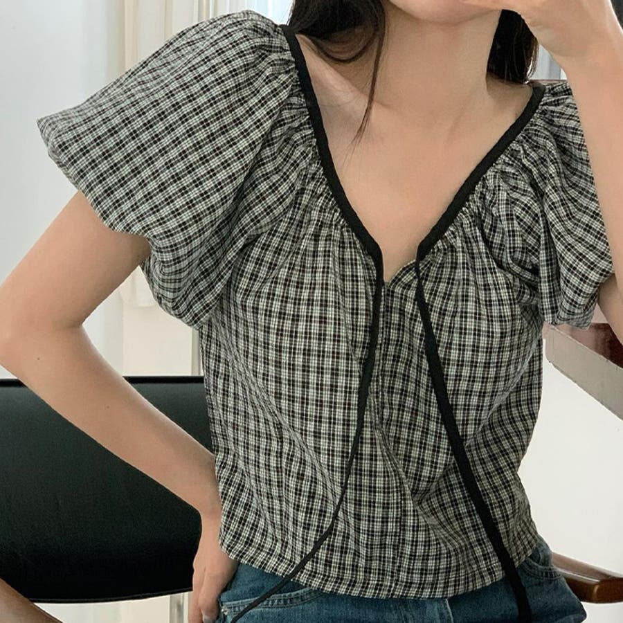 ミレニアル学園風 ゆるカワコーデ☆チェック Vネック リボンタイ シャツ